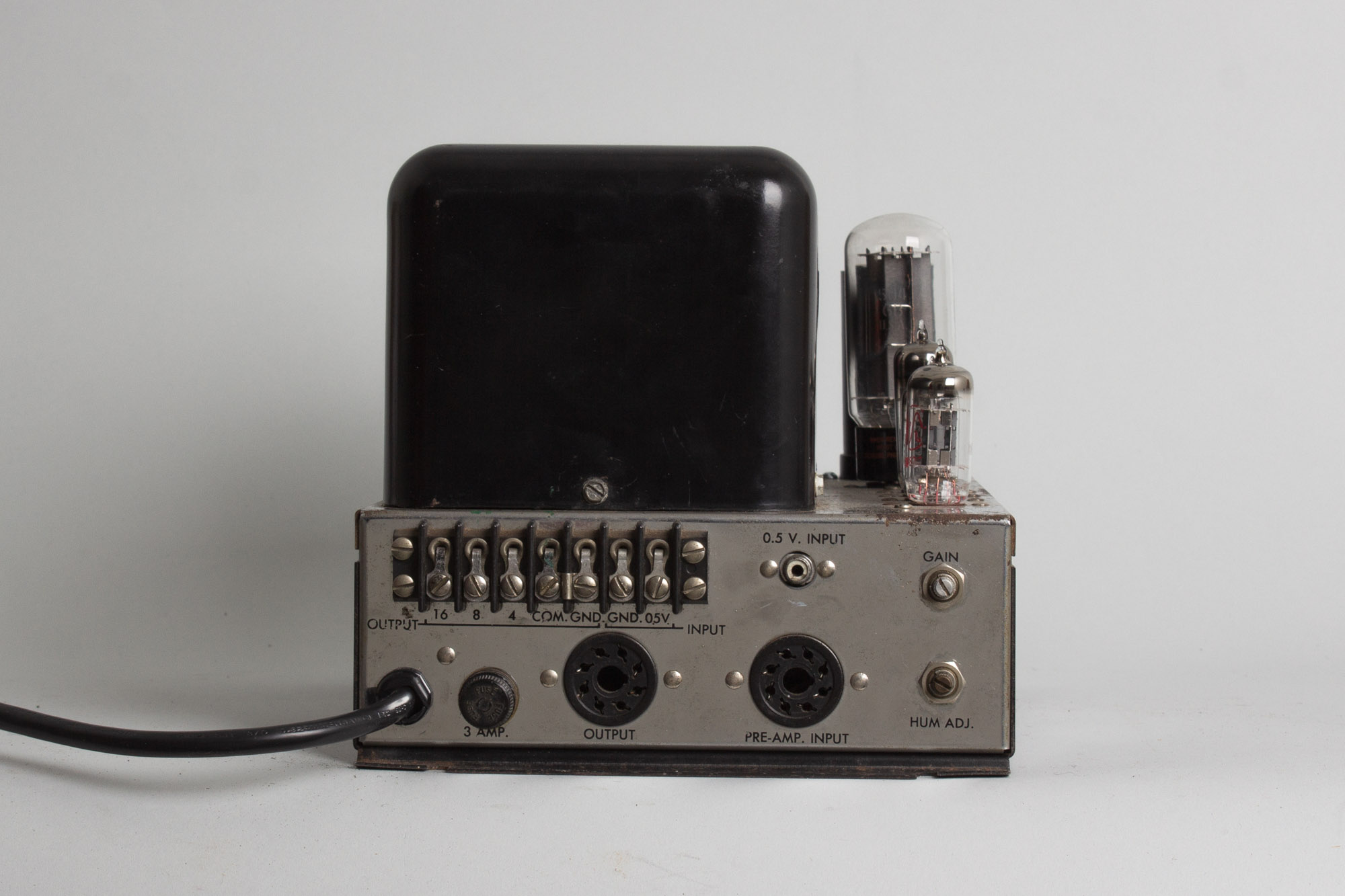 This particular amplifier bears the serial number 18300, which, alongside dateable components suggest a manufacture year of 1967. True to its name, the MC-30 is a mono-block 30-watt amplifier. It has a simple set of controls, including gain and hum adjust, alongside a preamp input and a 0.5V rca input. The speaker outputs accommodate impedances of 16, 8 and 4 ohm. A pair of 6L6GC output tubes yield around 30 watts of power through the company's hand-wound unity coupled output transformers.