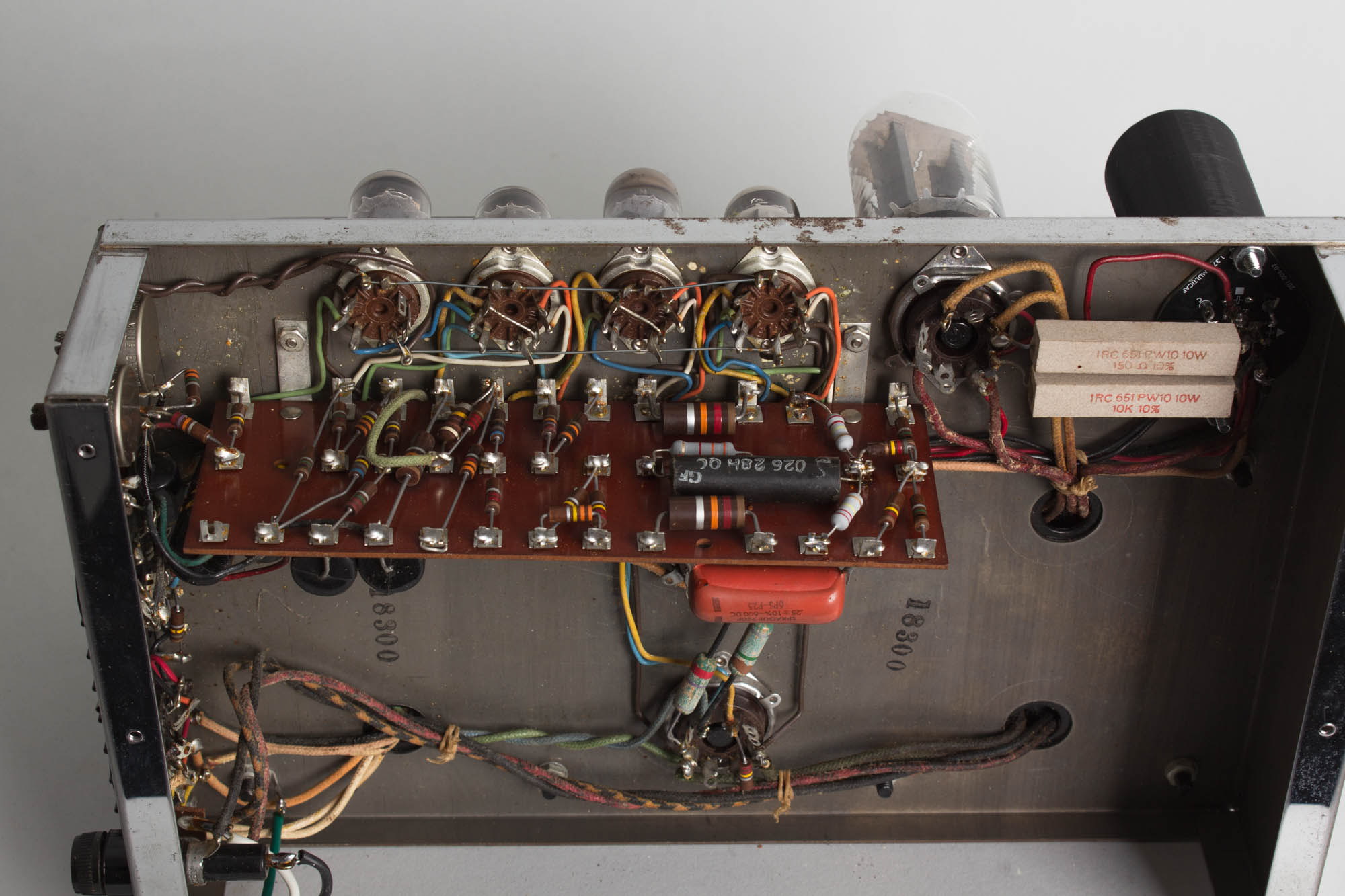 Cosmetically, this amplifier is in good shape for its age, showing only minor-to-moderate wear overall. The chrome-plated chassis and panel surfaces show minor tarnishing but much of the stenciled lettering is still nicely intact. There is some minor corrosive spotting on the top of the chassis. Transformer covers are undented and only show typical wear and scuffing.