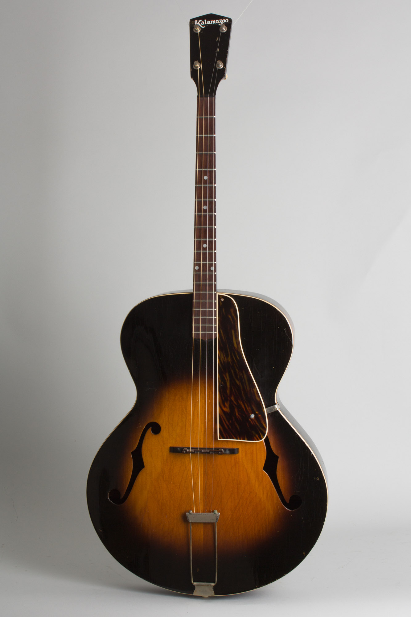 Kalamazoo KTG-21 Model Arch Top Acoustic Tenor Guitar (1935), made in Kalamazoo, Michigan, serial # 291A, sunburst lacquer finish, mahogany back and sides, spruce top; mahogany neck with rosewood fingerboard, black gig bag case.