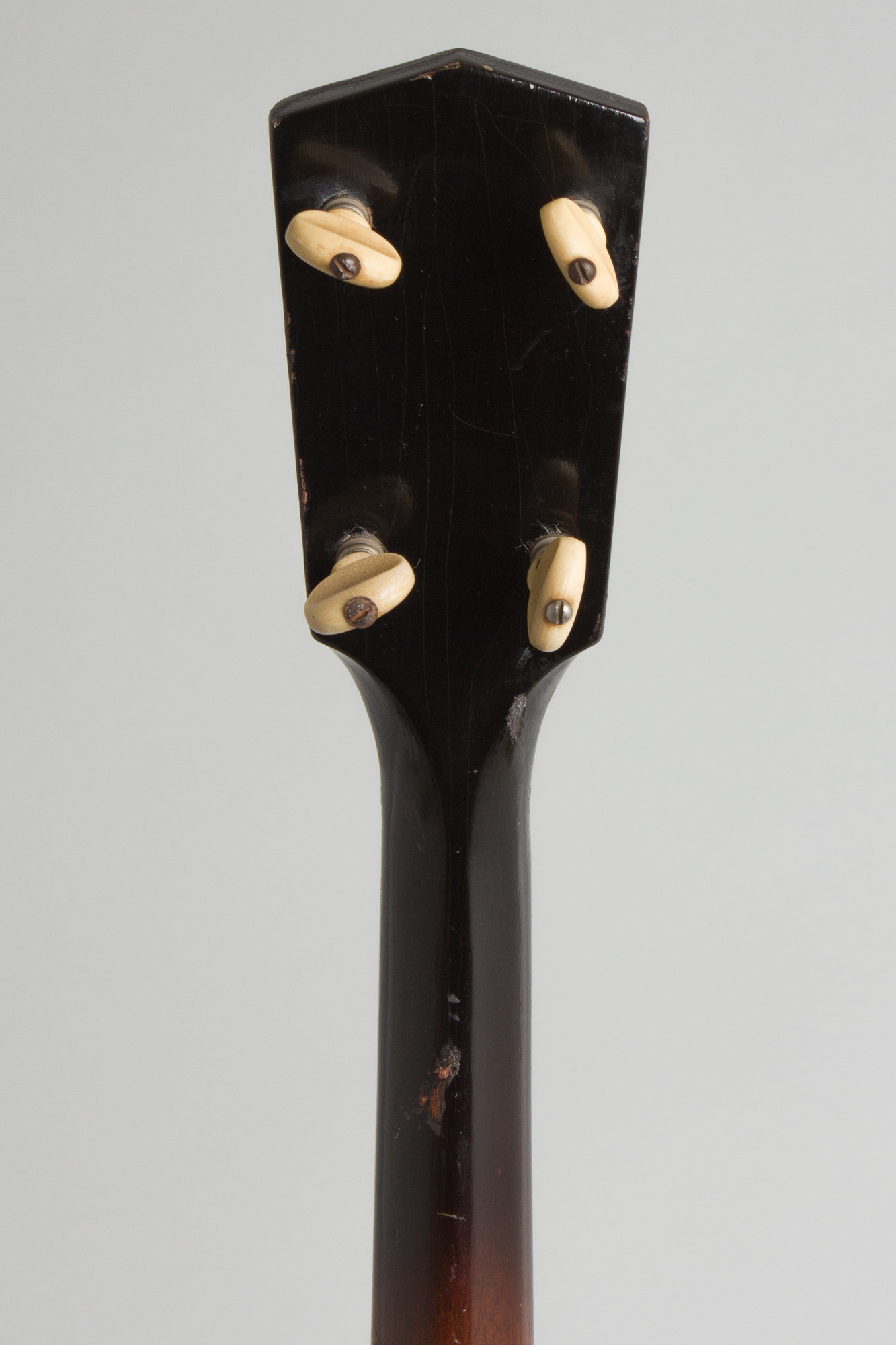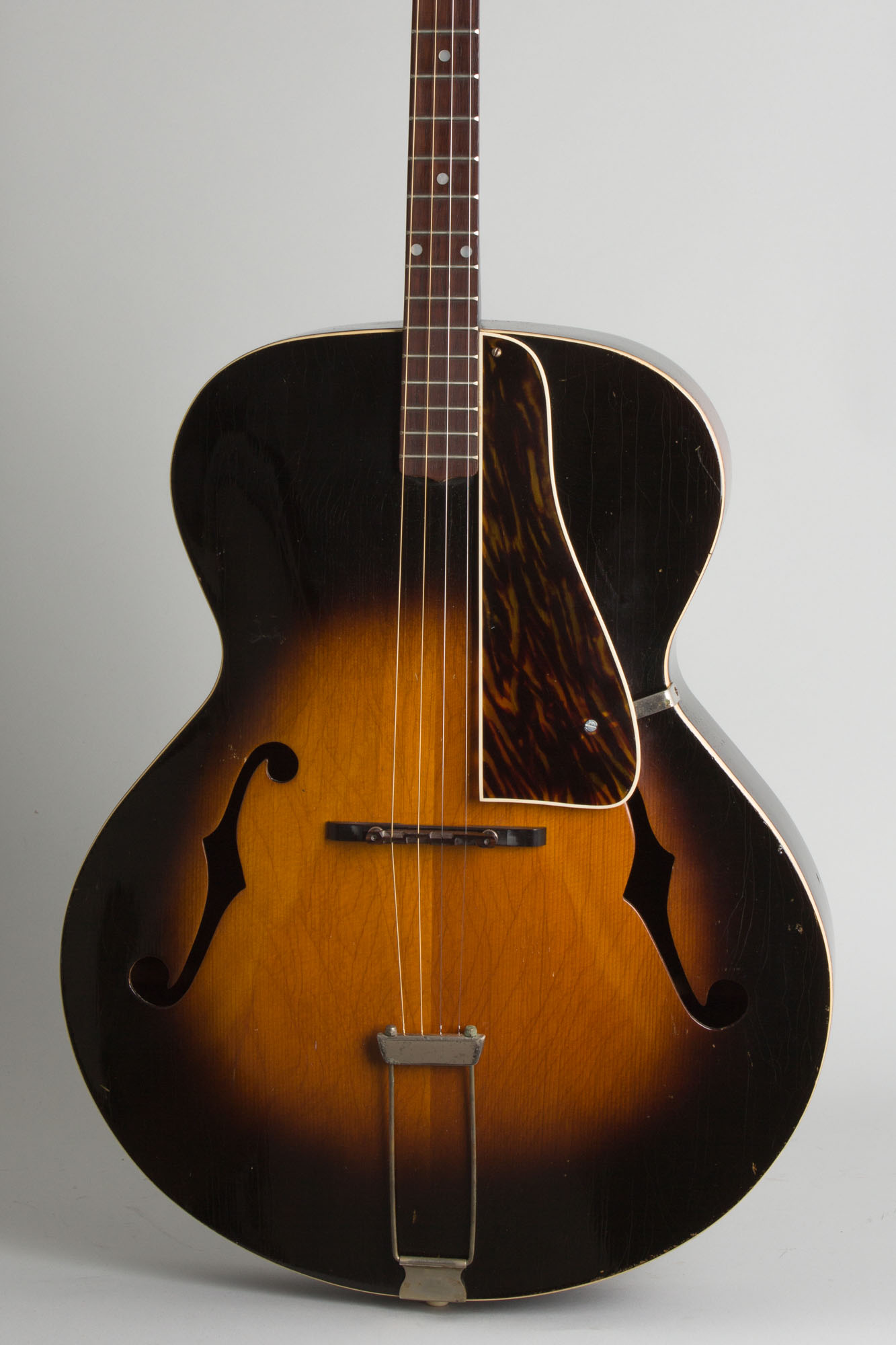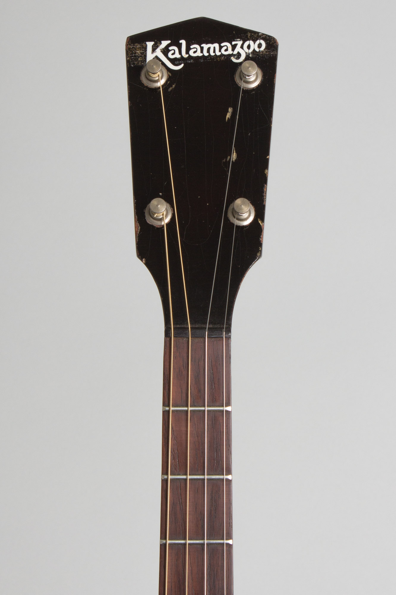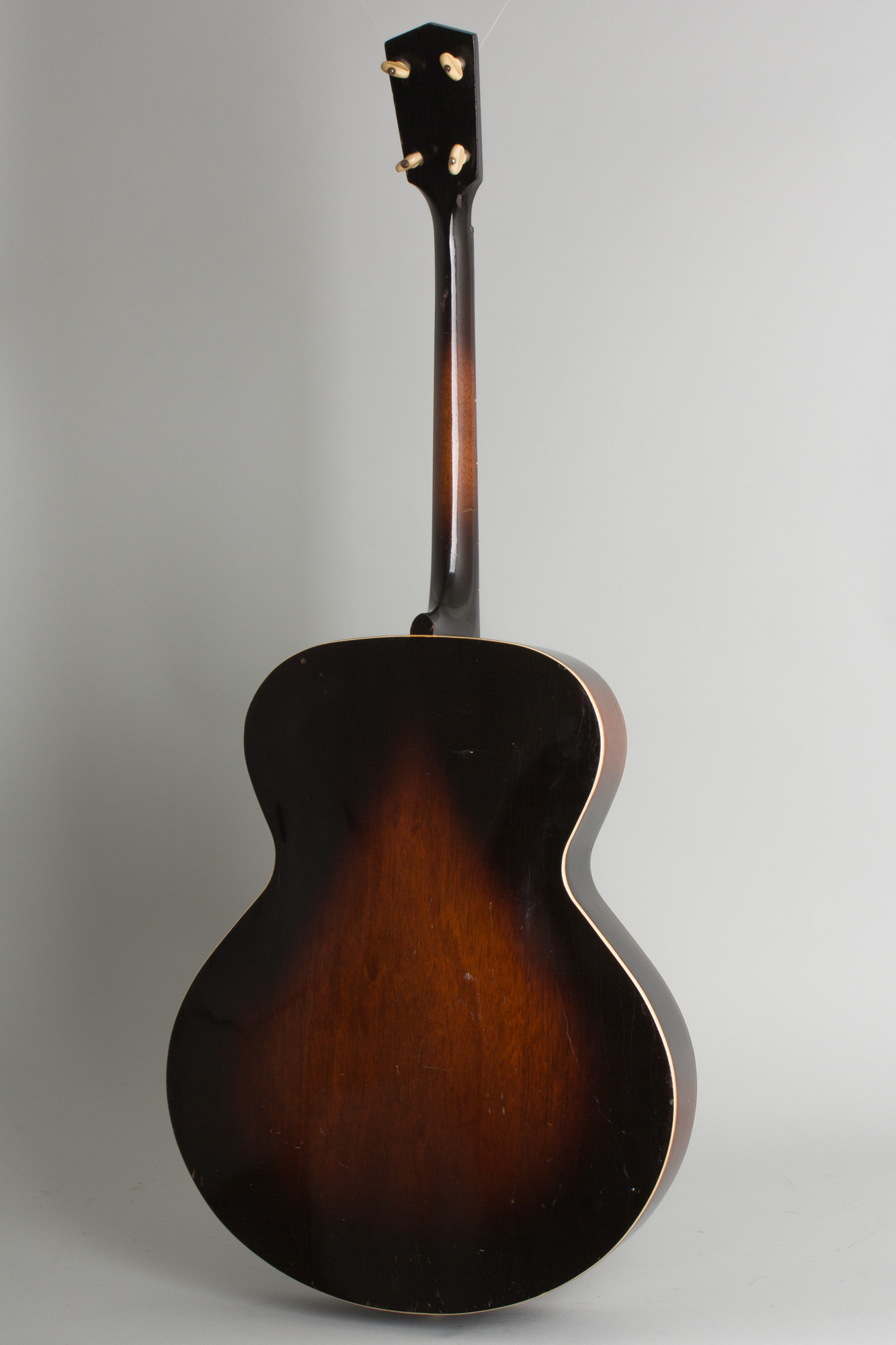 This 90 year old tenor plays well and sounds good, it does show some general wear but no major repair. The all-original finish shows checking and dings, dents and scrapes overall with a large scrape mark to the back of the neck behind the second fret. The pressed-into-shape top arch is firm with no major shrinkage and the neck has an excellent angle. These ingredients help make for a "good one" with Kalamazoo arched models! All hardware is original except the bridge, which is a repurposed Gibson-style mandolin unit that works fine. The neck is nice and straight and the original frets are in excellent shape, this is a very solid prewar archtop tenor, resting in a modern gig bag. Very Good + Condition.