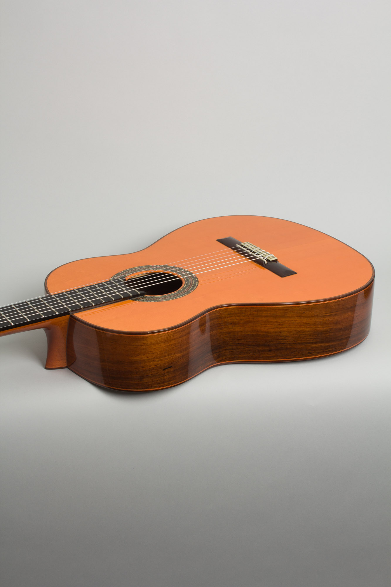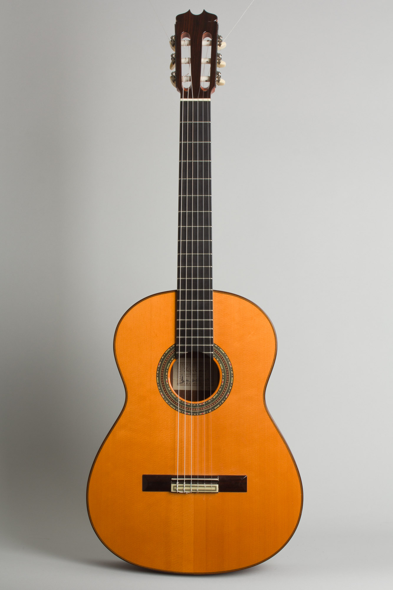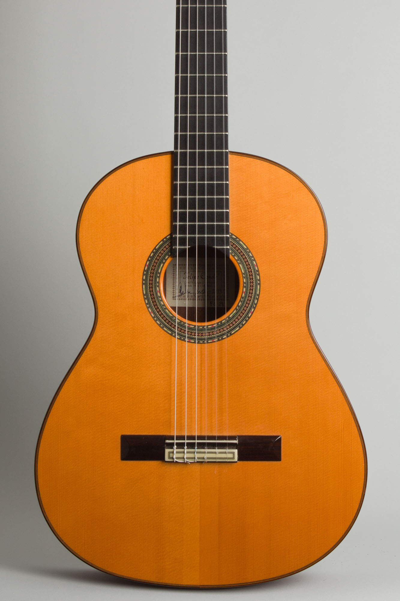 This FC28, initially conceived by Felipe's father and uncle, remains one of Felipe's most popular hallmark offerings: a German spruce top and rosewood back and sides produce a robust sound with a clean, tight finish befitting of any flamenco fingerstyle player or concert player alike. Just below their signature "Media Luna" carved headstock is a traditional 2" nut and subsequent ebony fingerboard providing a snappiness and clarity to the tone, never overwhelmed by bass though still retaining heft through a dry, grounded midrange. The spruce is finished in the rich "en color" orange tint, and the ornamental details on this guitar alone tell a story of superior craftsmanship with a beautifully detailed rosette and delicate multi-ply binding tracing every edge of the instrument. It is hand signed and dated by Conde on the label and carries the hallmark maker's stamps on the heel and foot.