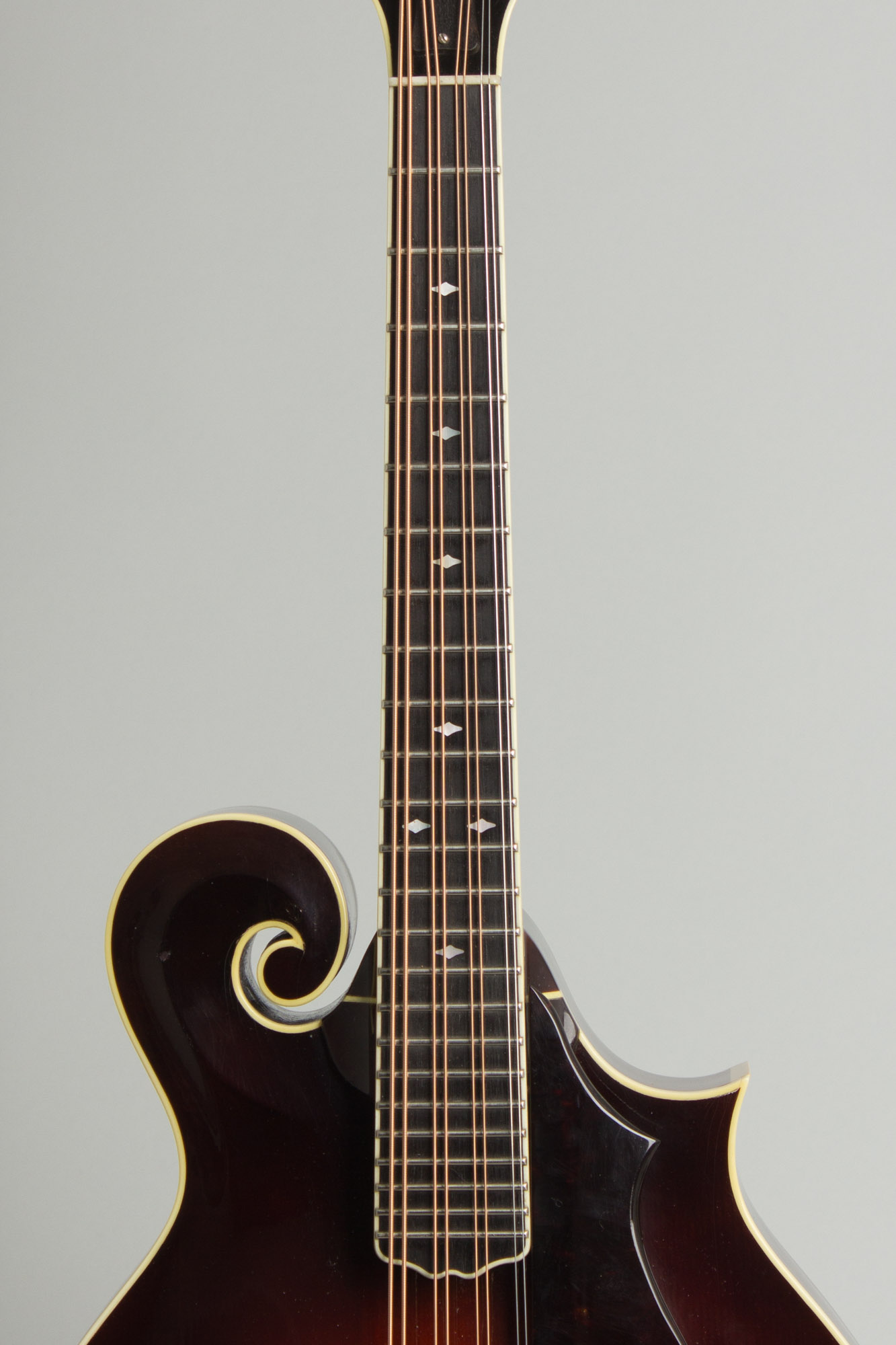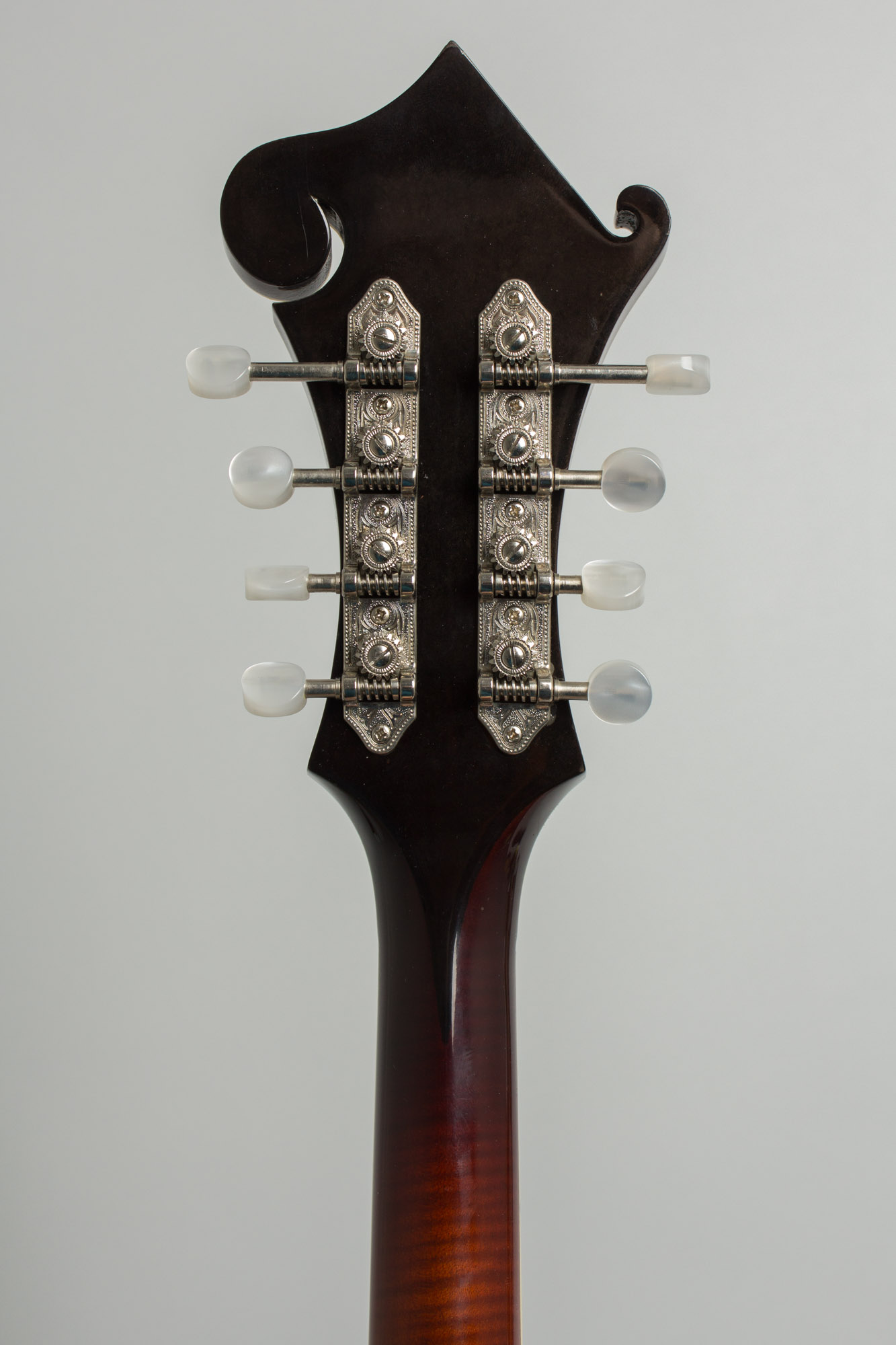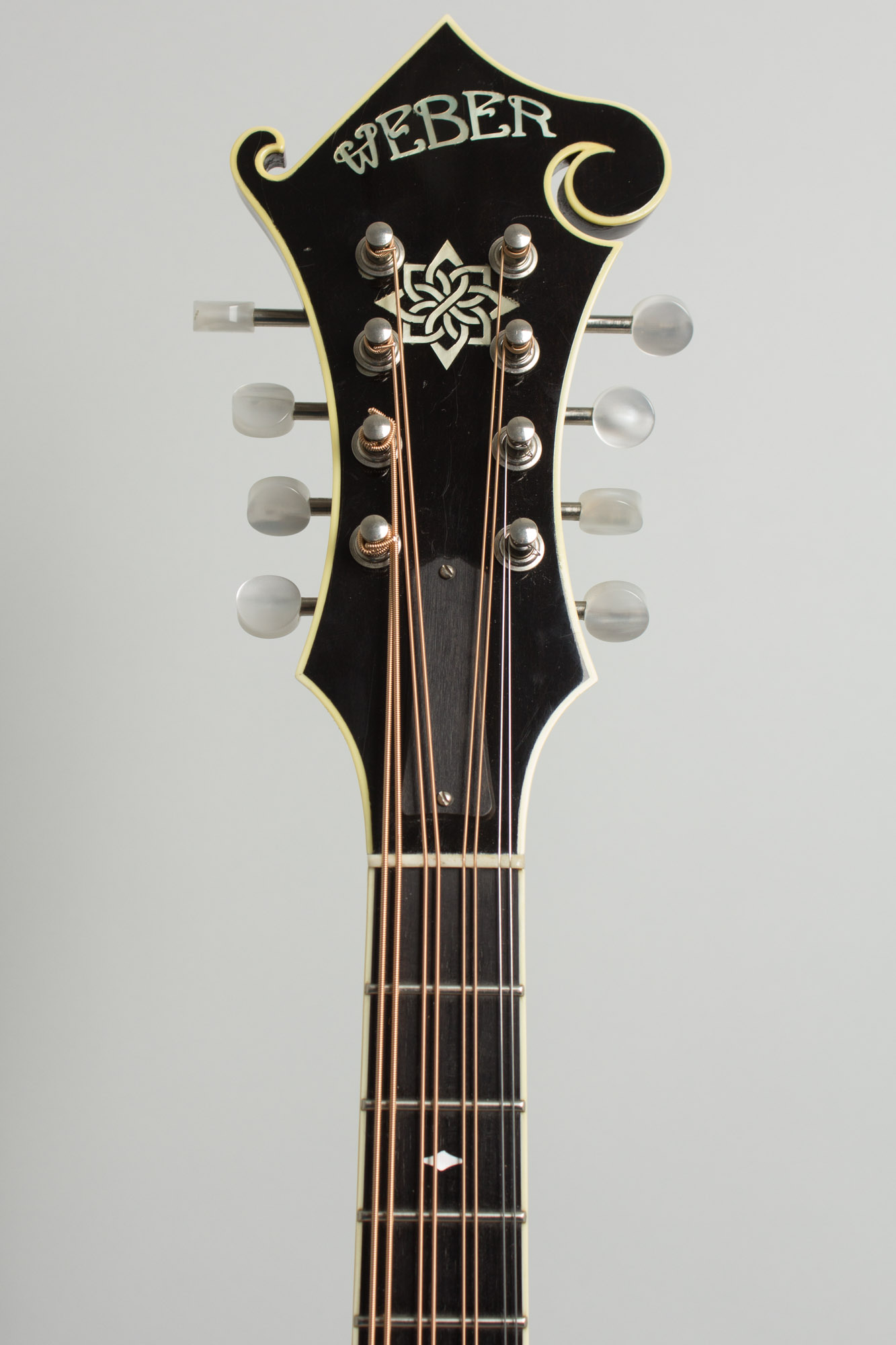 This instrument is a fairly rare modern interpretation of the Gibson H-5 Mandolin format built by the Weber company back when they were in Belgrade, Montana. It retains most of the design elements of the original 1920s Loar-era Gibson but with a noticeably longer scale length, 17" versus the Gibson's 15 3/4". This adds a little extra resonance and the fairly slim modern feeling round-backed maple neck makes this an superbly playable instrument.