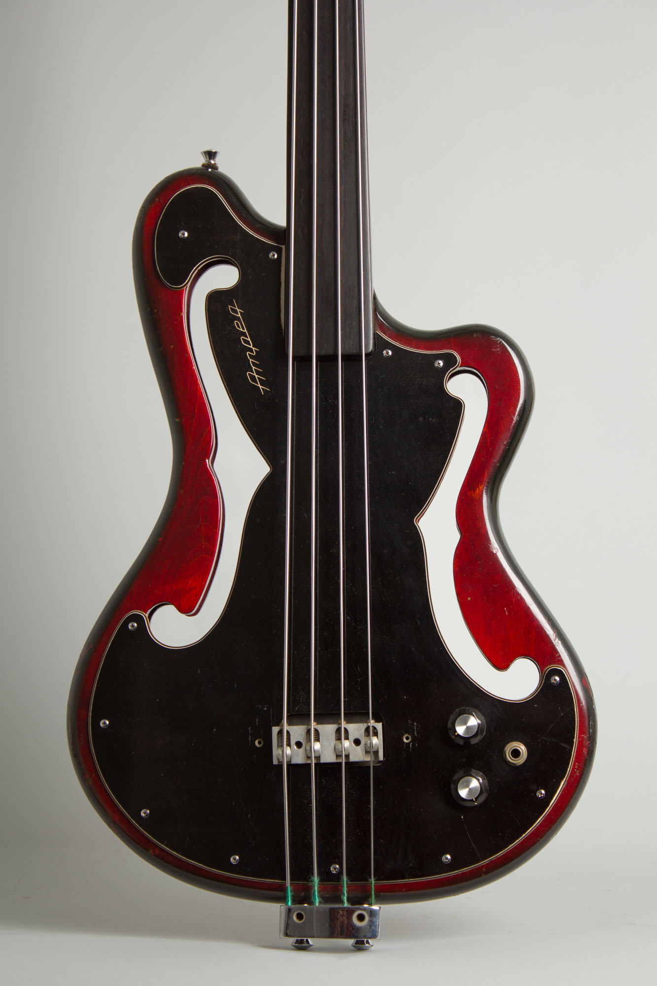 This is a well-worn, played in but unaltered early original example of the fretless Ampeg AUB-1 (Ampeg Unfretted Bass #1), the company's first production "horizontal" bass. While Ampeg had prospered with amplifiers since the 1950s, they had made only half-hearted attempts to market instruments before 1966. The first was the fiberglass upright electric "Baby Bass" in 1961, and then they dabbled with importing re-branded Burns of London guitars. After that experiment ended, Ampeg decided to create a truly unique original design for bassists exclusively. These Ampeg basses were launched at the 1966 NAMM show with some fanfare and have become a '60s classic, although never mounting serious competition to the Fender Precision or Jazz bass that dominated the market. This one has a very low serial number (#166) and would date to that initial year.