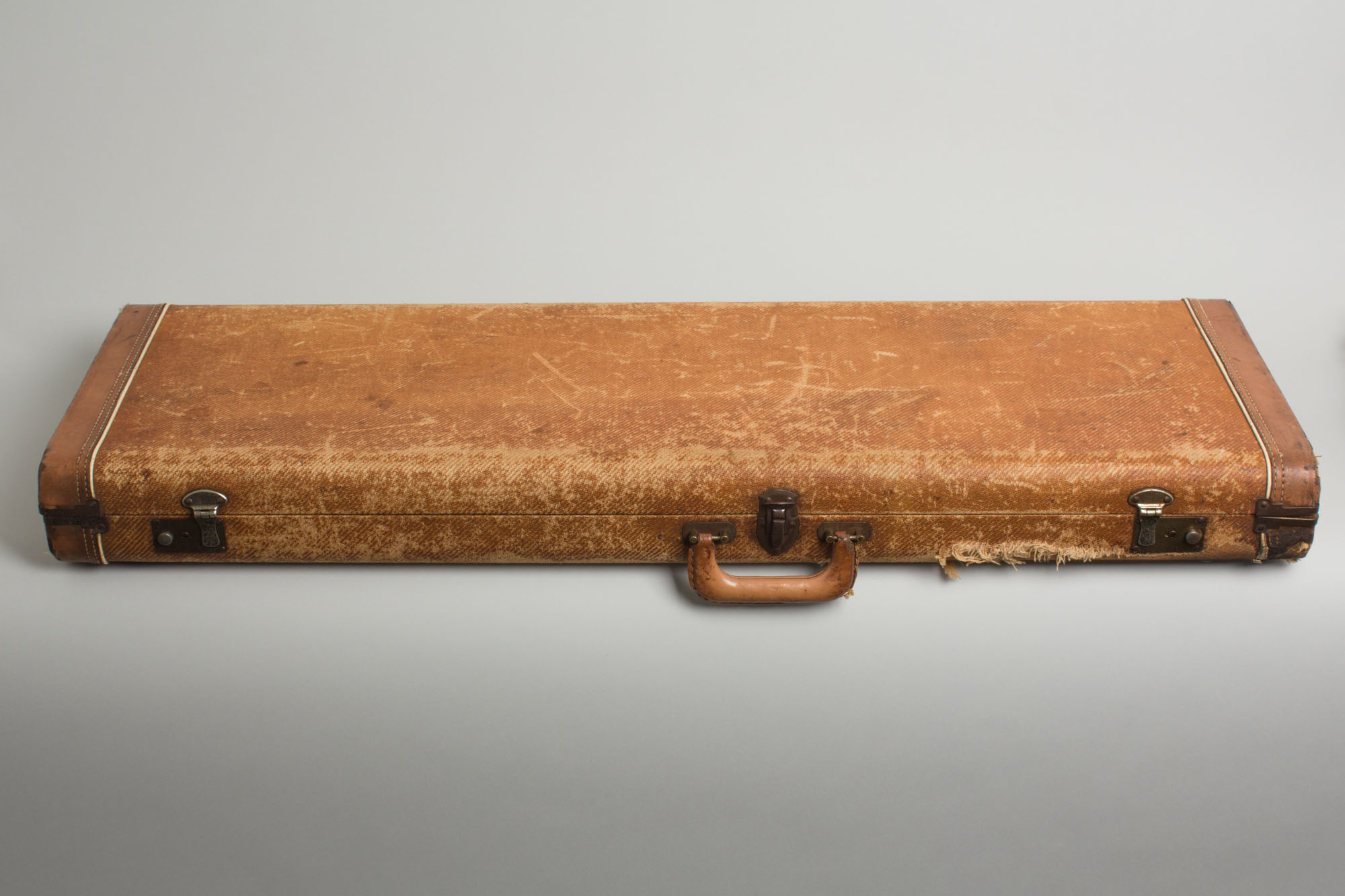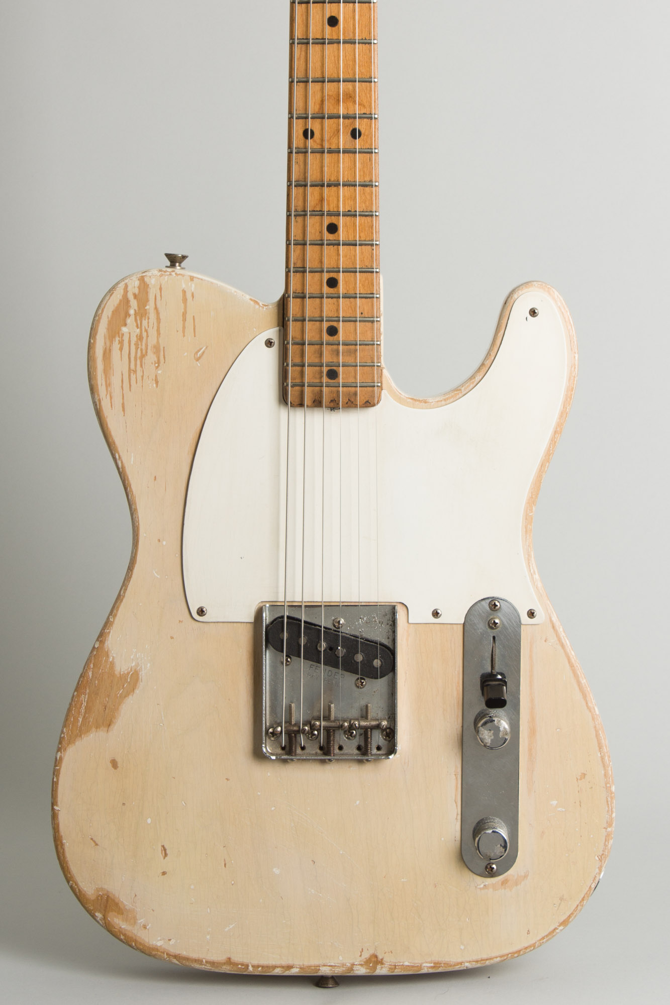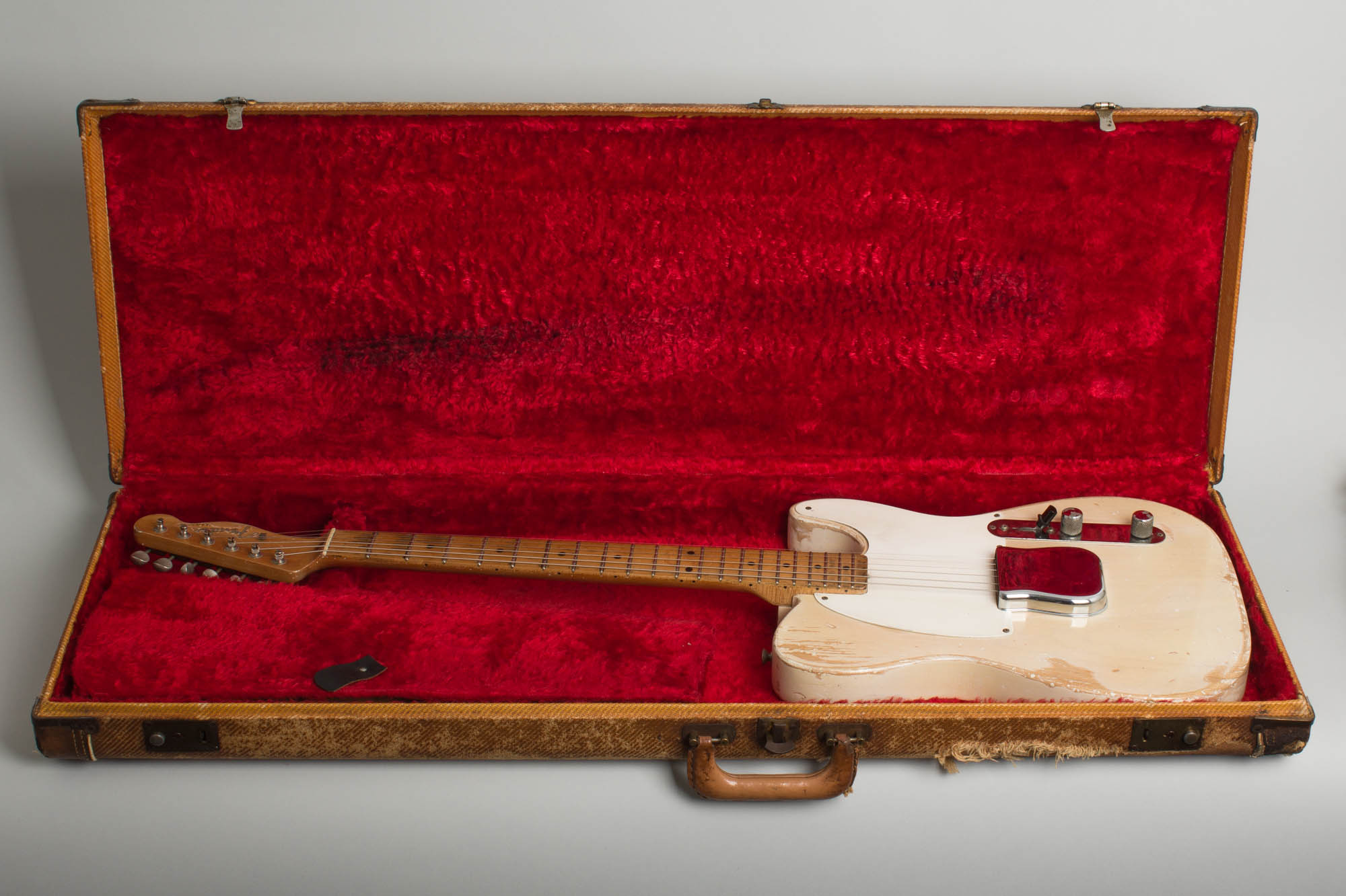 This is a venerable Fender that "took a lickin' and kept on tickin" and survived what we can only describe as cheerfully misguided cosmetic adventures. While perhaps no longer a "Collectors" piece this oozes vibe and is a fantastic gigger, one of the lightest '50s Tele-family guitars we have had coming in at exactly 6 Lbs. with the bridge cover ON! This one just wants to be played hard offering a great snarling, spanky tone ready for the next 70+ years. It resides in the original tweed Fender HSC, worn but intact with a number of extras. These include two "ashtray" bridge covers (the original with some worn chrome and a cleaner later one), the period "top line leather" strap, some period string packages including a '50s Fender string box and older photos of the guitar taken before, during and after the overfinish removal. Overall Very Good Condition.