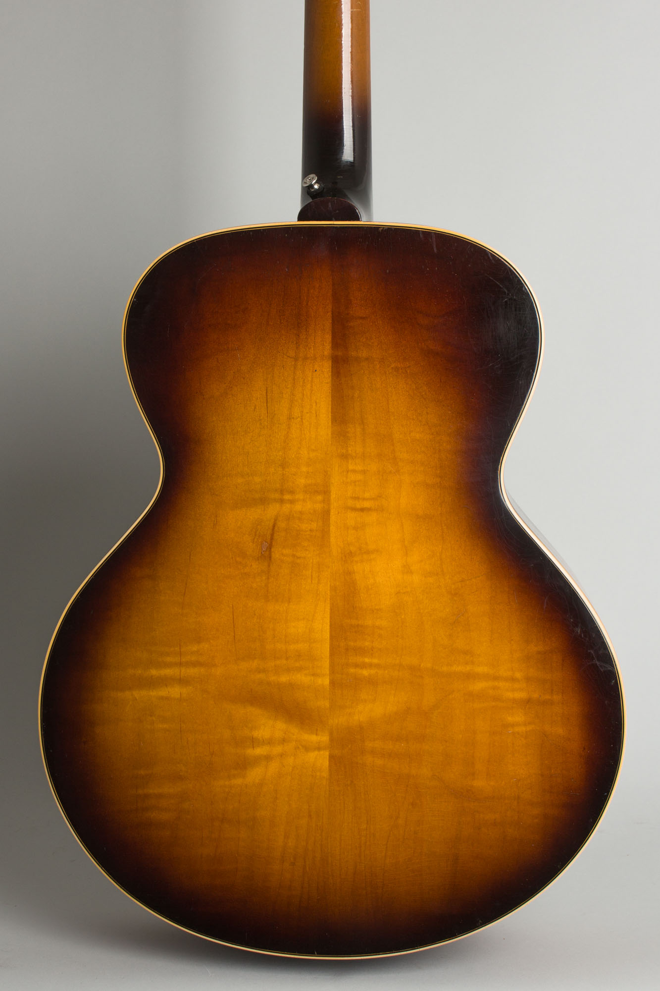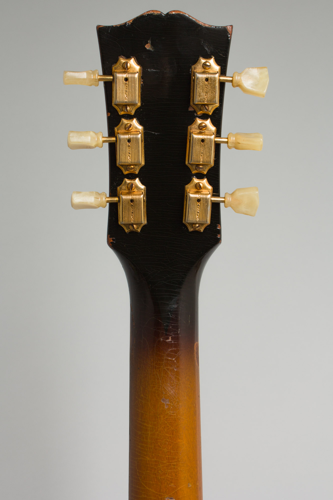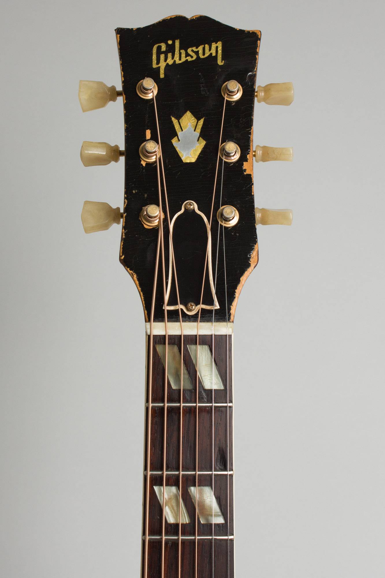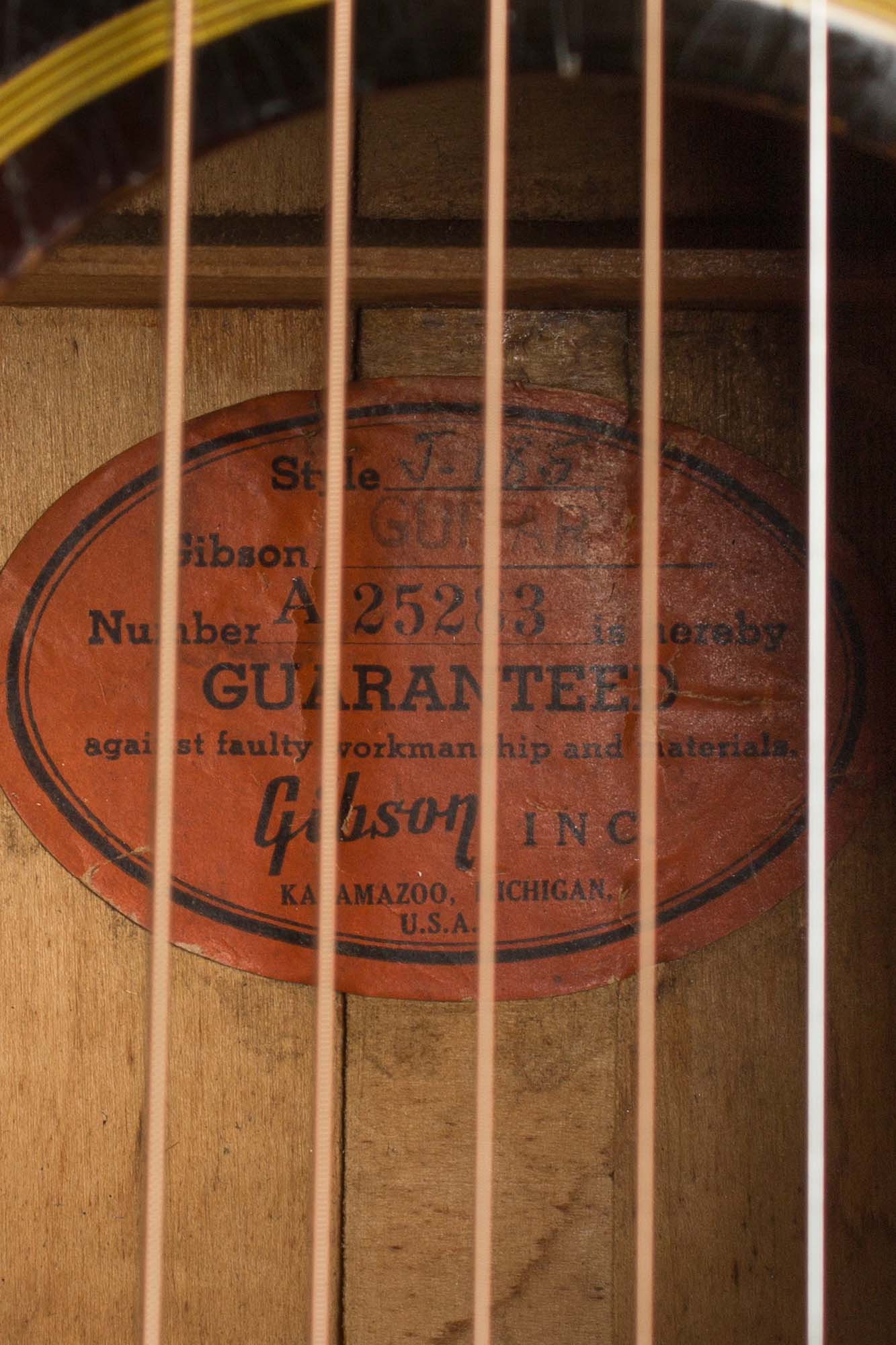 This guitar has a serial number indicating it was shipped in March 1957, and a V-series Factory Order Number showing it was built late in the year before. It is one of only 648 total sunburst J-185's built in the entire decade of the 1950s, 71 of which left Kalamazoo in 1957, the next to last year of production. These numbers are very small for such a well-regarded guitar but this model suffered from the "Midline Blues". It seems most folks who could afford one went all out and bought a J-200, while the rest stuck with the familiar and much more affordable J-45 family. After another year of disappointing sales in 1958 the J-185 was discontinued.
