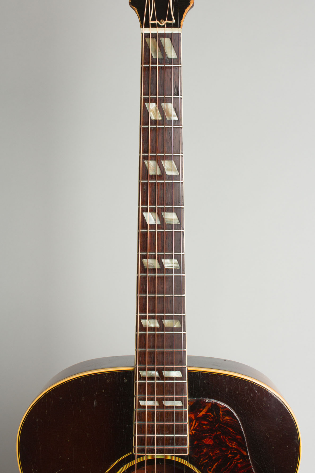 This is an original and fine-playing nearly 70 year old example of this much-desired instrument that has seen some serious play but remains structurally superb. The top shows some fairly heavy but oddly isolated wear while most of the rest of the guitar is comparatively clean. The original lacquer finish on the back and sides shows typical checking and some minor dings, dents and scrapes. The back of the neck shows some heavier checking and small but noticeable dings, dents and wear spots through the finish. The headstock has some checking and for some reason quite a bit of edge chipping.