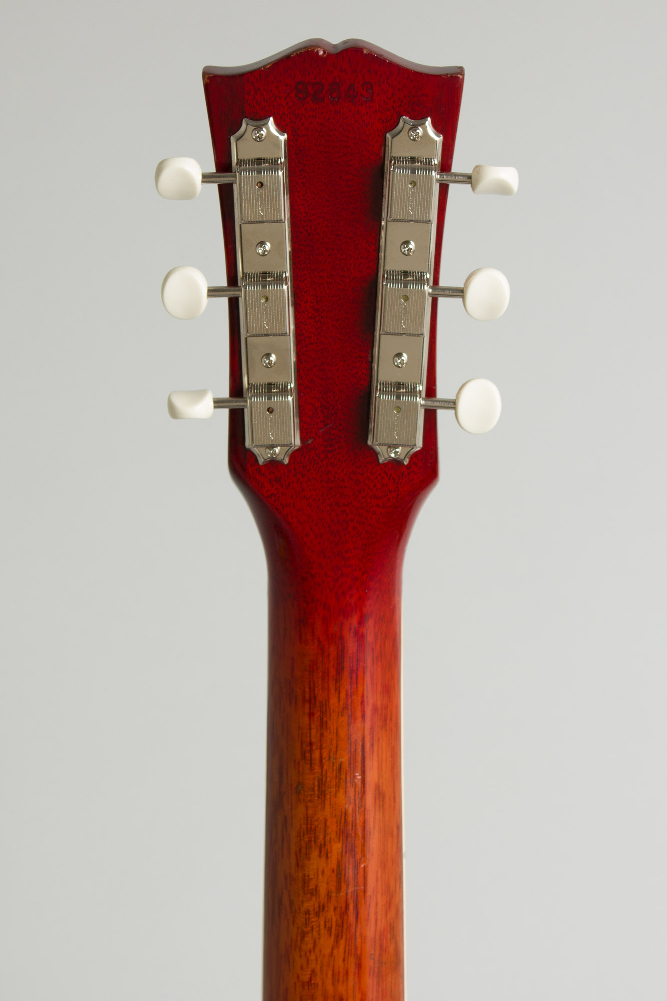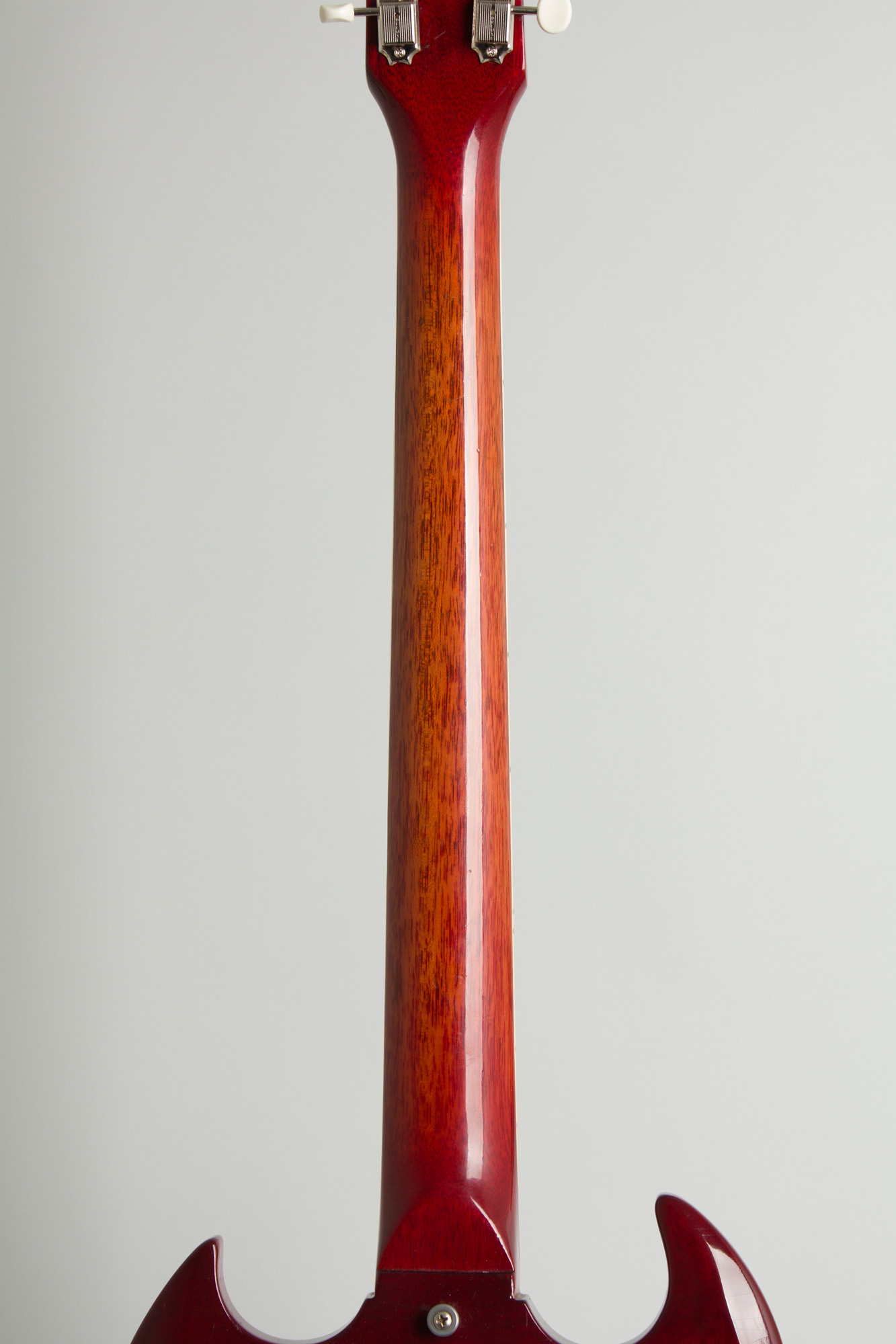 An item of note on this guitar is the C-profile neck is *slightly* slimmer at the nut than generally expected spec on SG's until 1965, coming in at just a hair wider than 1 5/8"'. While the prevailing theory is the older 1 11/16" nut was ubiquitous until 1965 we have had numerous other earlier Gibsons that deviate from this. The neck itself has a transitional feel between the very flat 1960-62 profile and the rounder, deeper carve common in 1964. It tapers towards the body with the profile becoming chunkier nearer the heel with a great solid feel.