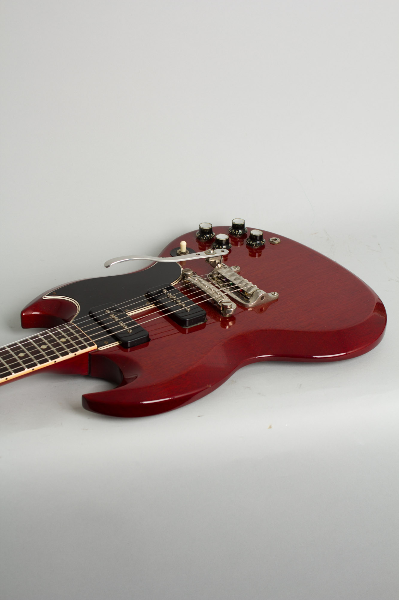 The SG Special was and remains a very popular guitar, with good reason. This one quite handy, around average weight for the period at 6.75 pounds (the vibrato adds a bit of that) and handles beautifully. Only 1017 of these slim cherry beauties were shipped in 1963, and not too many will have survived this cleanly. The model has long been regarded as a classic Gibson solidbody; anyone who has seen live footage of the Who or Santana in the late '60s knows what these light and responsive SG Specials are capable of! It is simply one of the classic rock guitars of that or any era, more versatile than many think with a "special" sound unto themselves!