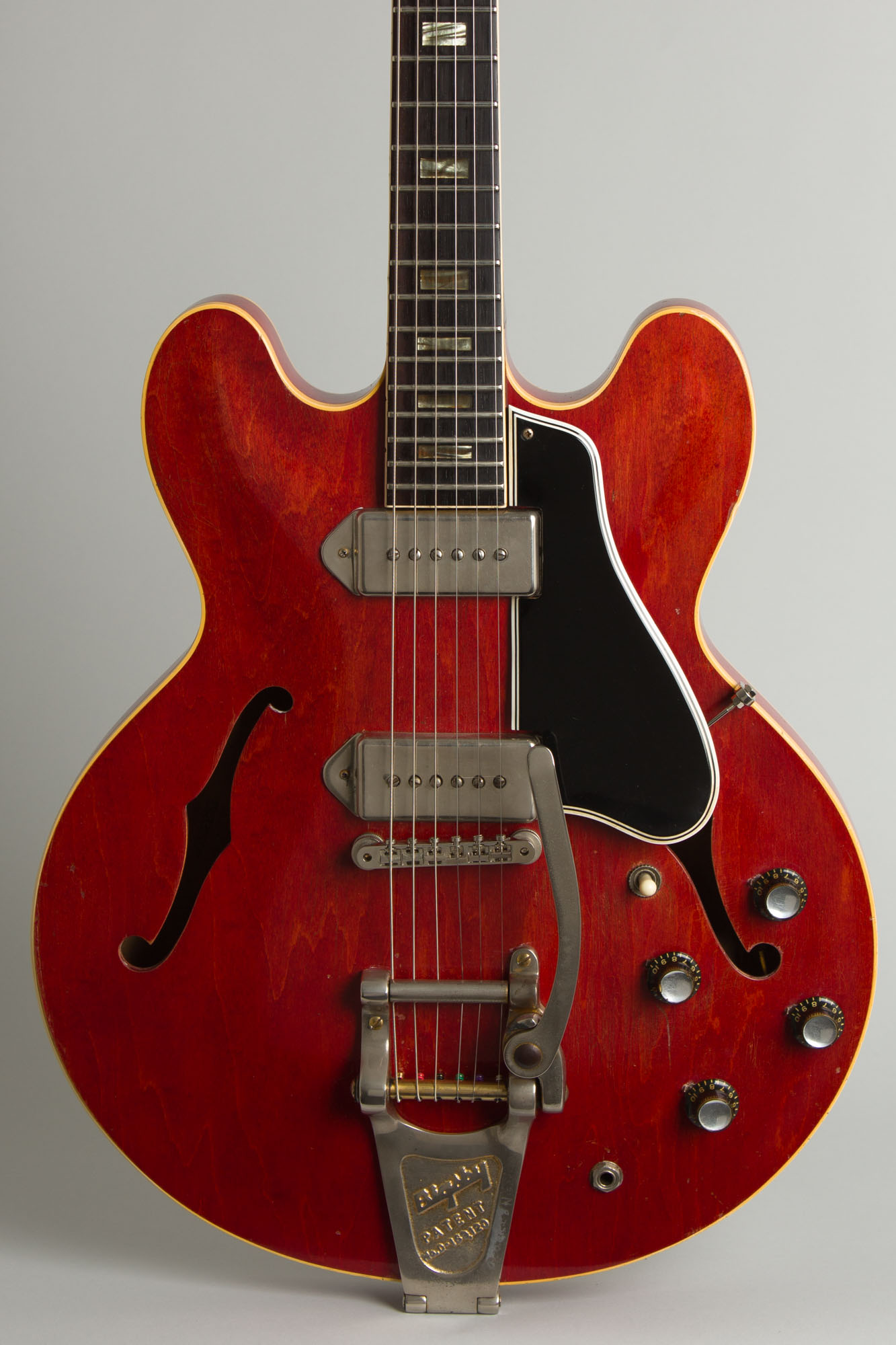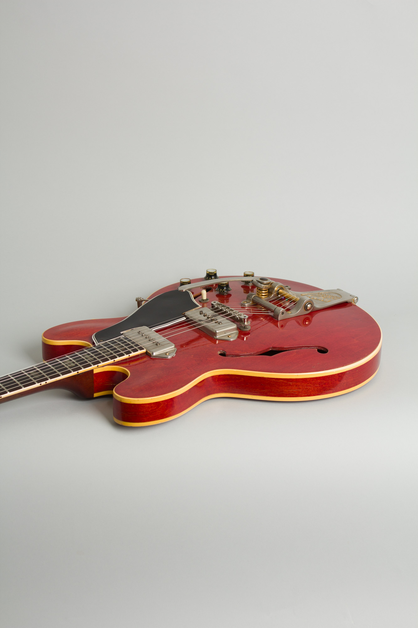 This is a nice original example of a cherry-finish ES-330TD from 1963, a very good year for Gibson! The ES-330TDC has a classic set of mid-line Gibson features, but a distinctive feel. This one is equipped with a period Bigsby vibrato tailpiece, so while somewhat heavier offers a bit of extra sauce sonically! The Bigsby is actually gold plated (though most of it is worn off) and though not a factory fitting is a period-appropriate one.