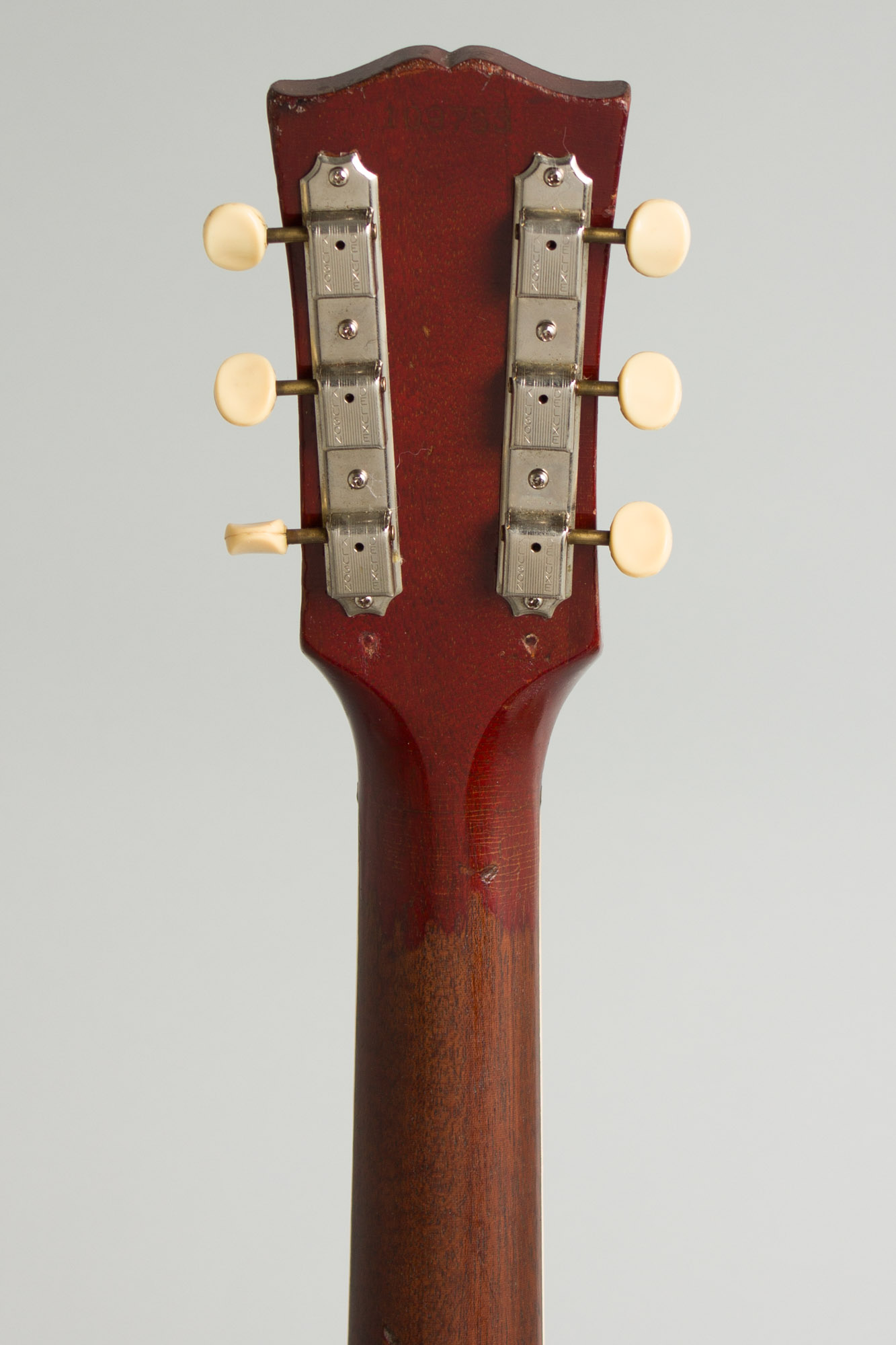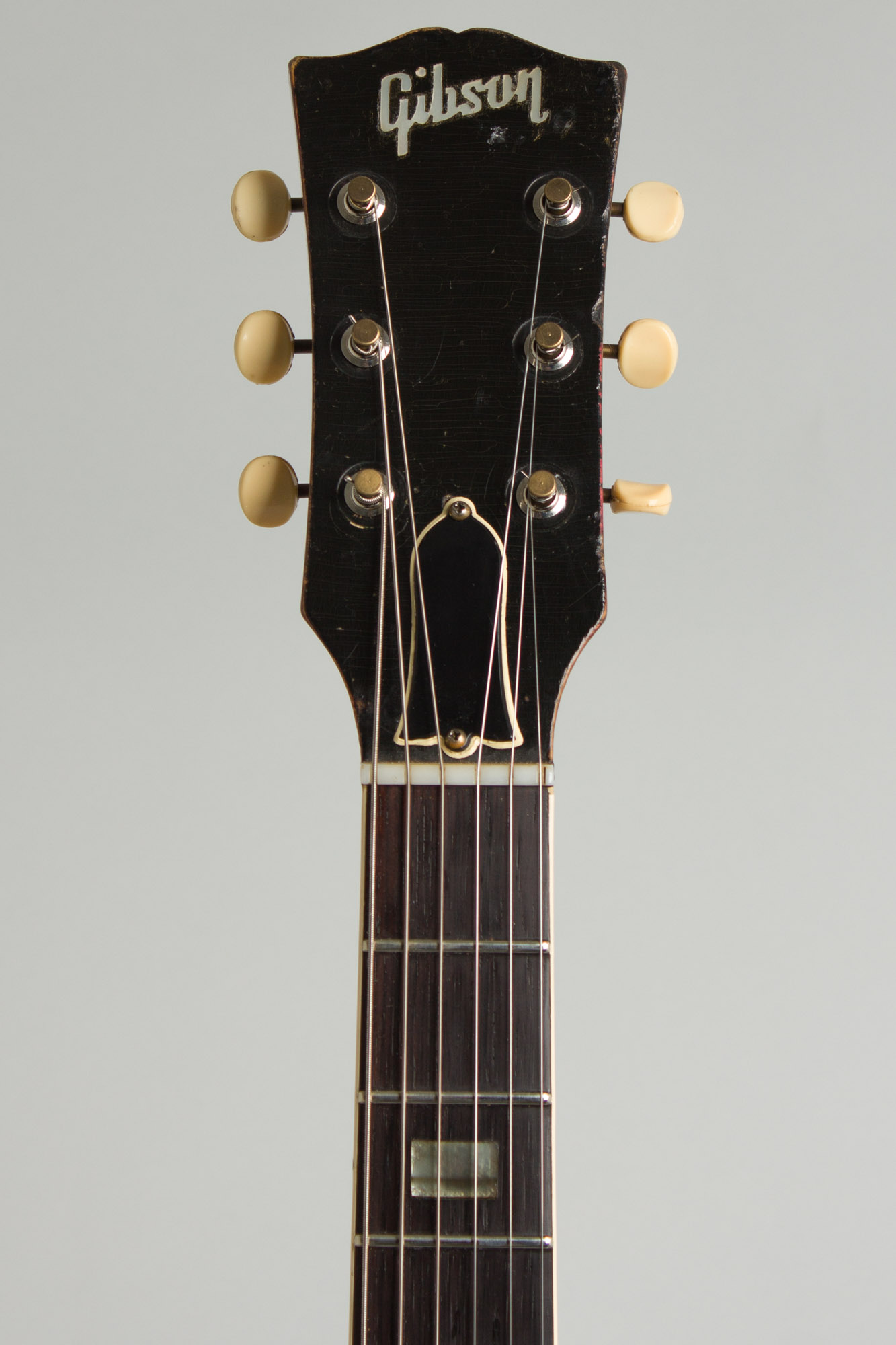 As noted a Bigsby tailpiece was added long ago, likely when the guitar was new. It was originally gold plated but much of that is worn off, and there is a license # lightly etched into the treble side of the baseplate. The tuners are repros of the correct period Kluson Deluxe machines re-installed in place of something else with some scars visible; the Tune-O-Matic bridge and pickguard bracket are correct style repros as well. The other hardware remains original, the nickel plating showing some general wear.