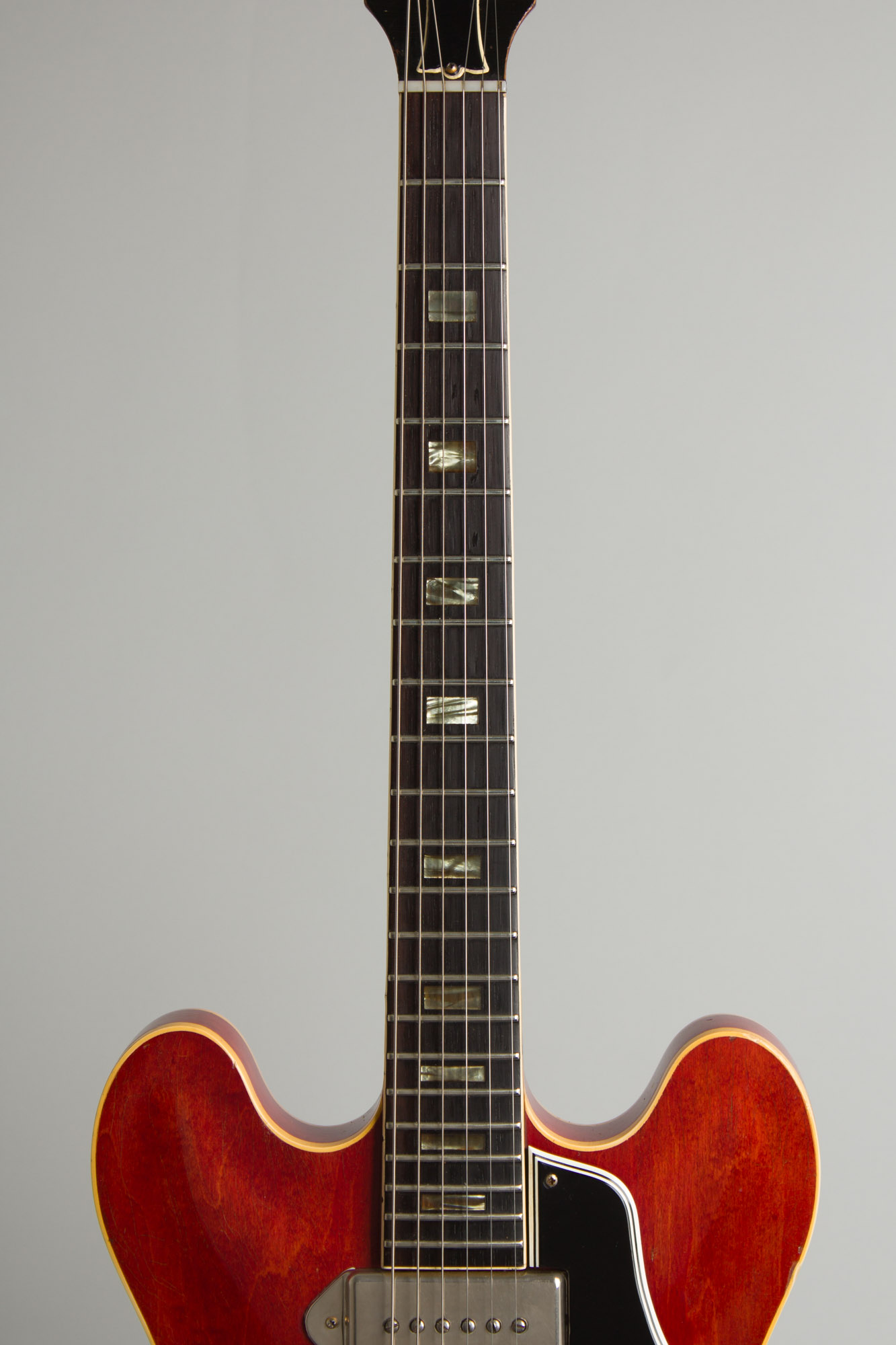 This guitar has typical period details including a medium cherry finish overall, bound rosewood fingerboard with pearloid block inlay and nickel-plated hardware including the tune-o-matic bridge and trapeze tailpiece. The tuners are single enclosed Kluson deluxe with plastic buttons. Two P-90 pickups under nickel-plated covers are mated to the standard Gibson wiring rig, with the 1960's style "capped" plastic tone and volume knobs and white switch tip. Just the previous year the ES-330 switched from a dot-inlaid neck with plastic pickup covers to this configuration.