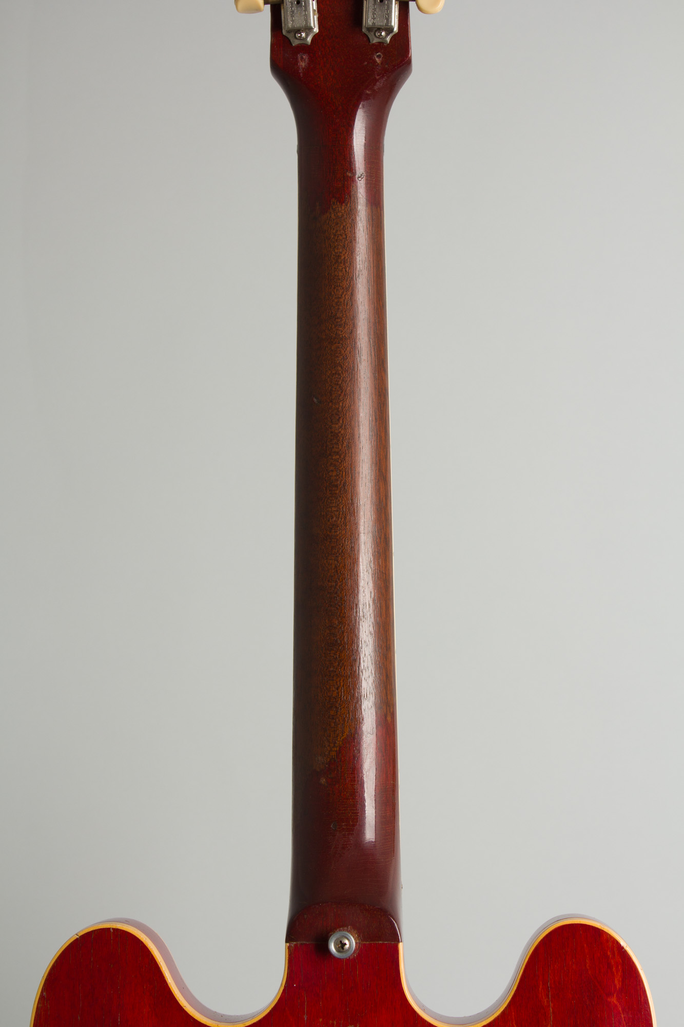 This cherry red thinline has been around over 60 years; it shows some general wear and tear but still plays fine. Overall there is typical checking to the finish with a collection of dings, scrapes and dents; a larger belt buckle wear spot is evident on the back. The back of the neck is well worn down to the wood, with some dings and dents largely worn smooth again. The ES-330 originally had no forward strap button; this one had a standard Gibson style pin added on the back of the heel.