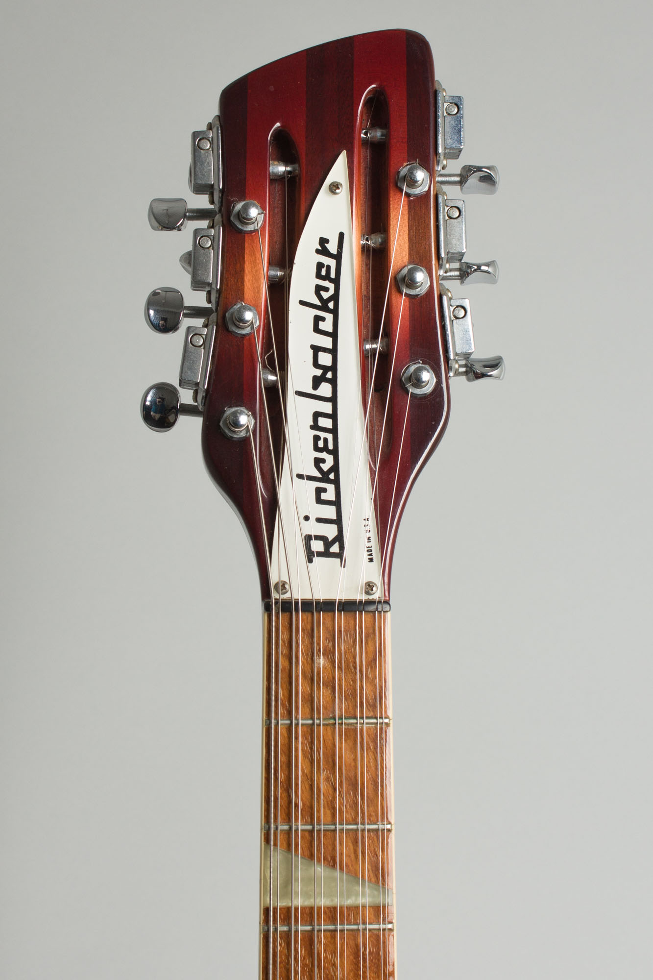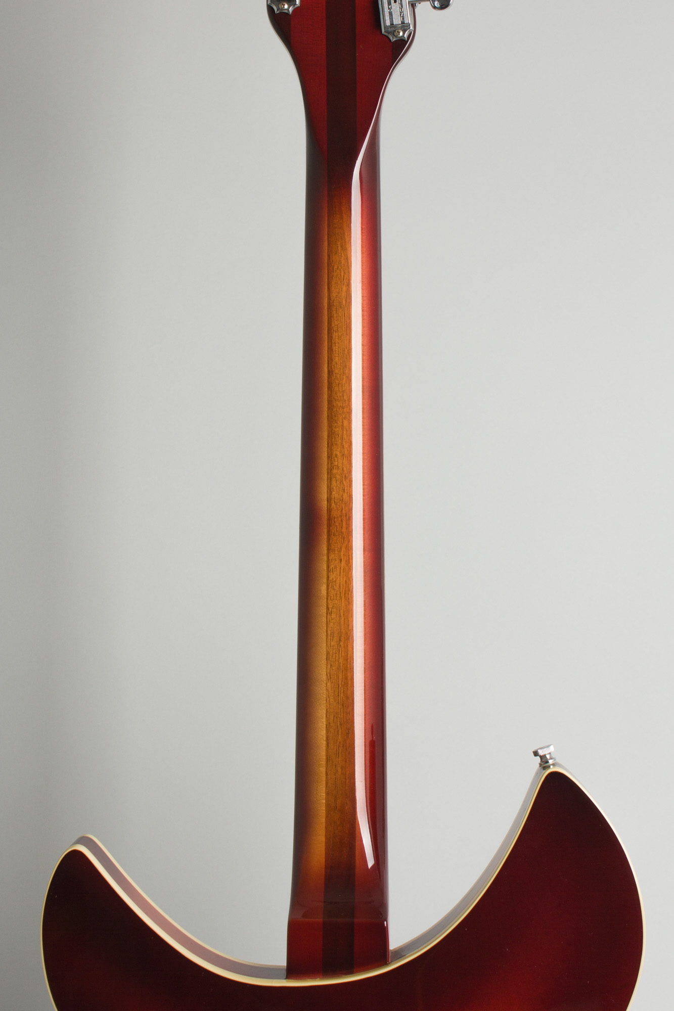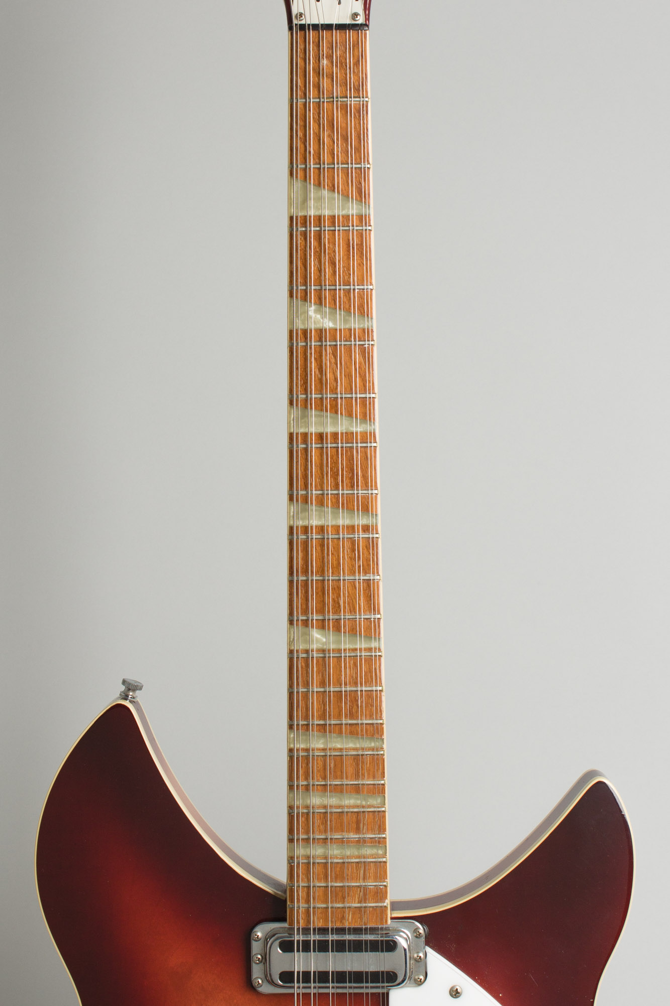 In the 1980s Rickenbacker acknowledged the status of this model by making it the subject of one of their earliest and most faithfully accurate reissues. The body and neck carry a very deep iteration of the classic red sunburst "Fireglo" finish, almost shading into the darker 'burst the company calls "Autumnglo". The Model 360-12 carries Deluxe features with triangle inlay on the bound fingerboard, a single bound body and unbound sound hole. The pickups are faithful recreations of the 1960s "toaster top" single coils wired in the classic 5-knob, one switch circuit with a choice of mono or "Rick-O-Sound" stereo output. The 1963-4 squared neck heel, flat plate tailpiece and 6-saddle bridge are authentically reproduced, the only notable variation being Schaller-made reproductions of the 1960s Kluson deluxe tuners, which were not available in 1987.