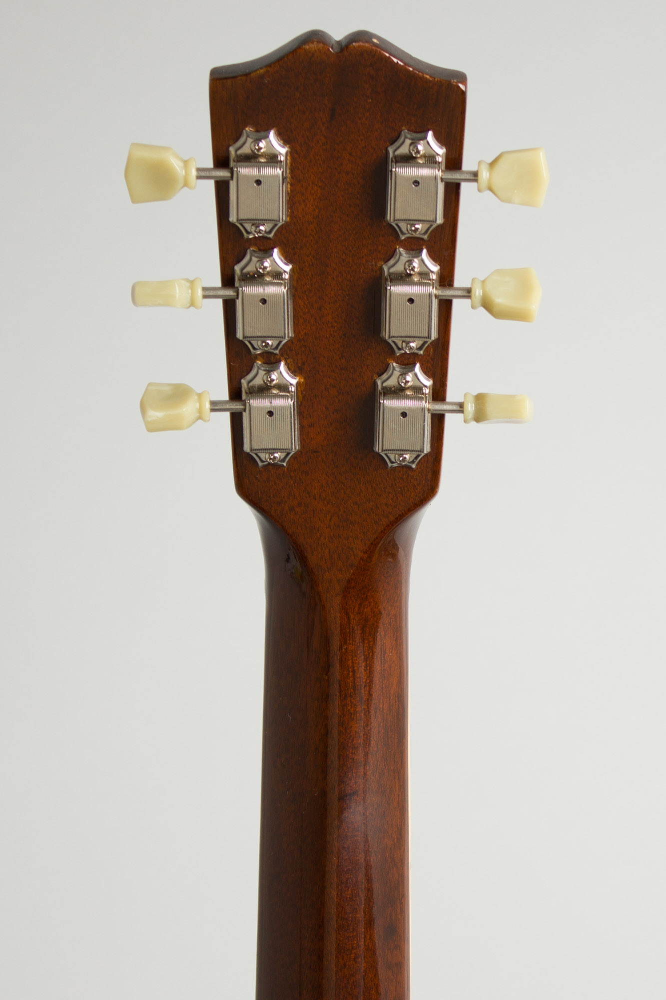 With its 1930s build and 1950s finish and hardware this is quite the hybrid! The neck has a slim "V" profile quite different from both earlier and 1950s Gibsons, while the 1950s pickguard and finish dress up the 1934 guitar in a new suit. The round hole archtop in general is a somewhat unusual form offering a sound that has some of the character of both flattop and archtop guitars, which this one bears out. It is a very good sounding and playing L-4 with a surprising amount of power and a well-modulated tone even when pushed. Not only a fine guitar, this factory re-worked Gibson is a hybrid time capsule of two fantastic Gibson eras and a truly unique piece.