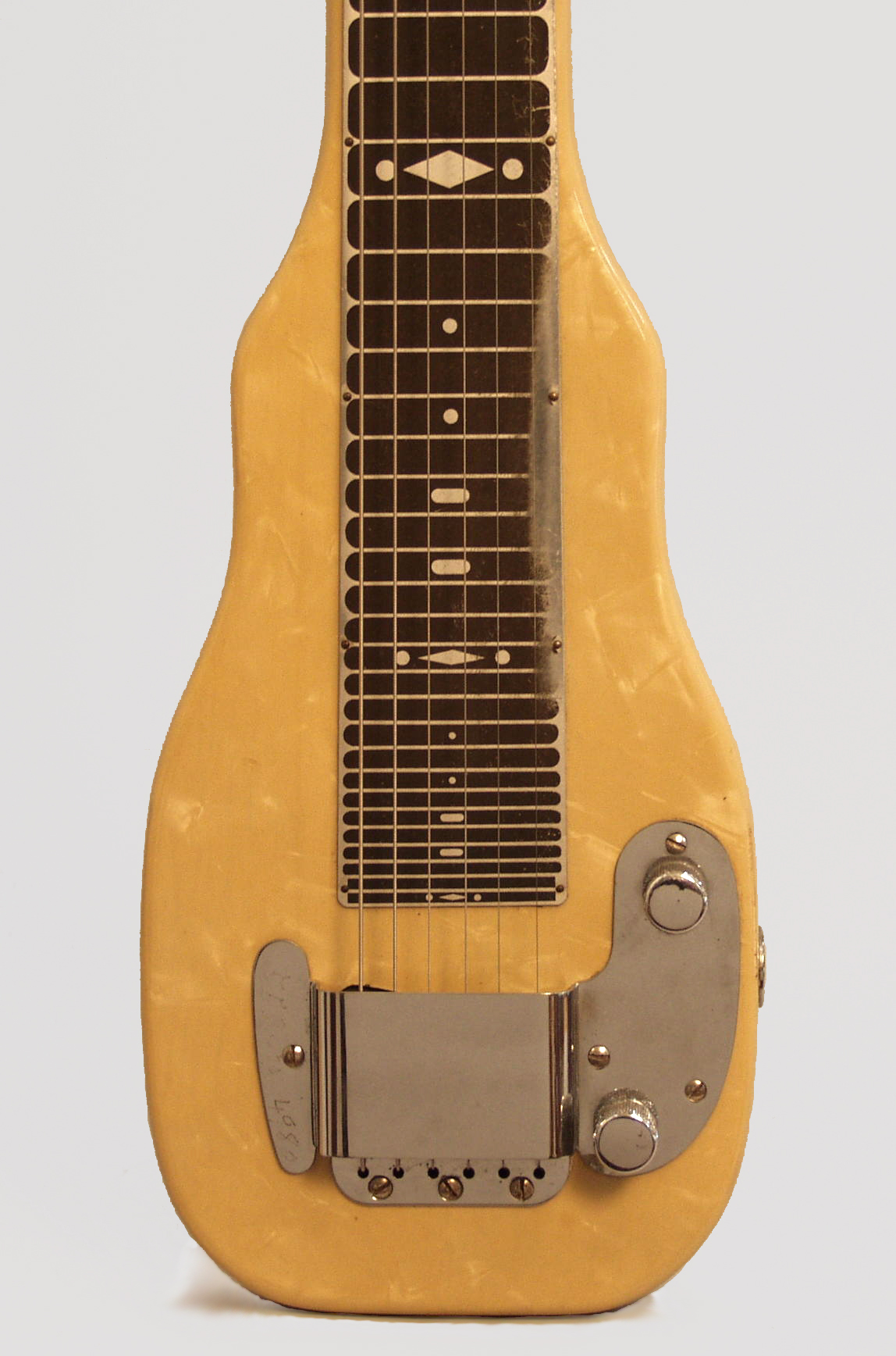 Fender Champion Model Lap Steel Electric Guitar, c. 1950, made in Fullerton, California, yellow pearloid finish, original grey chipboard case.