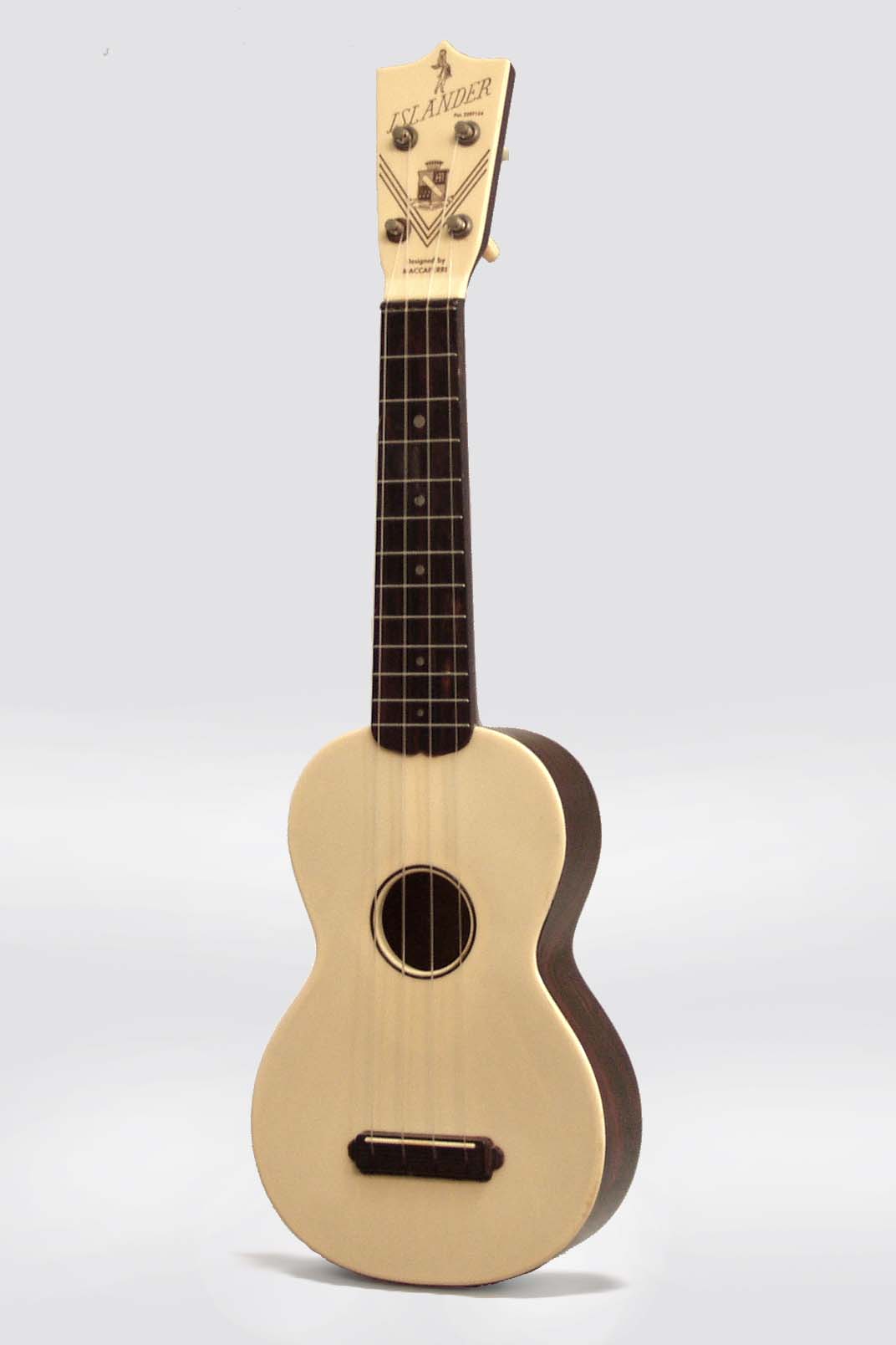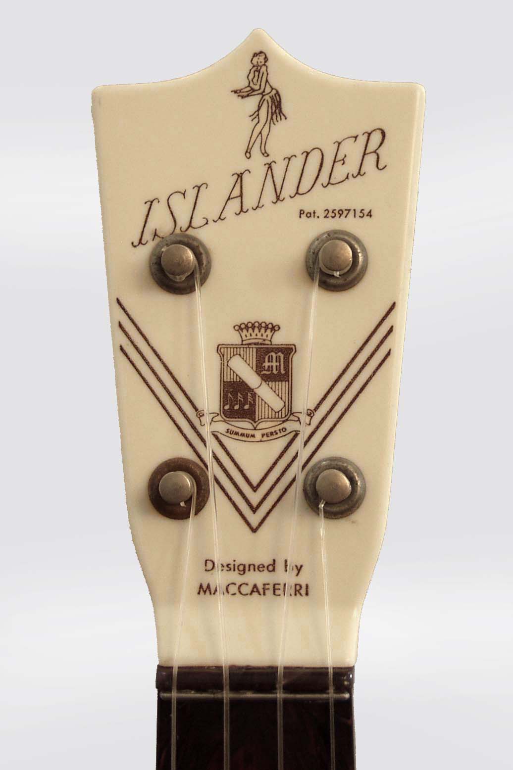 Part of the 1950's Maccaferri empire of styrene plastic instruments, the Islander uke is a simple, attractive, and surprisingly good-sounding creation. The one-piece molded back/side/neck assembly is made of spectacularly "grained" swirled multicolored polystyrene, as is the fingerboard. The top and headstock face are made of contrasting ivory plastic, with an "islander" logo, Maccaferri crest, and diminutive Hula dancer figure on the head. The dot fingerboard markers are screened on. Tuners are metal-barreled friction pegs with ivory plastic buttons.