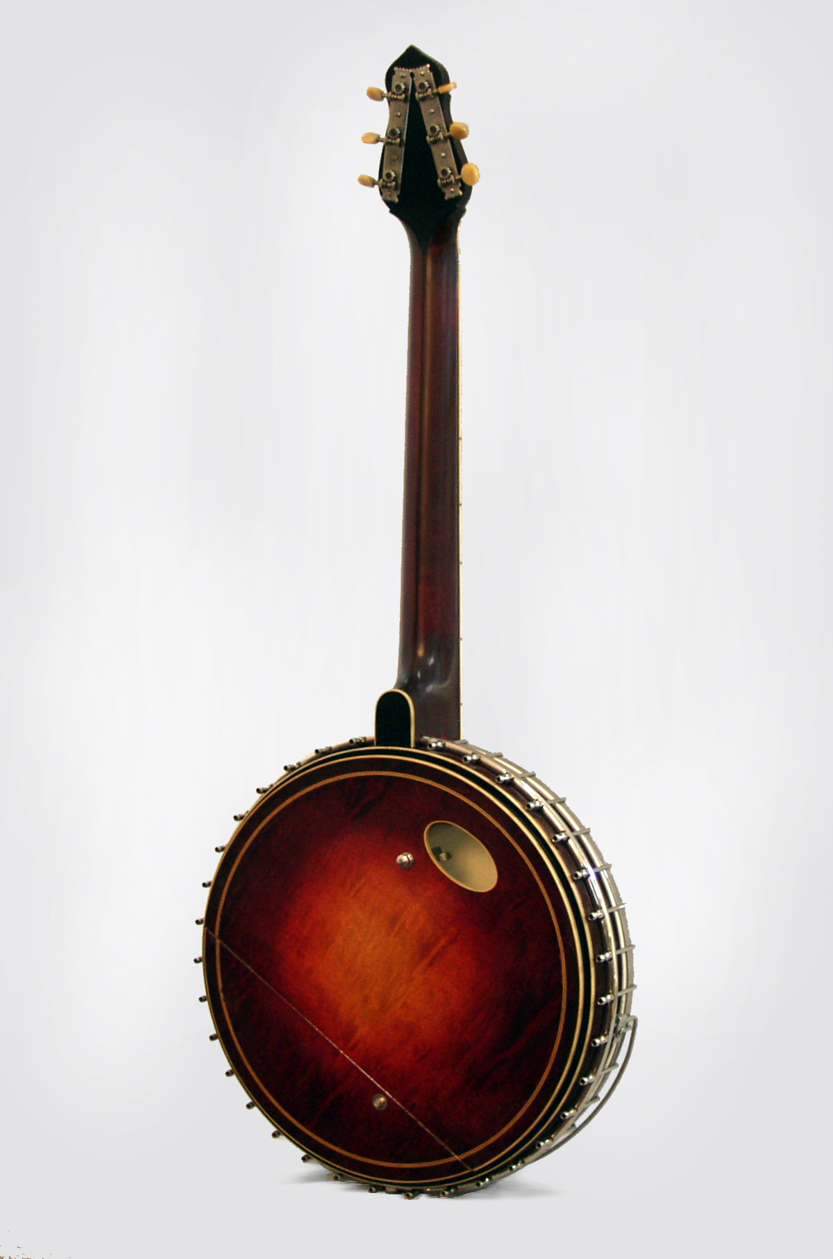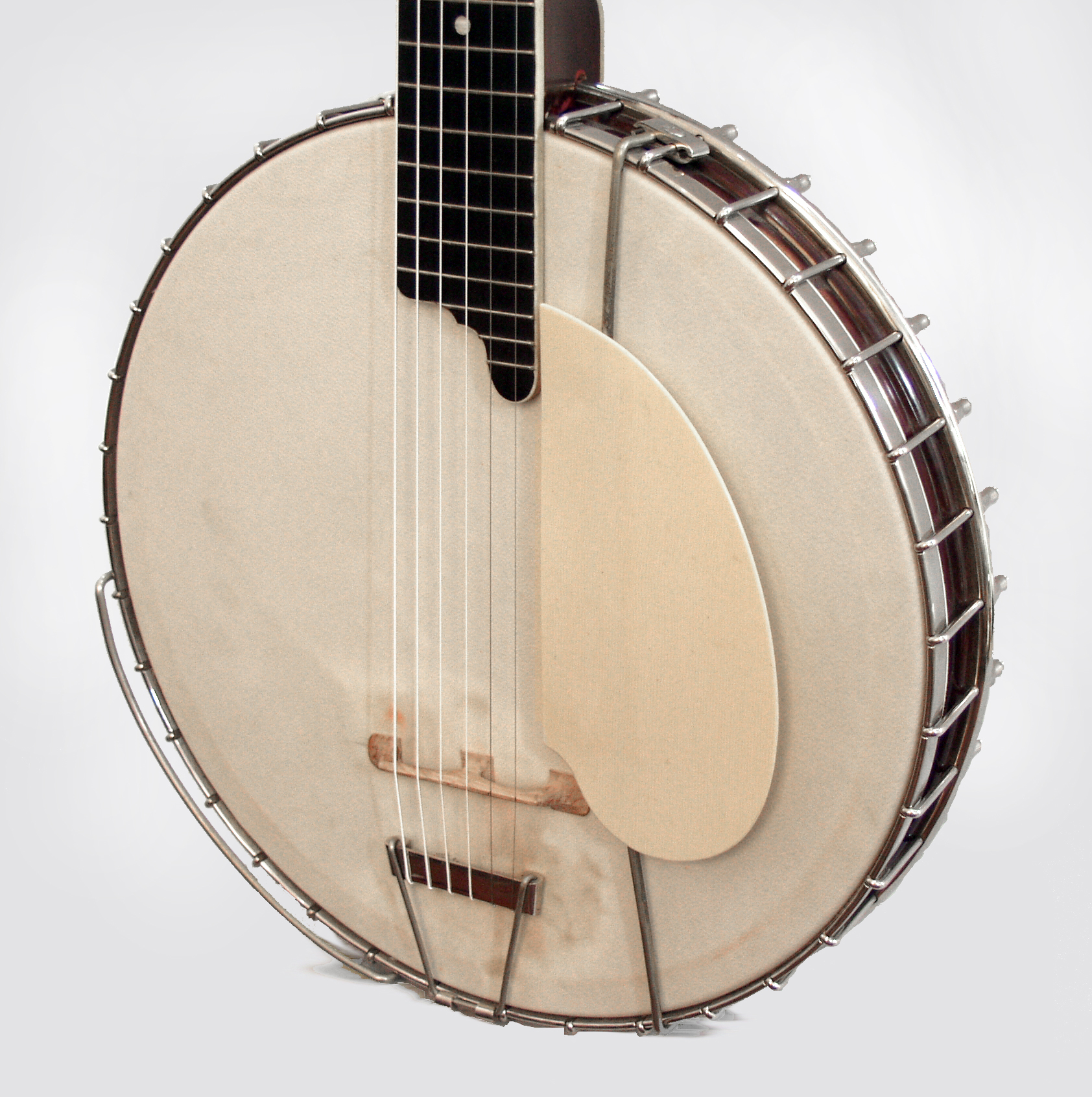 The "Style GB" was part of Gibson's initial banjo line, introduced in 1919 as follow-ups to the initial "Style TB" tenor banjo which debuted in 1918. There were numerous variations in these instruments as Gibson experimented with trying to create a banjo line sonically on par with their mandolins and guitars. This example has a wooden dowel, single adjustable co-ordinator rod, and the earliest form of "trapdoor" resonator.