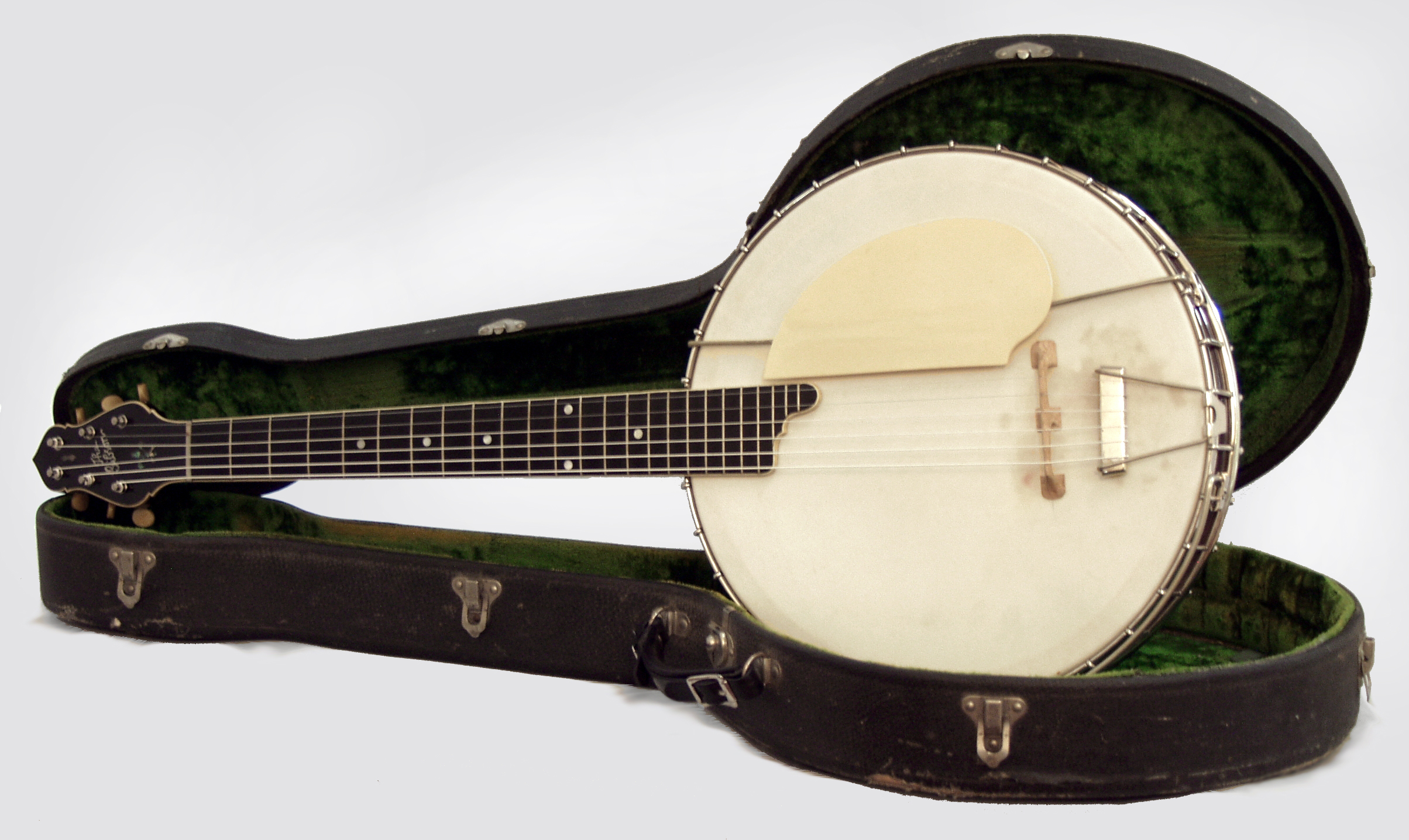 Excellent original condition overall; all original except a later skin head and reproduction bridge. Minor wear, mostly to the neck finish. Plays very well with the perfect deep, plunking "Papa Charlie" sound. Includes an original shaped hard case. Excellent Condition.