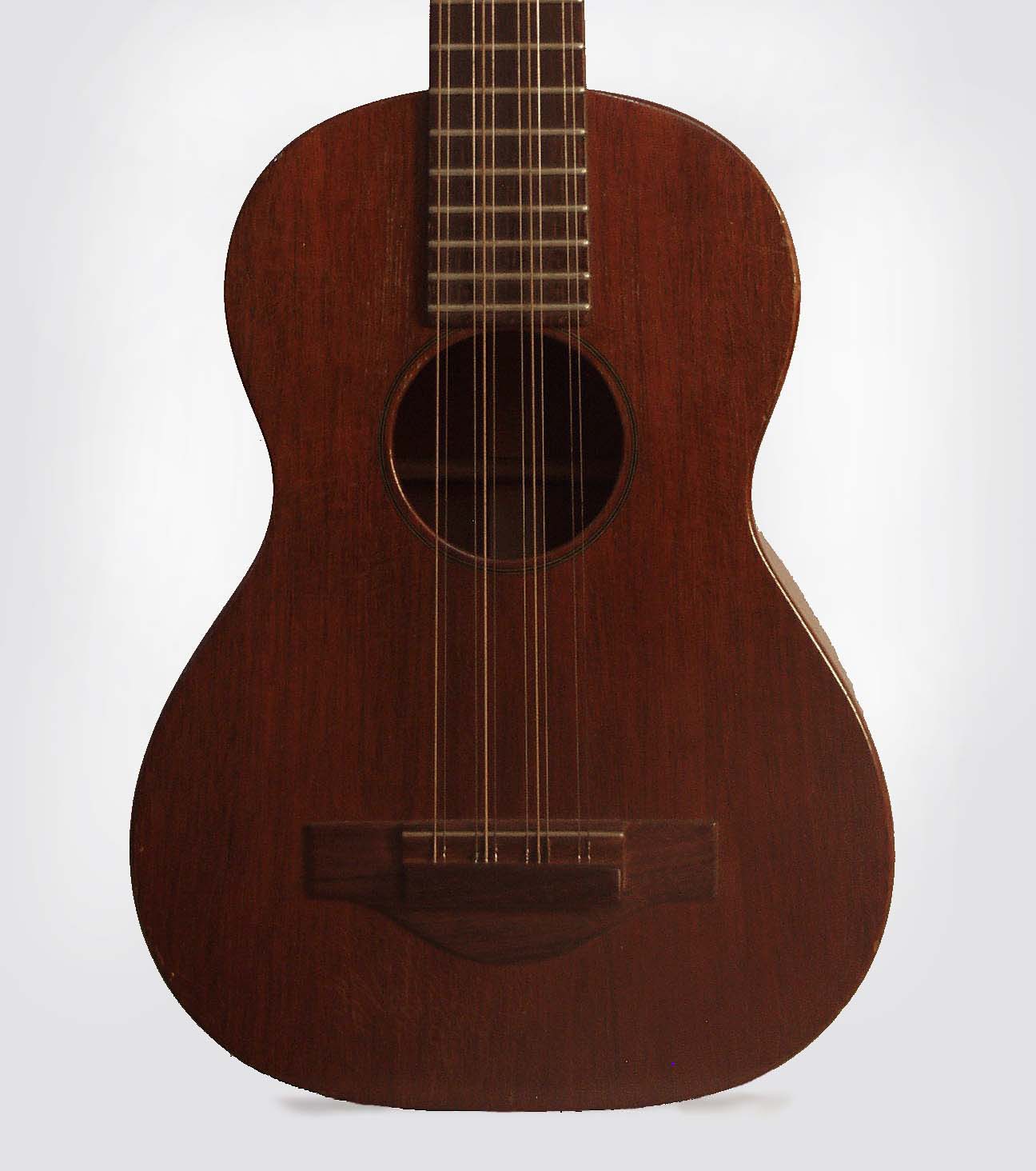 A very nice Martin Tiple from the 1950's. The T-17 model was Martin's simplest Tiple, all mahogany with the plainest ornament. These later examples have an X-braced top and were built somewhat more sturdily than the first 1920's models. The bridge, headstock overlay and fingerboard are rosewood, the nut is ebony. The gold C.F. Martin decal adorns the headstock, while tuners are plastic-button nickel-plated Waverly strip units. There is no binding ,and the fingerboard holds four simple dot inlays. This Tiple is well-preserved and includes the original chipboard case.