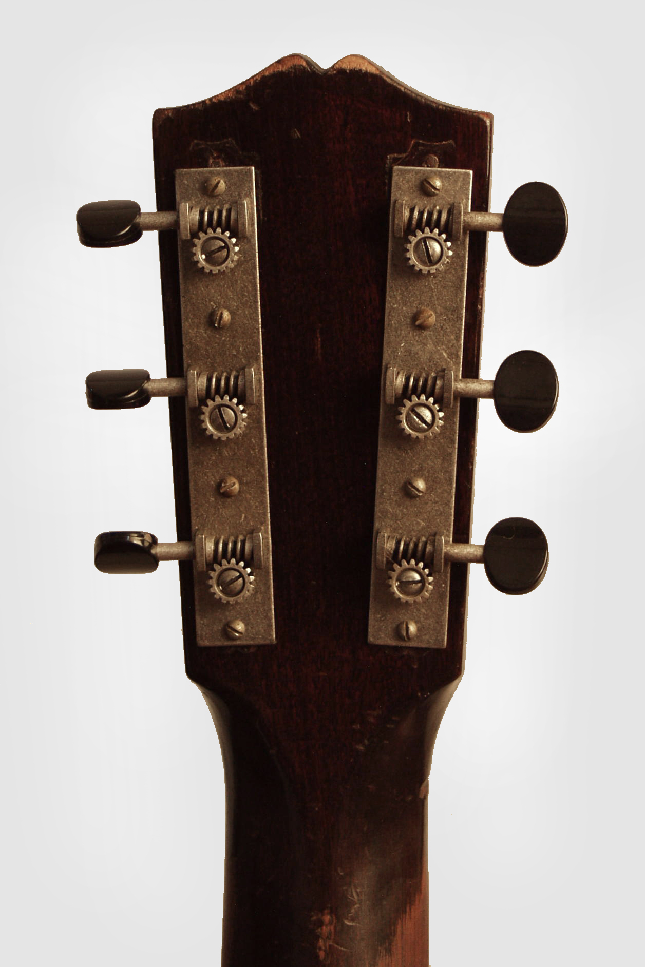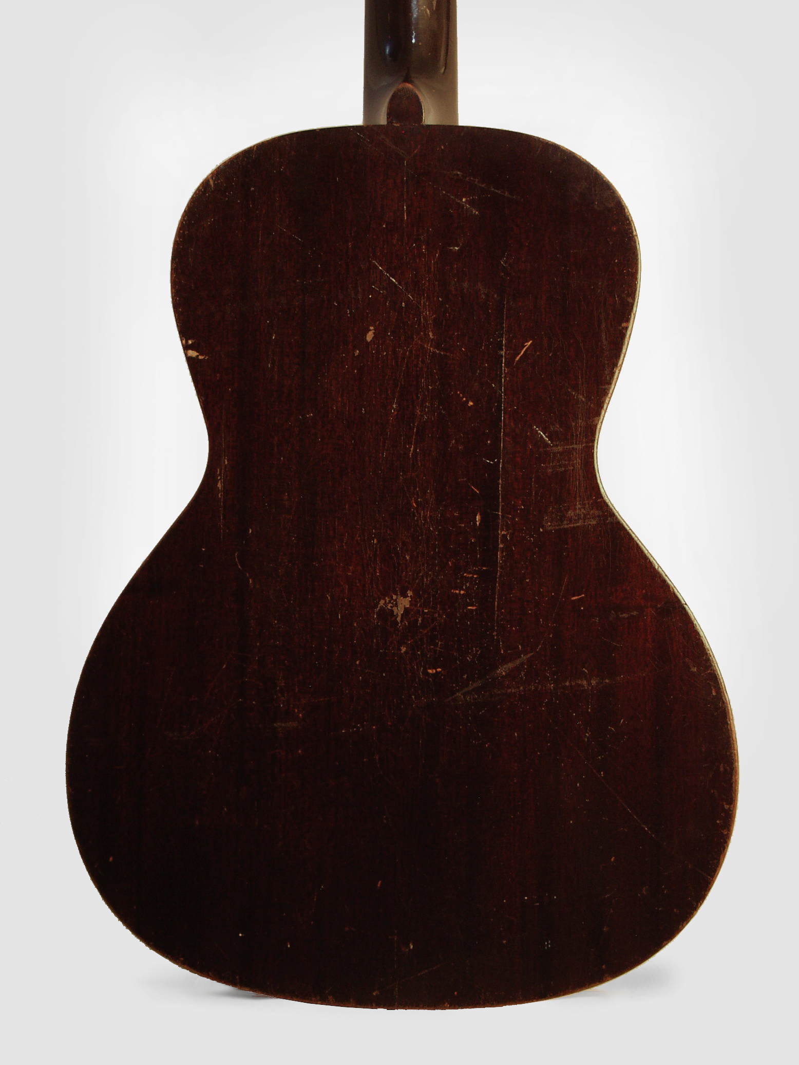 Overall length is 39 7/8 in. (101.3 cm.), 14 3/4 in. (37.5 cm.) wide at lower bout, and 4 3/8 in. (11.1 cm.) in depth at side, taken at the end block. Scale length is 24 3/4 in. (629 mm.). Width of nut is 1 3/4 in. (44 mm.). Top in very good shape except for some wear around the soundhole, quite a bit of wear to the back and one long and inexpertly repaired (but solid) grain crack. New repro tuners, all else original. A really good player with a lot of soul! Very Good + Condition.