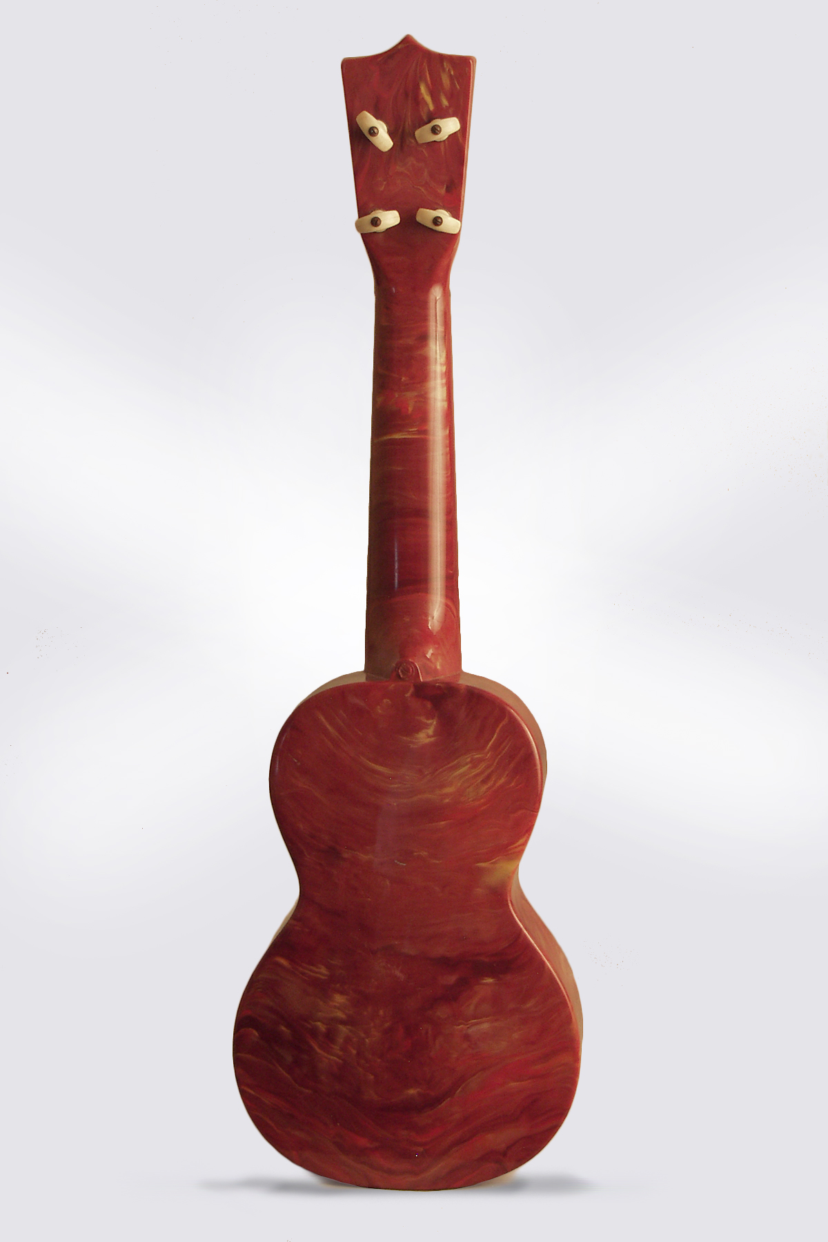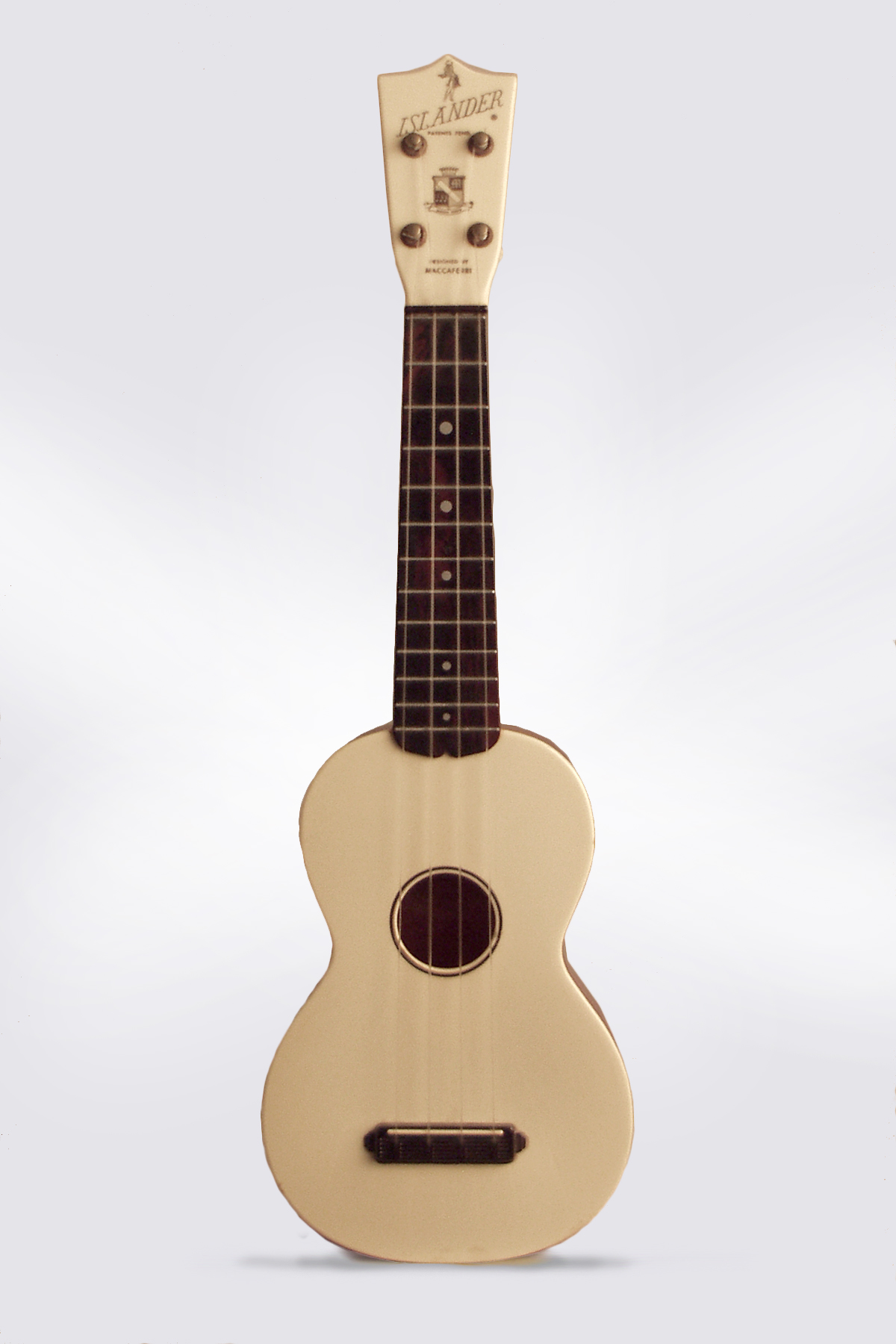 Part of the 1950's Maccaferri empire of "Dow Styron" plastic instruments, the Islander uke is a simple, attractive and surprisingly good-sounding creation. The one-piece molded back/side/neck assembly is made of "grained" polystyrene-in a particularly attractive and somewhat unusual red swirl pattern on this example. The top and headstock face are made of contrasting ivory plastic, with an "Islander" logo, Maccaferri crest and diminutive Hula dancer figure on the head. The dot fingerboard markers are screened on to the brown plastic board. Tuners metal are friction pegs with ivory plastic buttons. A very nice piece of playable Populuxe whimsy, playable in the bathtub or a great "beach uke"!