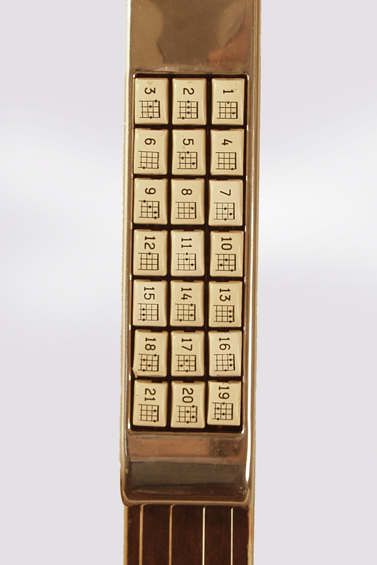 "Somebody paid a lot of money back in the late 1920's in order to avoid learning how to play the thing" is the classic KeyKord quote about this instrument from Tom Wheeler's AMERICAN GUITARS, and it still about sums up the story! The KeyKord series out of Chicago were a specialty contract for Stromberg-Voisinet, who later became Kay. They came with unfretted necks fitted with elaborate chord-fingering machinery mounted in a metal box above the fingerboard. The idea was instead of actually fingering chords, the player pressed a little illustrated tab with the chord symbol on it, strummed and voila!-the instrument played the chord for you!