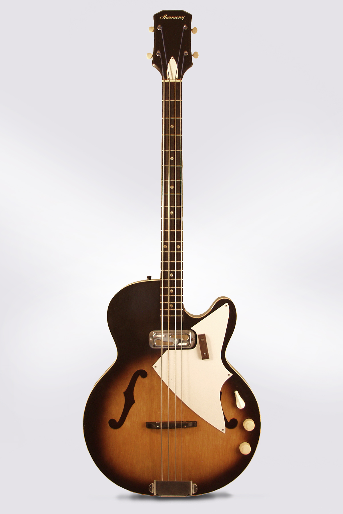 Harmony H-22 Model Electric Bass Guitar (1962), made in Chicago, sunburst lacquer finish, laminated maple body, maple neck with rosewood fingerboard.