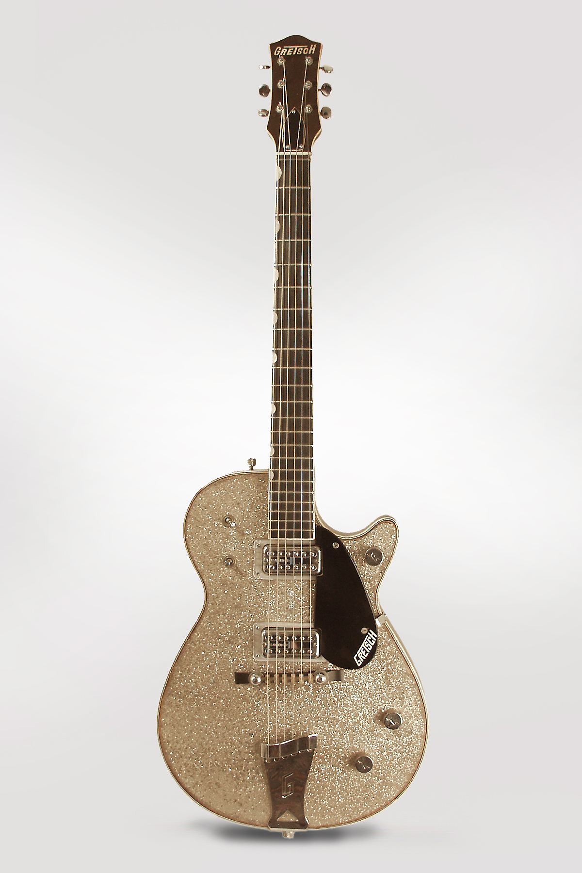 In 1961 all these models went to a double cutaway body style; the Filter'Tron equipped single-cut Silver Jet was in production for only about 3 years...by which time Gretsch charged an extra $20.00 for the sparkle feature! The Silver Jet remains one of the most collectible of Gretsch guitars; along with the White Falcon it represents the Gretsch aesthetic at its most exuberant.