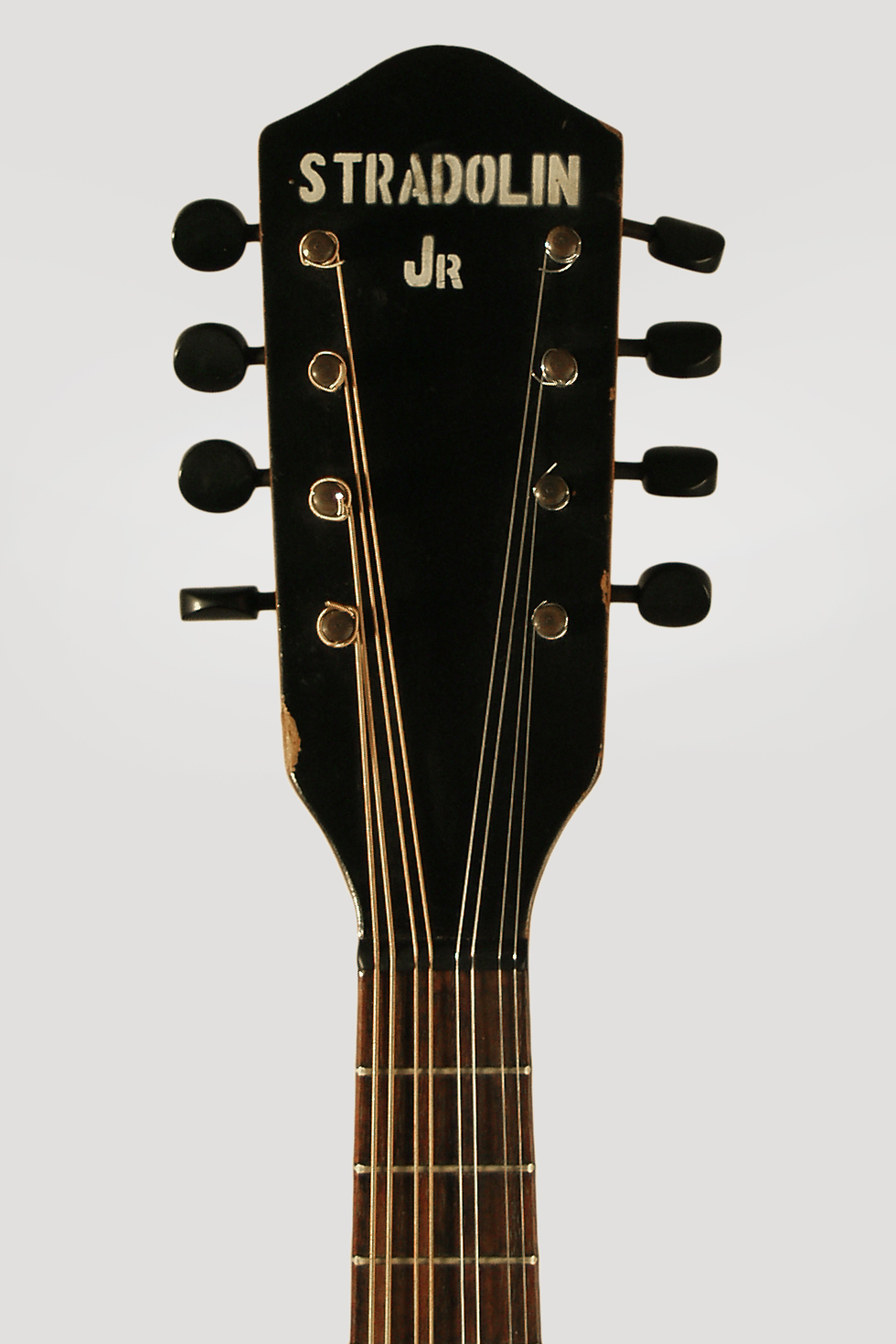 Overall length is 25 1/4 in. (64.1 cm.), 9 7/8 in. (25.1 cm.) wide, and 2 in. (5.1 cm.) in depth, measured at side of rim. Scale length is 13 3/4 in. (349 mm.). Width of nut is 1 1/4 in. (32 mm.). A very nice and fairly clean early Strad-O-Lin Jr. some small dings and overall checking but really a nice mandolin; the only really noticeable defect is a ding on the headstock edge by the low G tuner. An excellent playing and sounding instrument, like all these early Strad-O-Lins a fine value for the price. Excellent Condition.