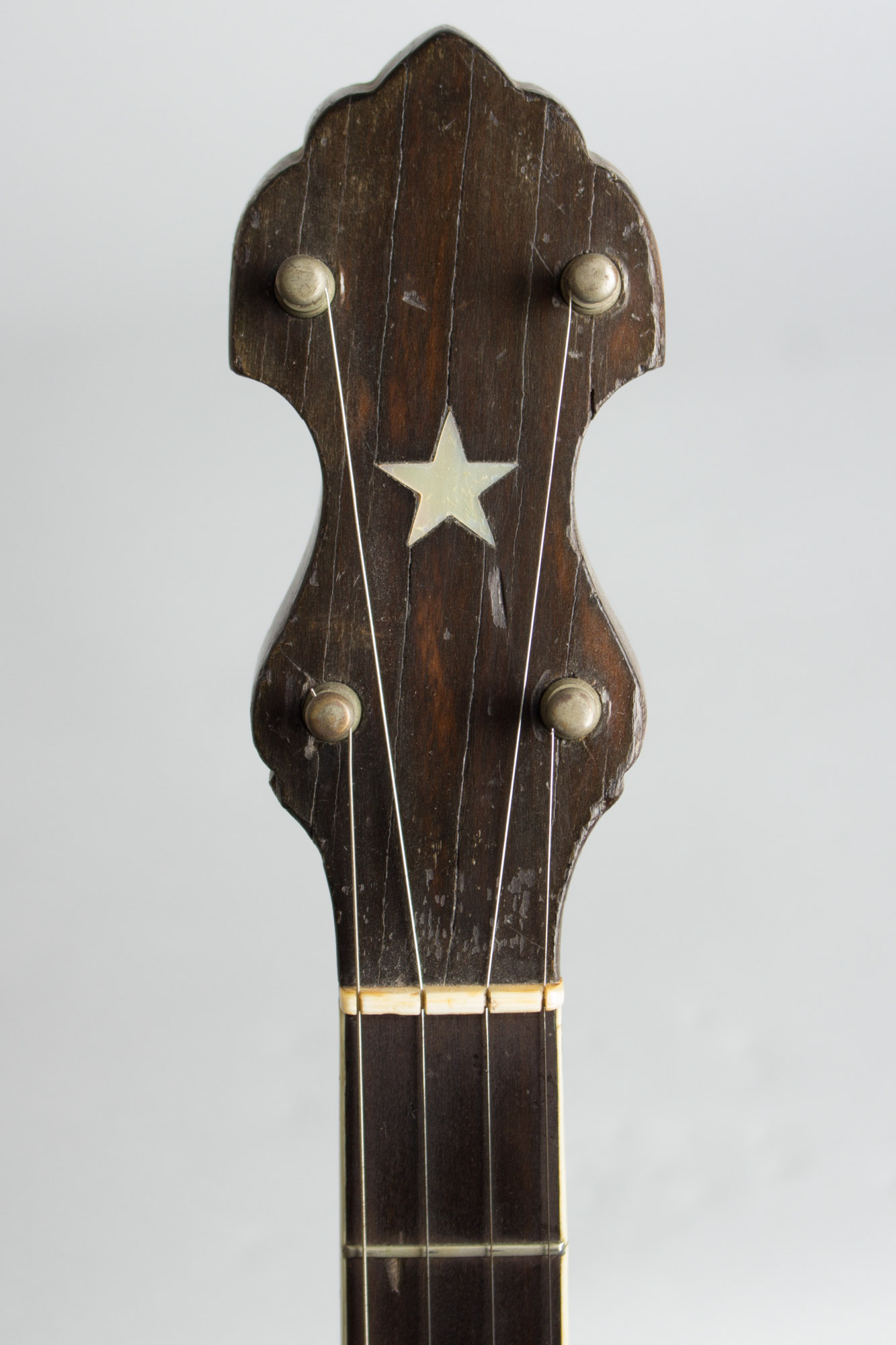 This lovely banjo one of the earliest Bacon-branded instruments ever made, dating to the first year or so of Fred Bacon's company's beginnings. Bacon banjos from this era are relatively rare, as they were essentially a private brand and Bacon had just begun his instrument marketing efforts. Although marked "Hartford CT" and stamped with serial # 106 this instrument was built for Bacon by Vega in Boston in 1907; there was no Bacon factory in this period. This is not a fancy style, with a plain maple rim and mahogany neck with only small shaped pearl inlay in the bound fingerboard and a pearl star in the headstock but like all Bacon and Vega banjos is built to the highest quality standards. Plainly ornamented but very finely made, this is also just a very good sounding 5-string with the unique Bacon internal resonator system.