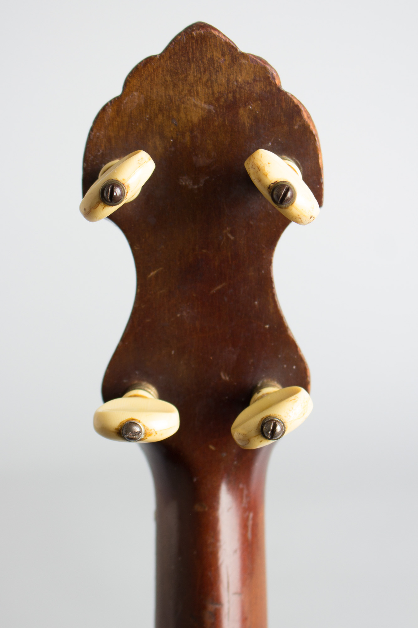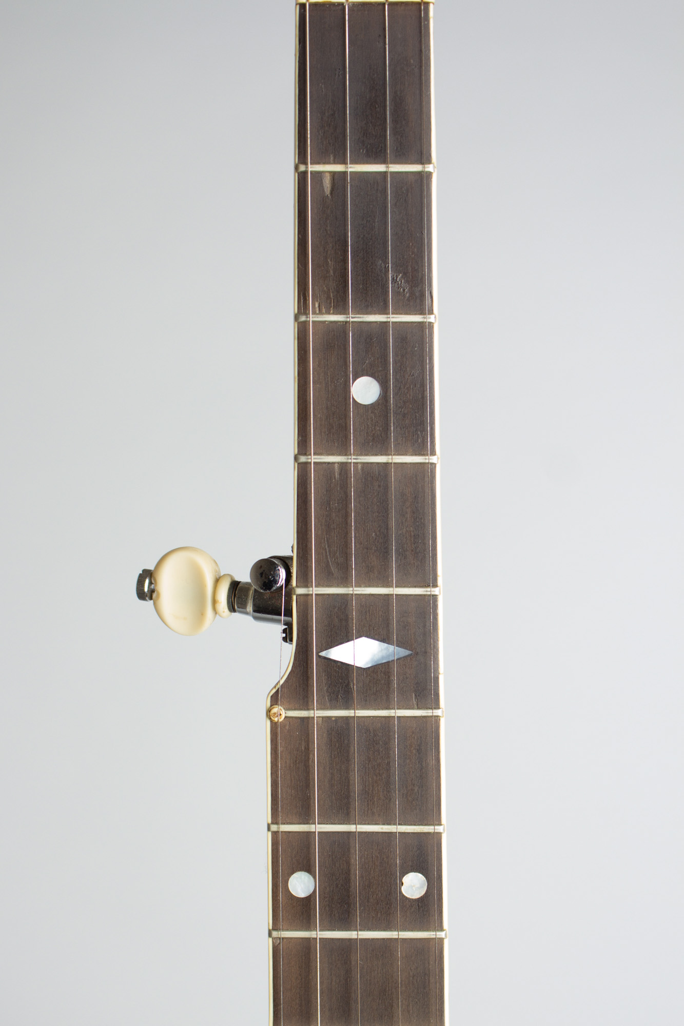 Overall length is 36 in. (91.4 cm.), 10 7/8 in. (27.6 cm.) diameter head, and 2 3/4 in. (7 cm.) in depth, measured at side of rim. Scale length is 26 in. (660 mm.). Width of nut is 1 1/4 in. (32 mm.). This banjo has a decent amount of wear overall but remains a very good player. There is a lot of wear to the back of the neck-it looks like some some of capo was used that left small round indents up to around the 8th fret region, along with some general finish wear and scrapes to the wood. The 5th string tuner is an unusual later fitting with two flanged screws securing it, and the wood was dressed away a bit on the side of the neck to fit it. The other tuners, tailpiece and 21 of the hooks are original; the remainder of the hooks are older Slingerland-style cobra-head pieces. The frets remain lin excellent shape with surprisingly little wear and overall this banjo is very functional, with a cool if worn-in vibe and the fairly bright sound typical of the Bacon FF. Excellent - Condition.