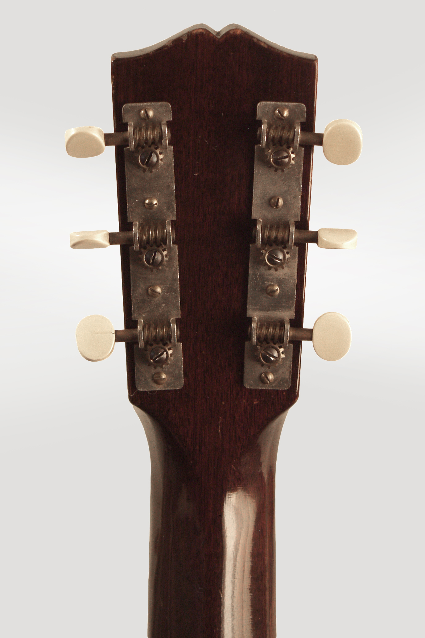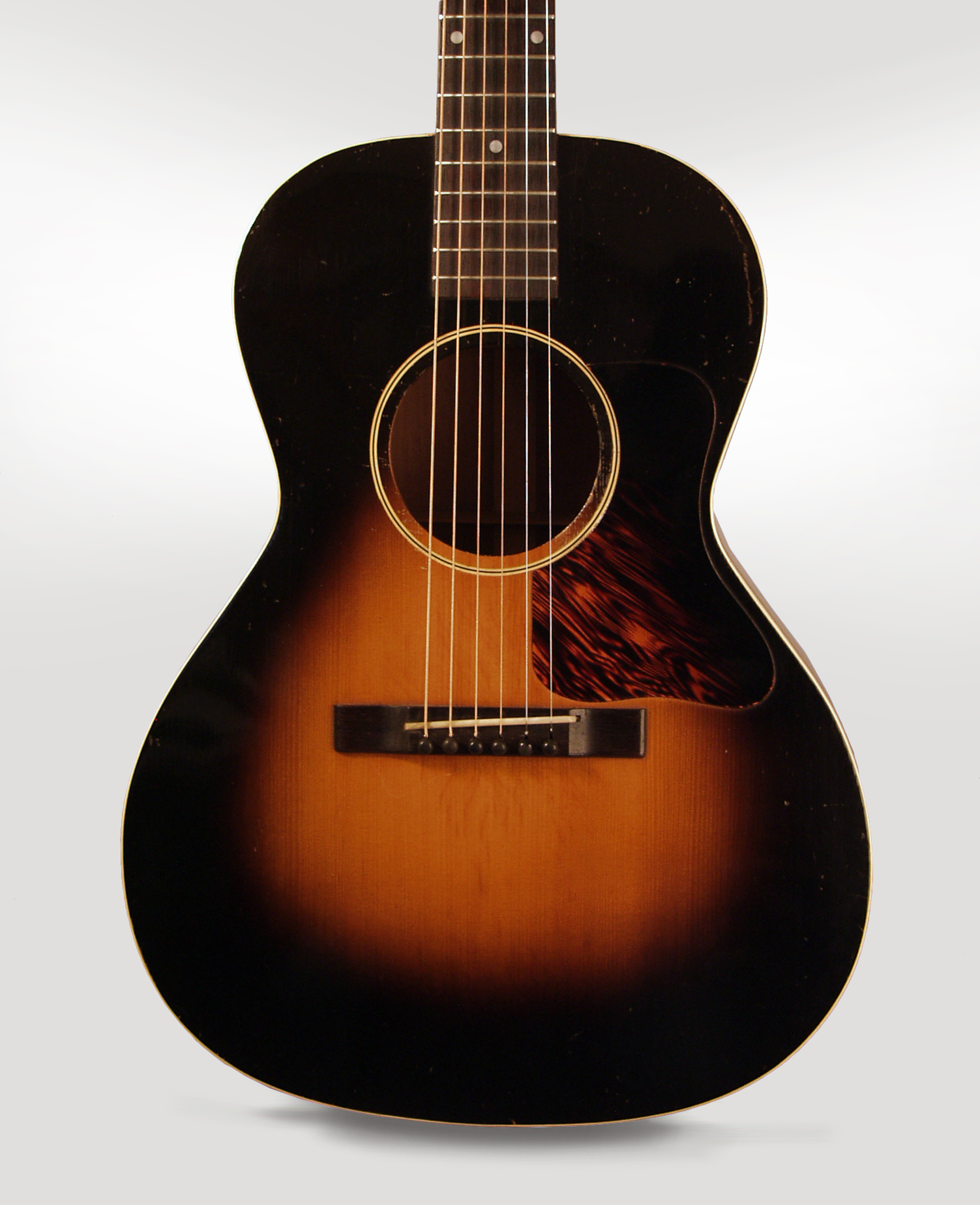 Overall length is 39 3/4 in. (101 cm.), 14 3/4 in. (37.5 cm.) wide at lower bout, and 4 3/8 in. (11.1 cm.) in depth at side, taken at the end block. Scale length is 24 3/4 in. (629 mm.). Width of nut is 1 3/4 in. (44 mm.). This is a lovely clean and original guitar with no major wear, just some typical small dings, scrapes and checking to the finish. The sunburst top is hardly faded at all and the top itself shows very little pickwear. Amazingly there are no cracks anywhere; there are a couple of small chips on the headstock by the nut. The guitar has had a clean neckset and plays extremely well. The frets show some wear in the lower positions but not enough to affect play. The only alteration is the original bridge has been lowered slightly and an added strap button to the heel-otherwise original right down to the bridgepins. Simply one of the nicer pre-war small body Gibsons we have had in a while. Excellent - Condition.