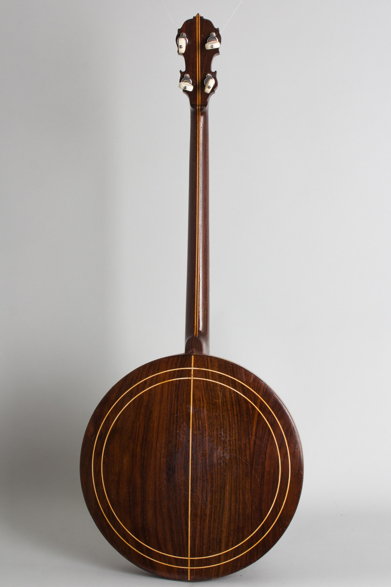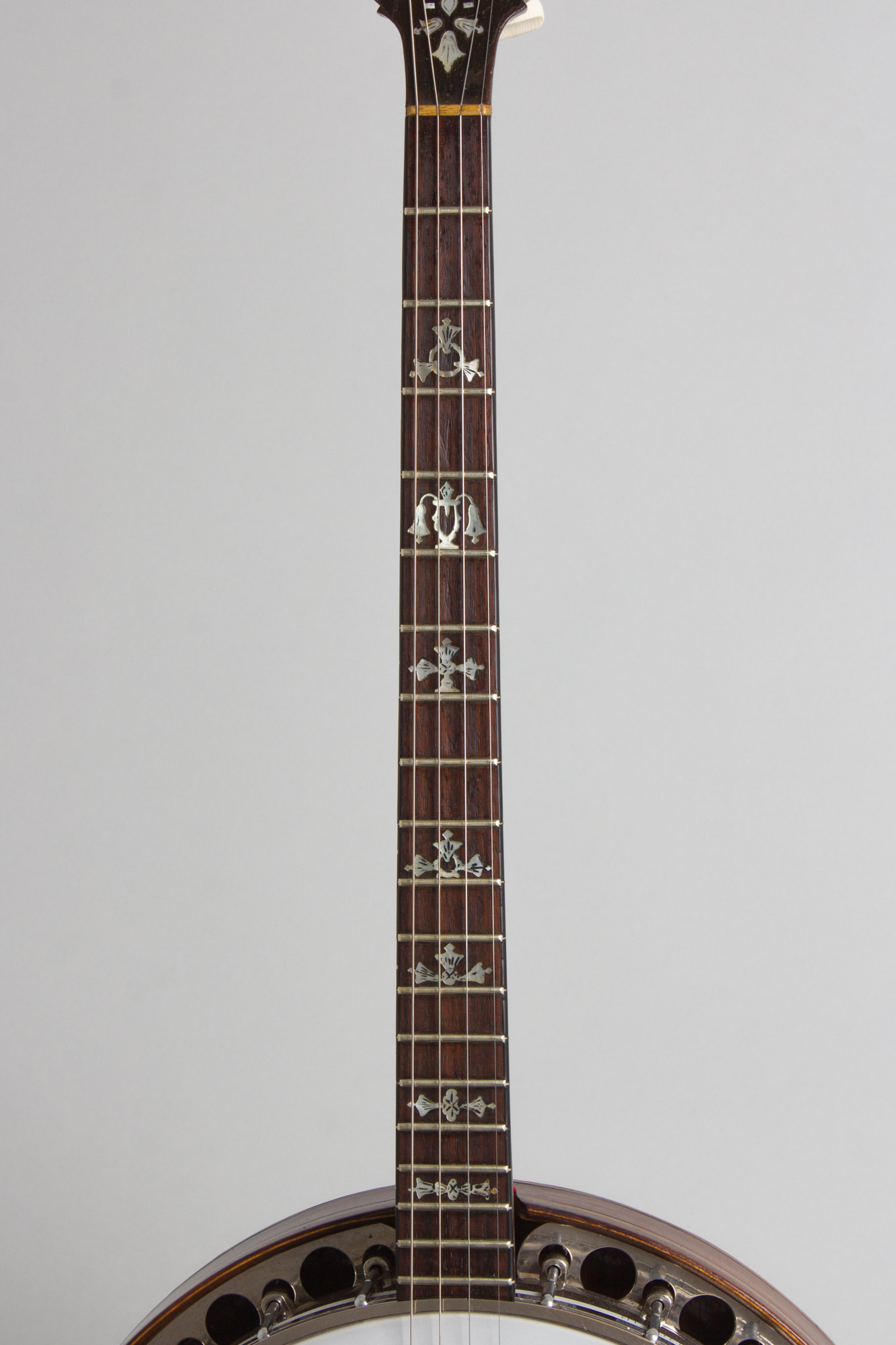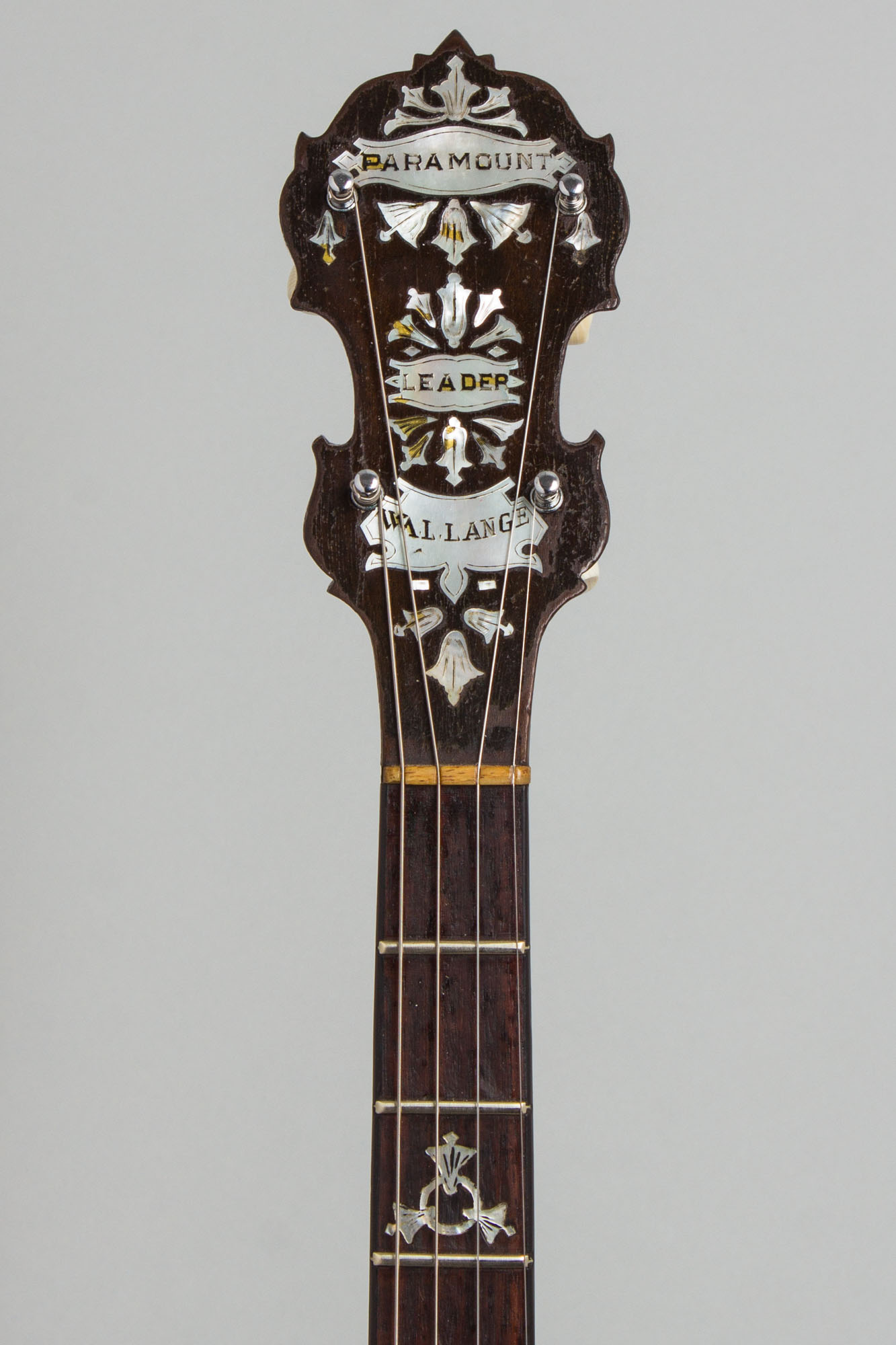 This is a good player's example of the all-rosewood Leader, one of William Lange's classic 1920's Paramount models. While not as fancy as some of Paramount's other high end banjos (although fancy enough!) the Leader embodied Lange's theory that rosewood was the "finest material for tone" and sold originally for $200, quite a sizeable price in the 1920's.