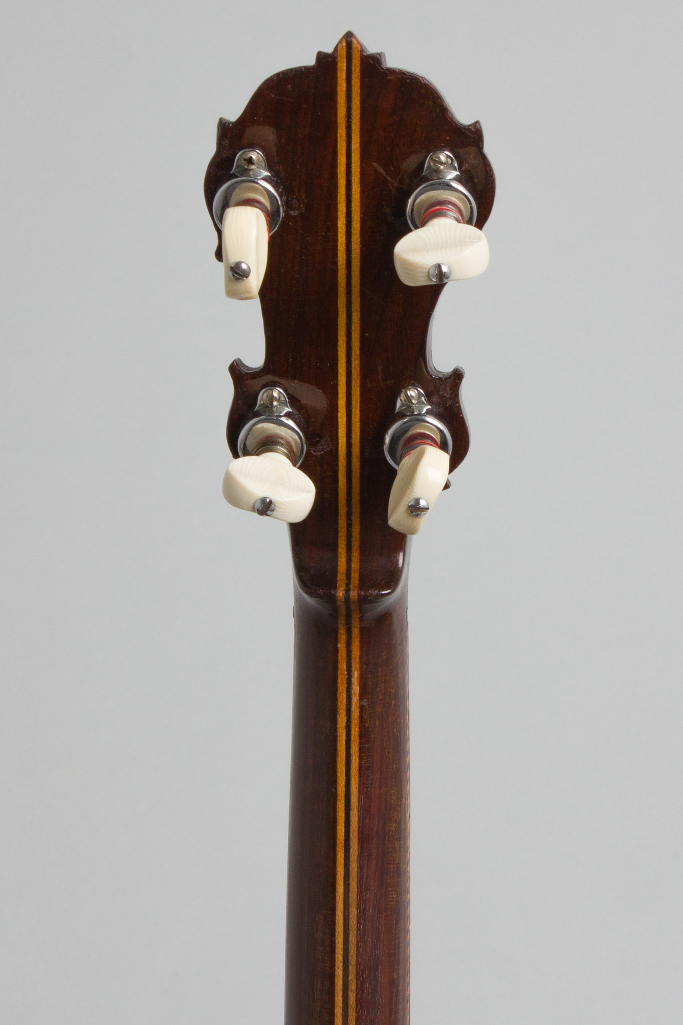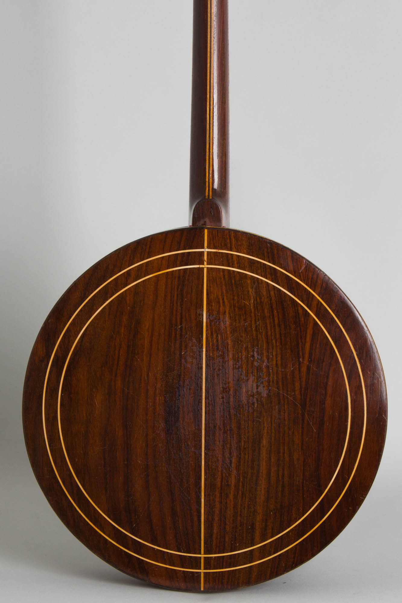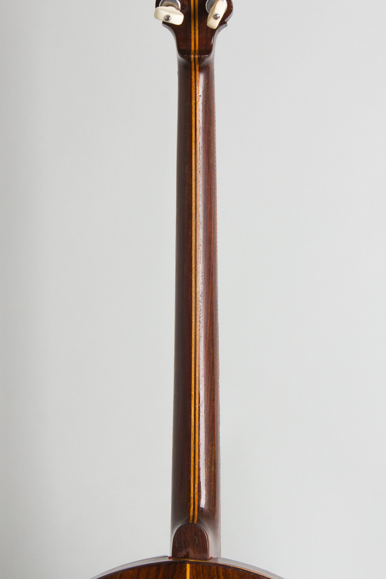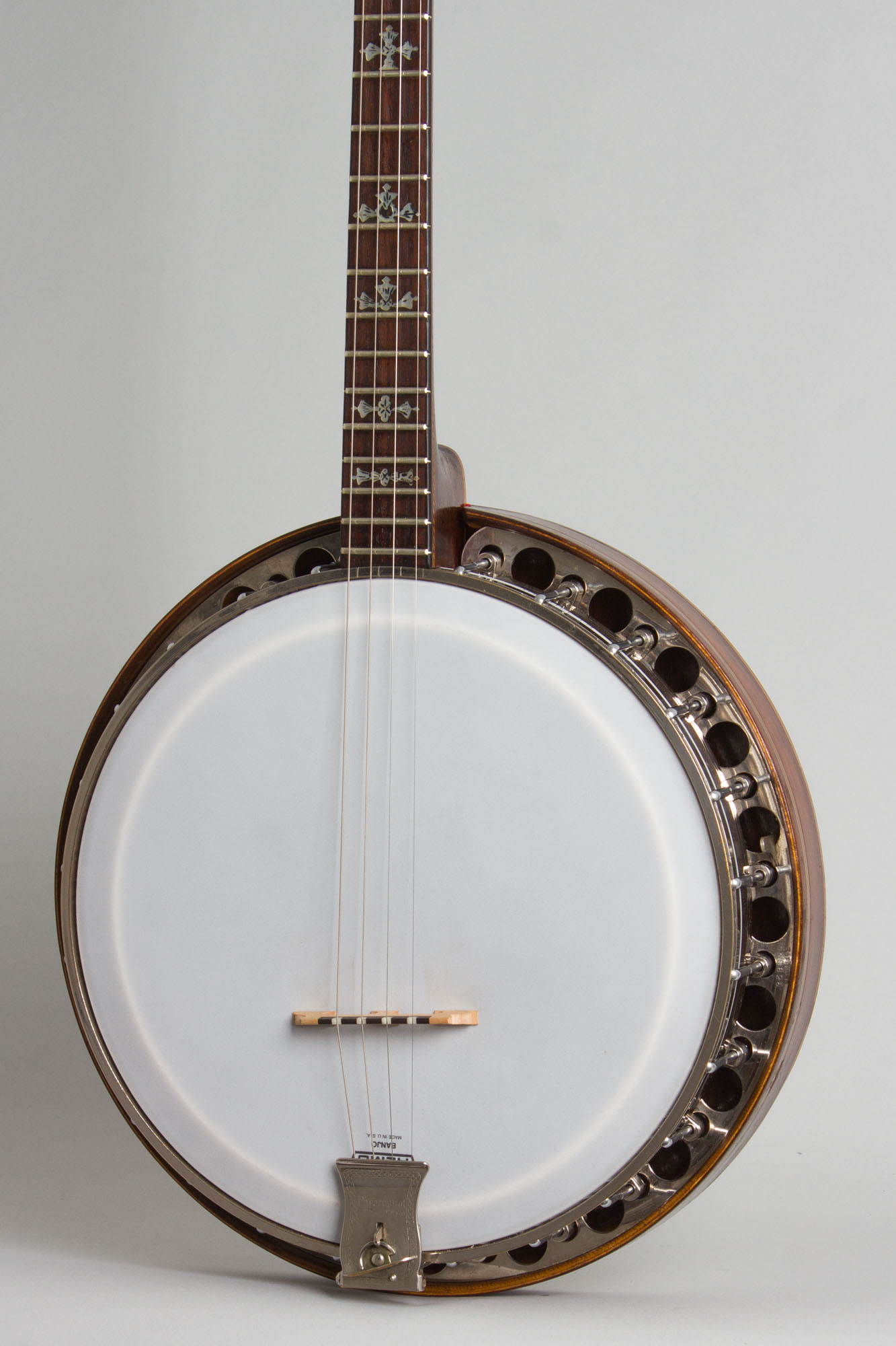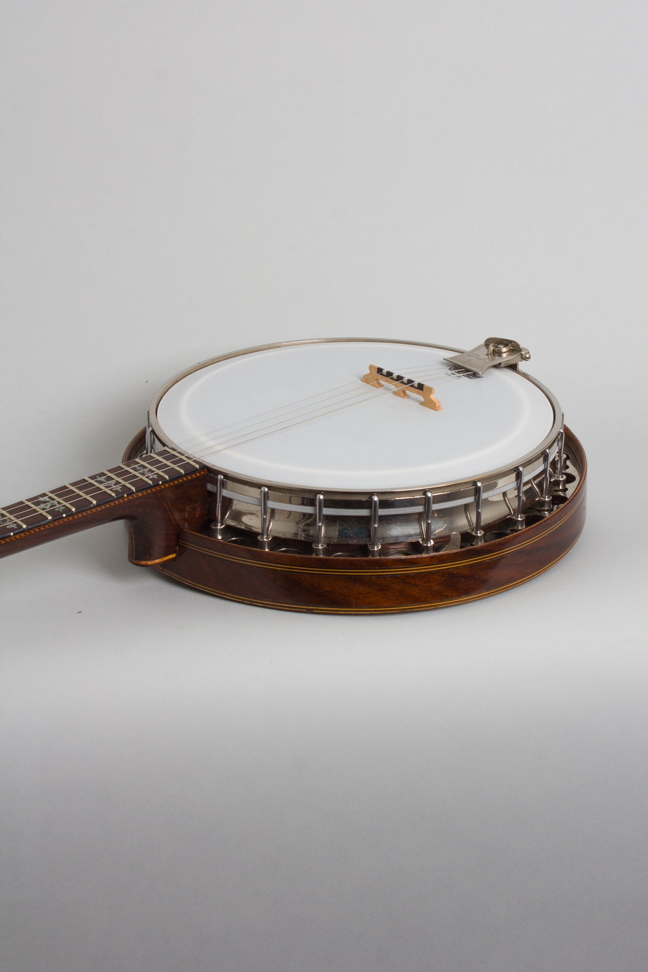 This banjo is in fairly well worn but good playing condition, with some noticeable wear. All hardware is original except the tuners, which are later small-can Page tuners fitted without any additional widening of the holes on the headstock face. There is no armrest fitted but the original tailpiece is intact. The banjo is set up with a plastic head and newer bridge.
