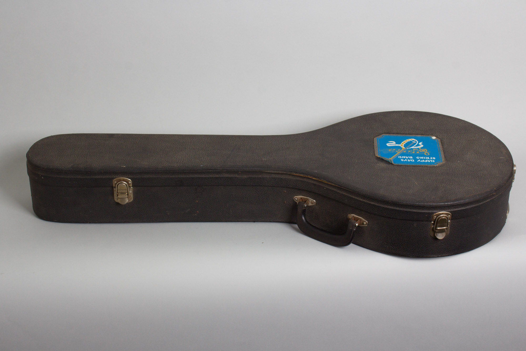 The headstock and fingerboard carry very intricate engraved pearl inlays and multiple contrasting wood bindings adorn the entire instrument; at Paramount's inlay work was extremely fine. The Leader was a popular model in the 1920's, but all Paramount banjos were a favorite of professional Jazz musicians in the 1920's and are frequently seen in period photographs, especially of African-American Jazz Orchestras. This one has been played a lot; it has a sticker on the case lid from the "Happy Days String Band" and a collection of picks and strings in the case from those happy days.