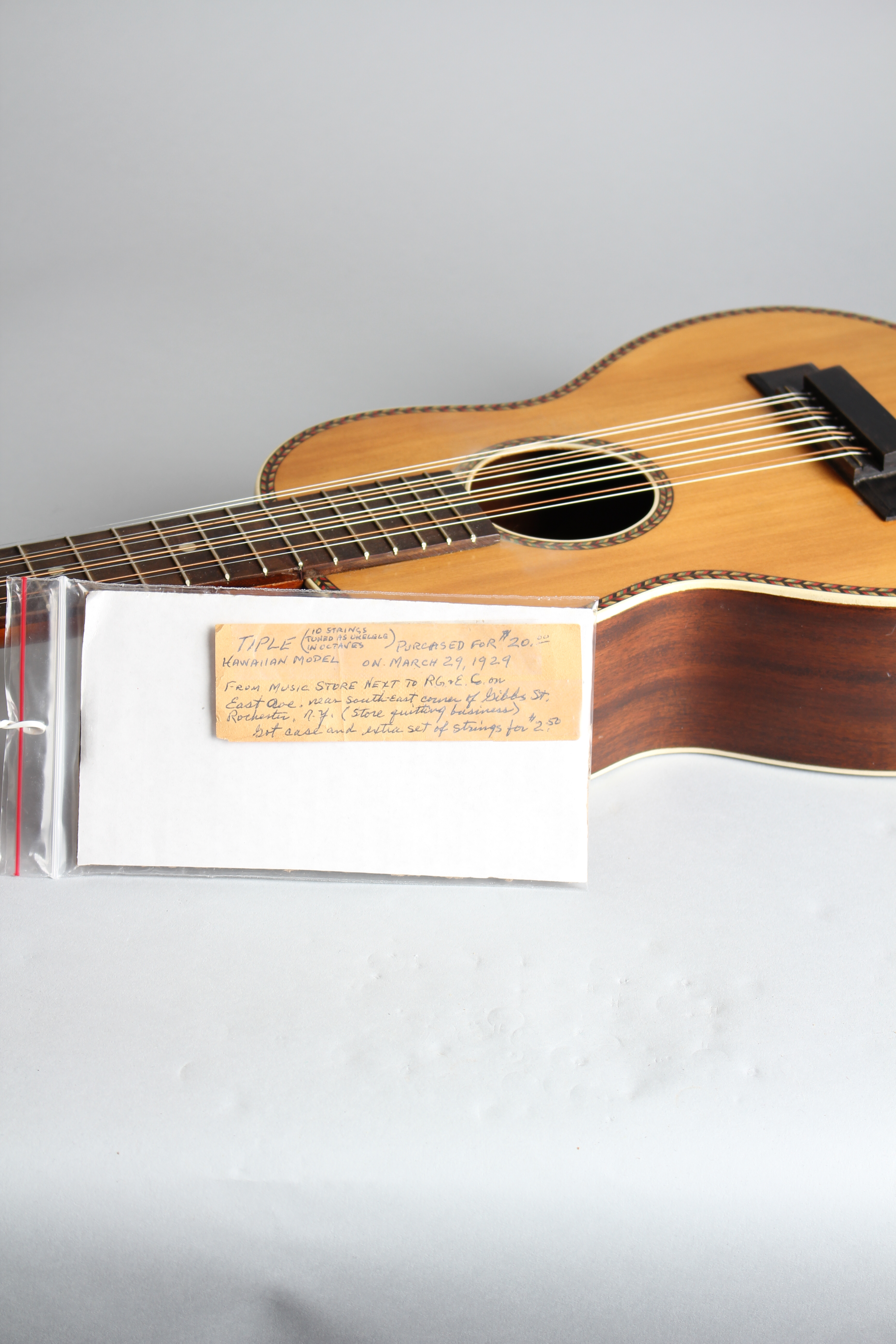 This is a relatively nice Chicago-made 1920's Tiple, built of mahogany and spruce but with fancier ornamentation than the similar Martin T-18. The top is bound with white celluloid and fairly fancy colored wood marquetry around the edge and soundhole, with a dyed maple bridge. The "ebonized" (dyed maple) fingerboard has pearl dot inlay. There is a 1920's Regal "Mark of Better instruments" oval paper label in the soundhole This particular tiple is good sounding and better made than many similar period instruments, not up to Martin standards perhaps but a solid instrument. It includes a neat little handwritten note detailing the original purchase in March 1929-something we wish EVERY old instrument came with!