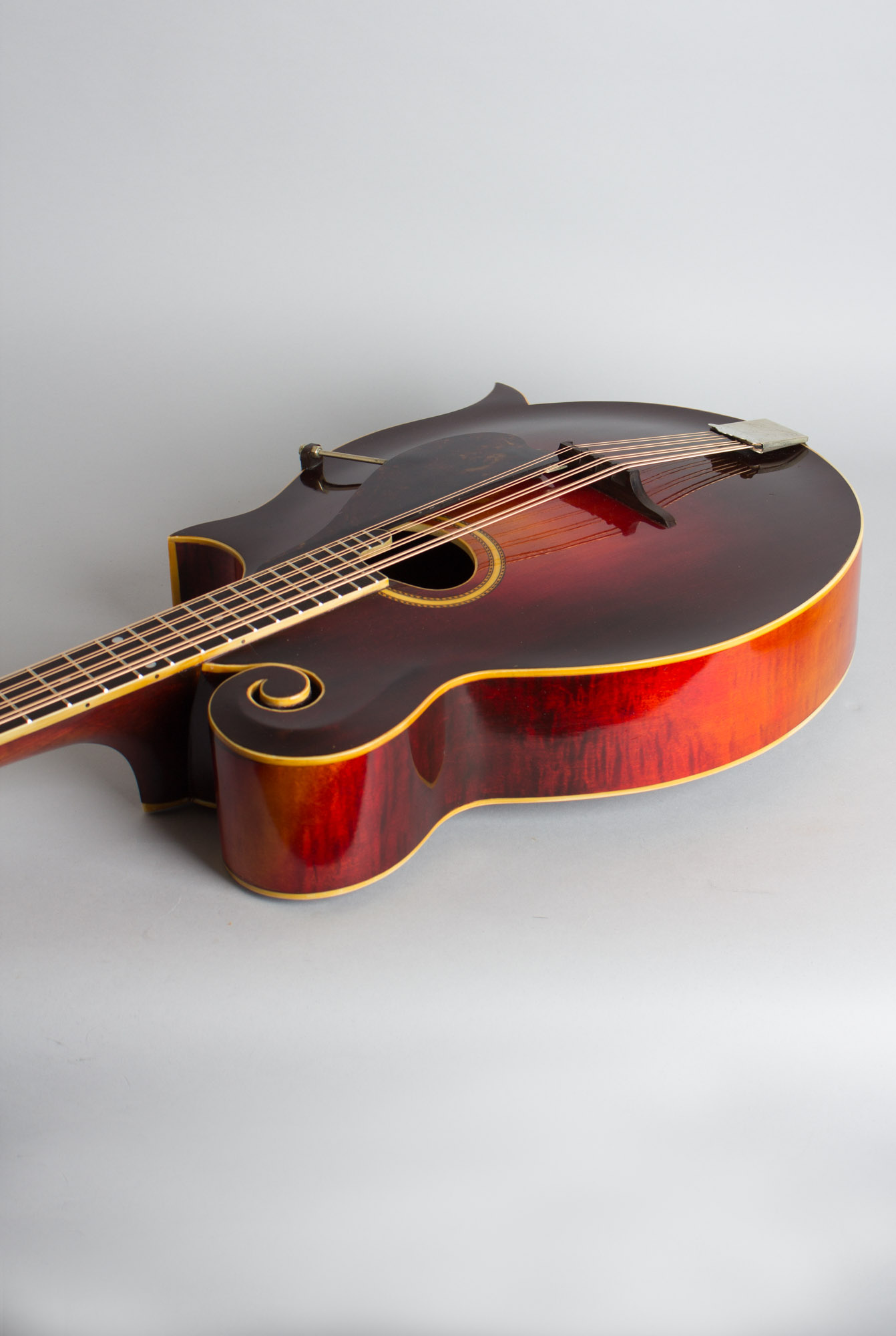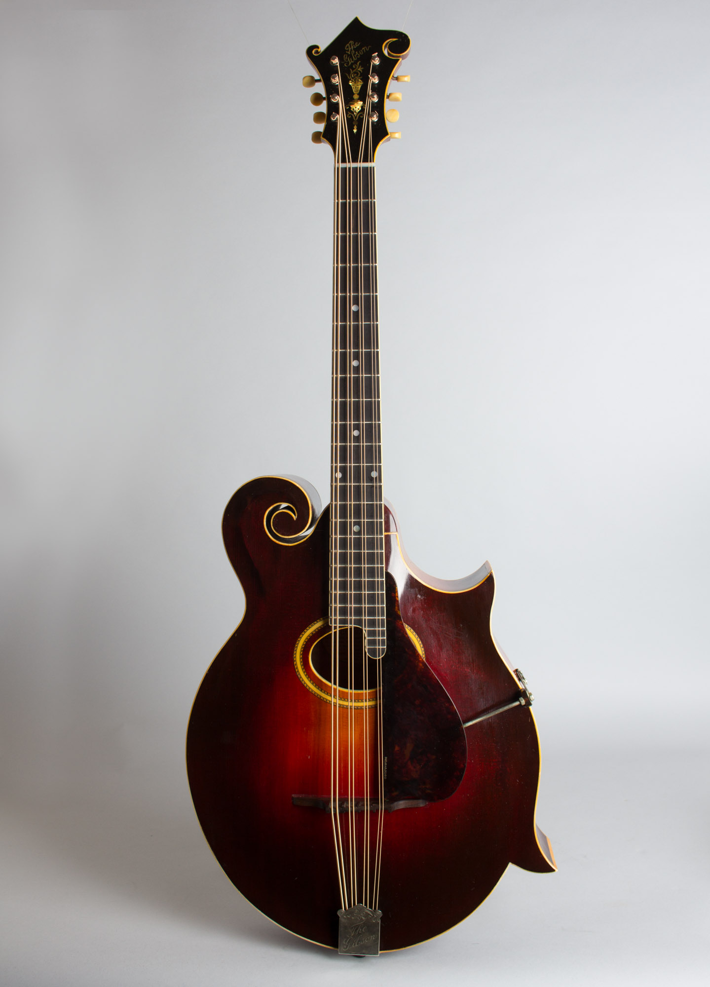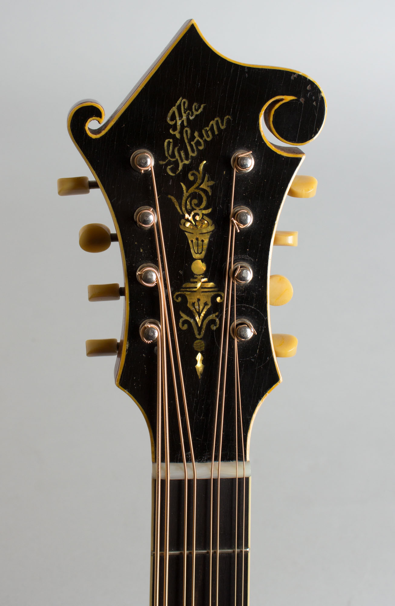 The laminated maple neck has a bound ebony fingerboard and the unique scrolled headstock has the older "The Gibson" pearl logo above the elaborate double flowerpot inlay. The tailpiece is the standard mandolin fitting and the bridge is a solid carved single piece of ebony with a compensating ridge on top.