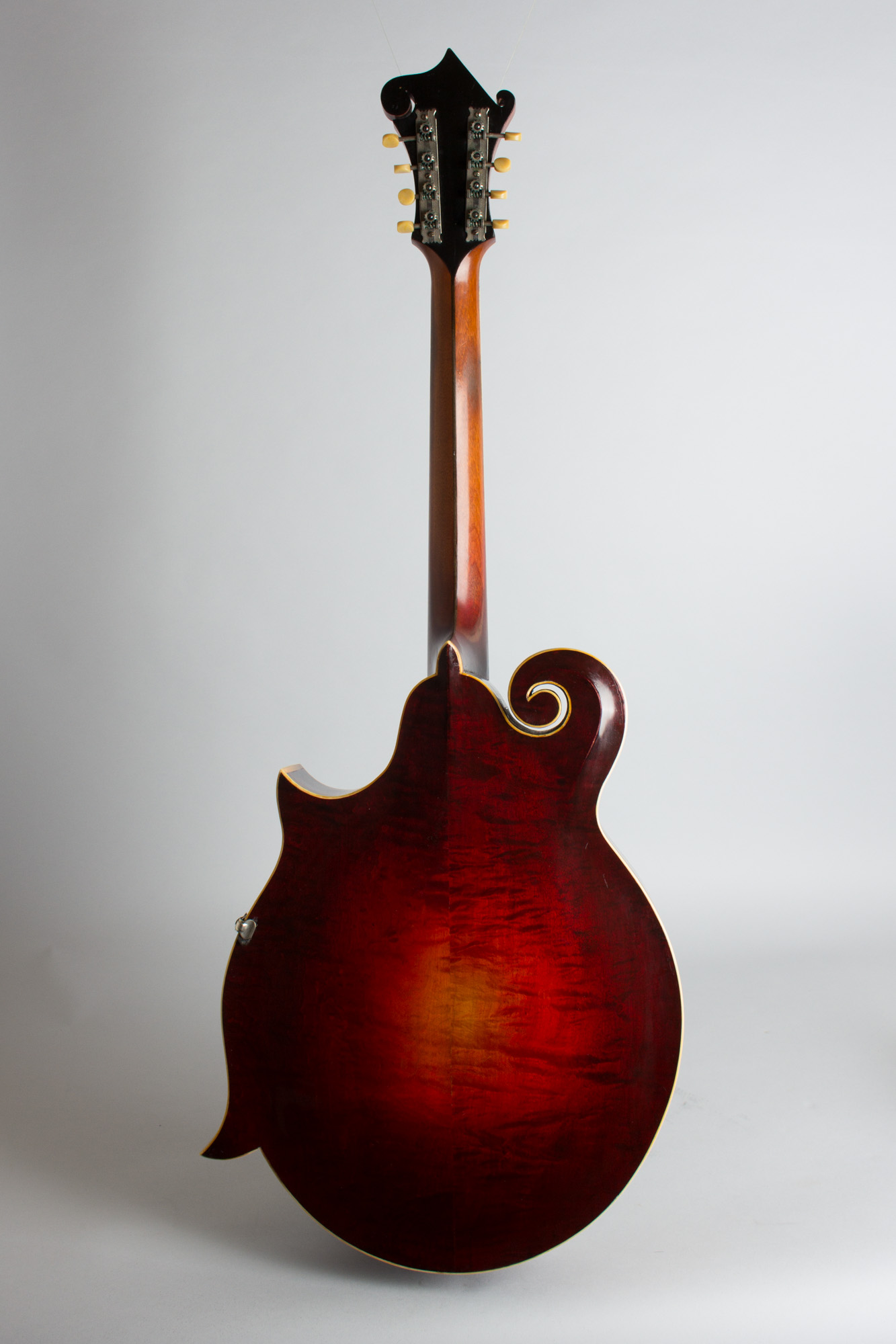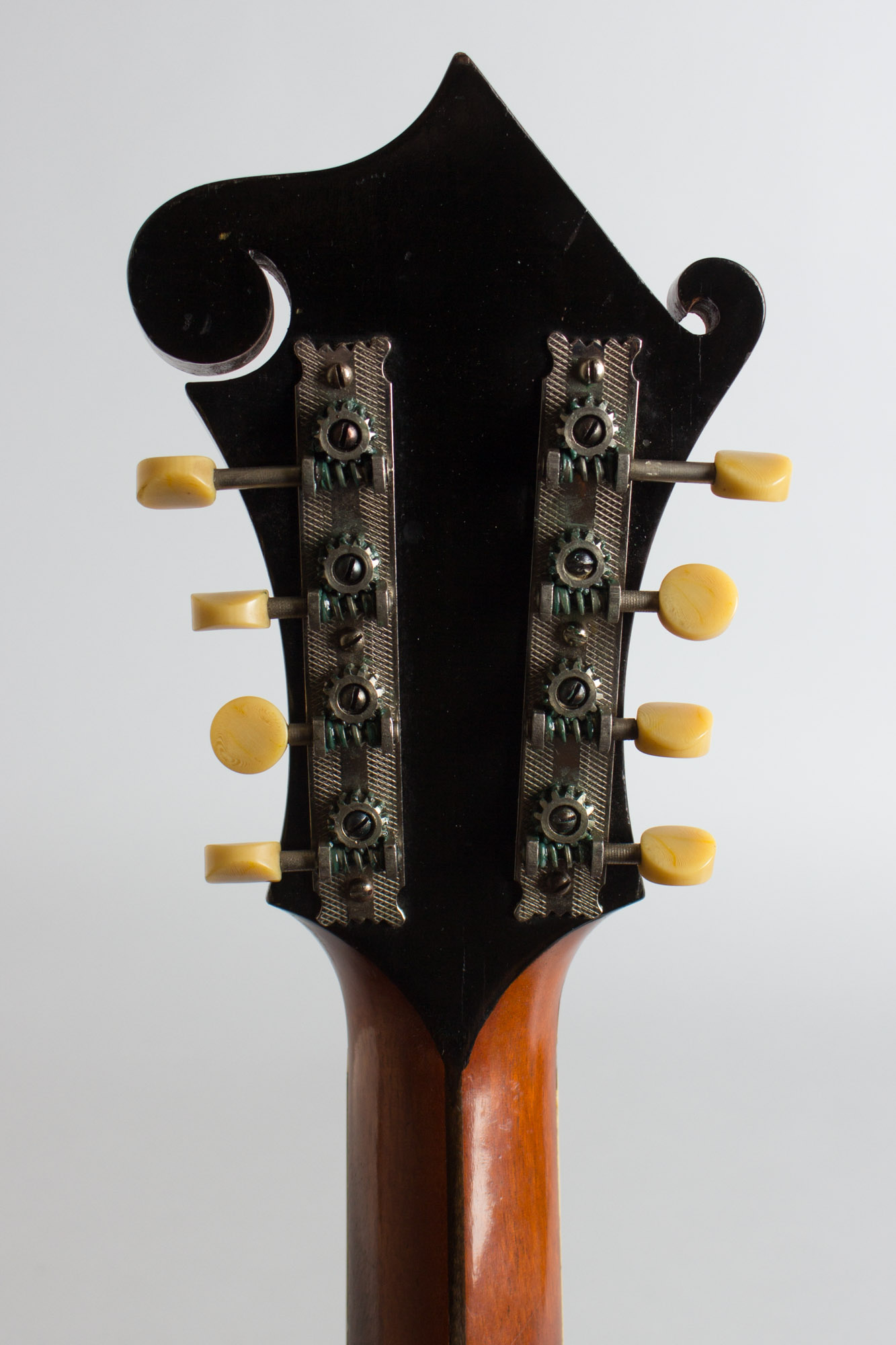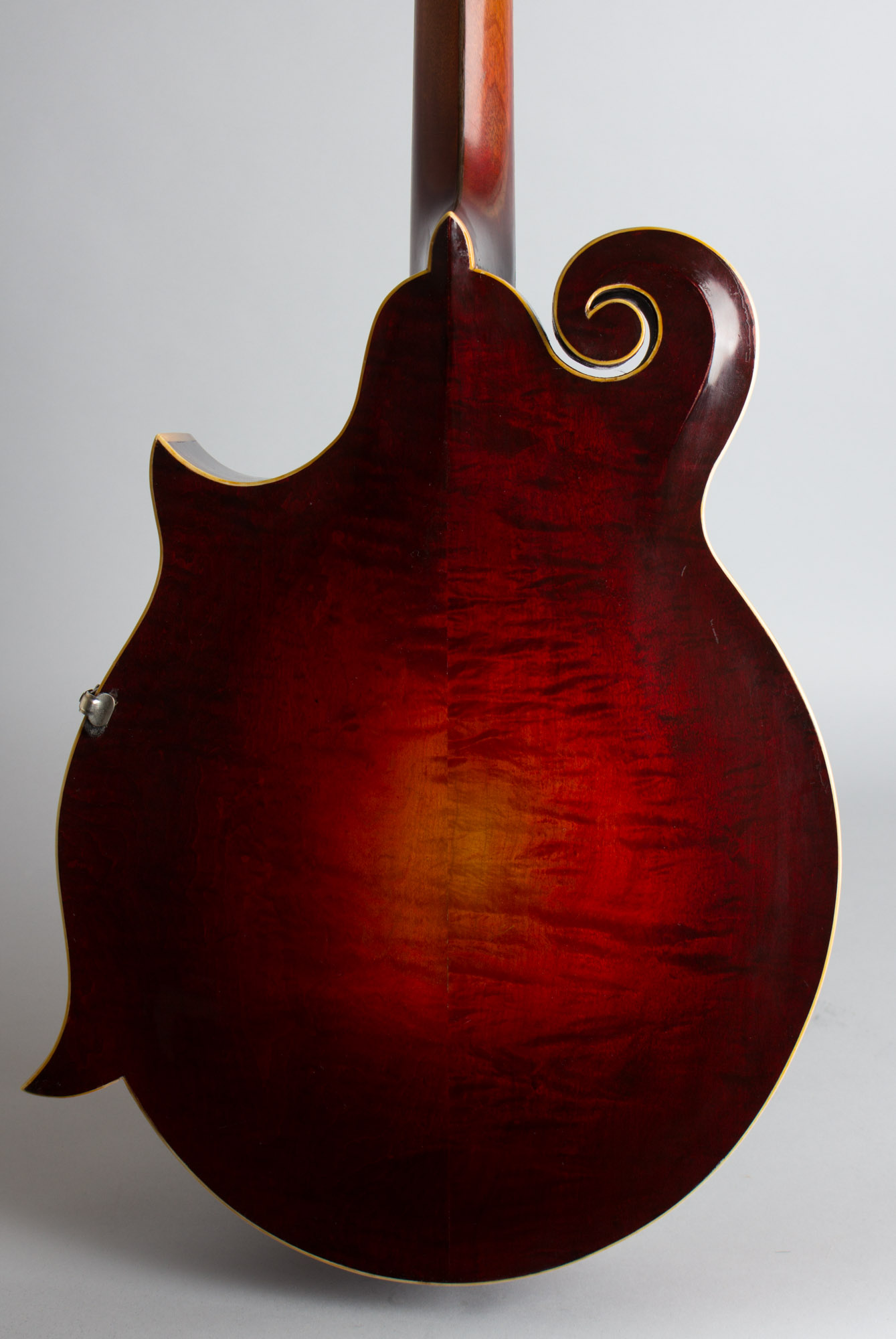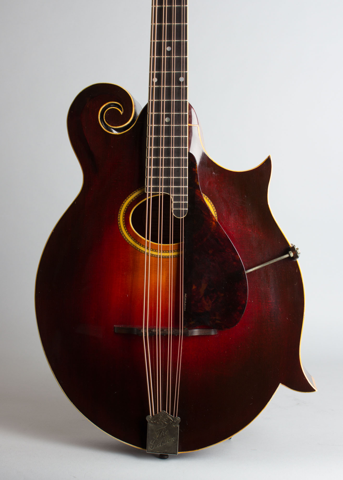 The laminated maple neck has a bound ebony fingerboard and the unique scrolled headstock has the older "The Gibson" pearl logo above the elaborate double flowerpot inlay. The tailpiece is the standard mandolin fitting and the bridge is a solid carved single piece of ebony with a compensating ridge on top.