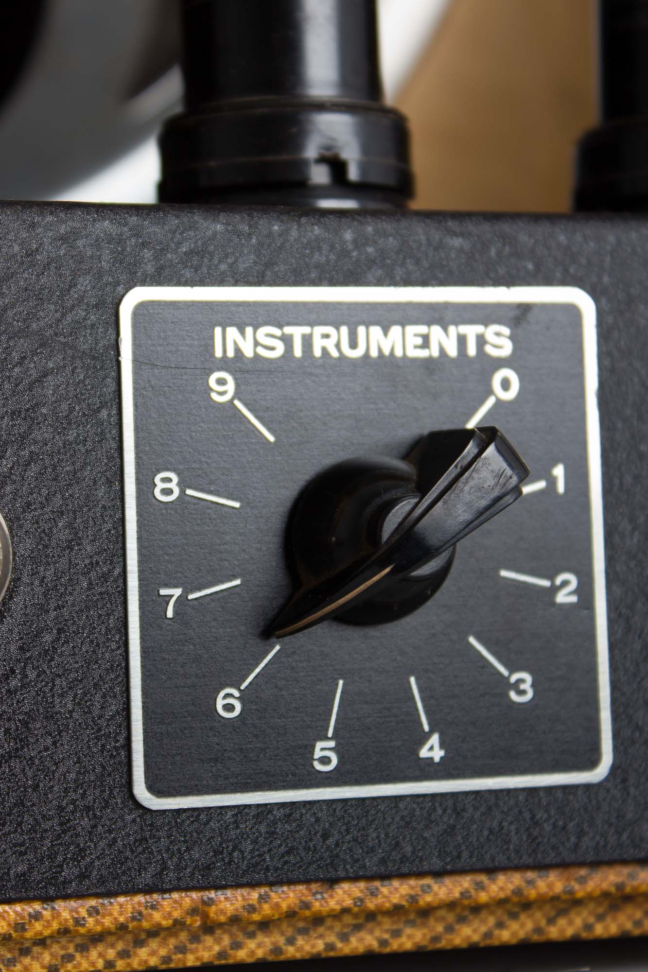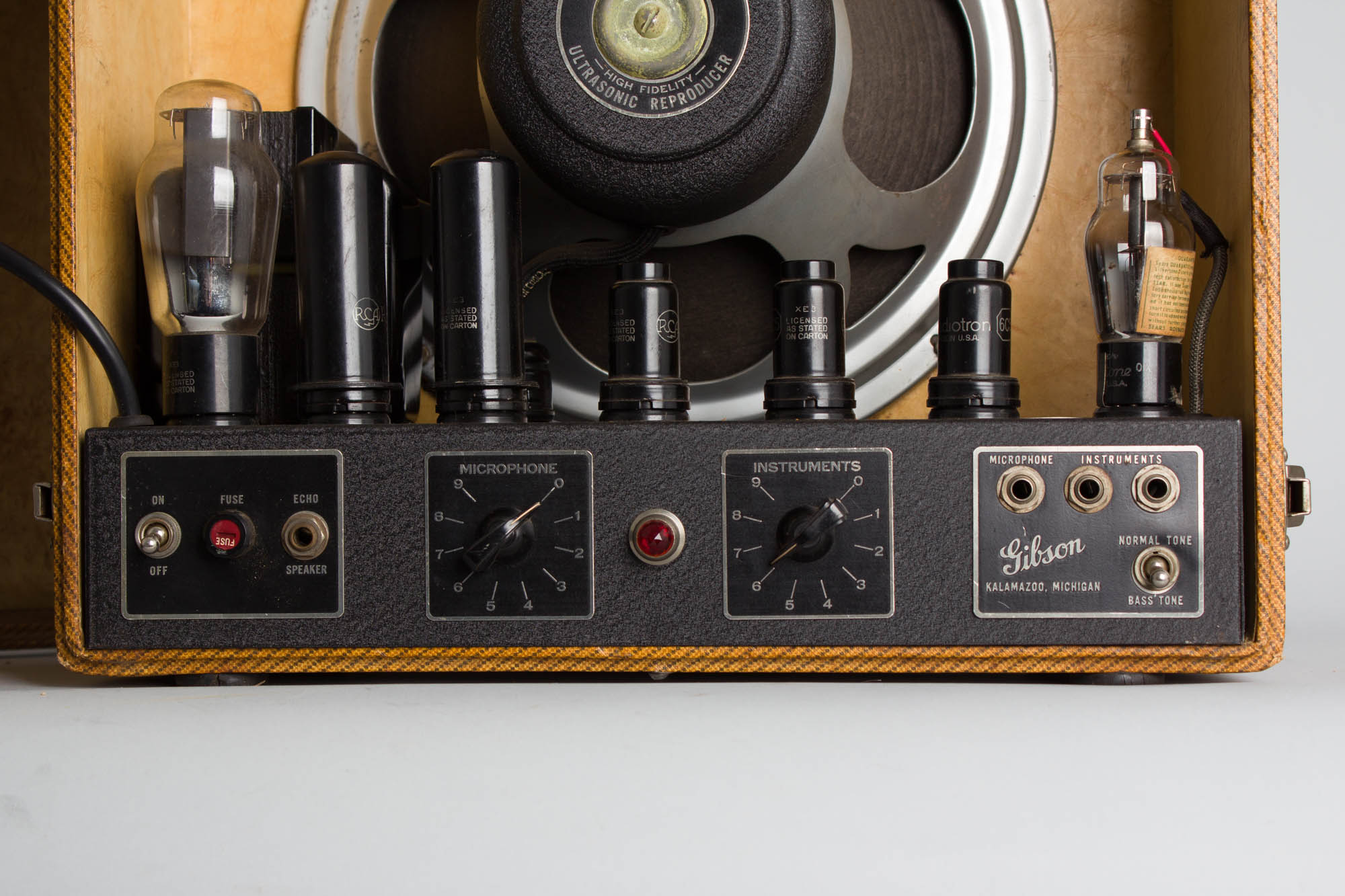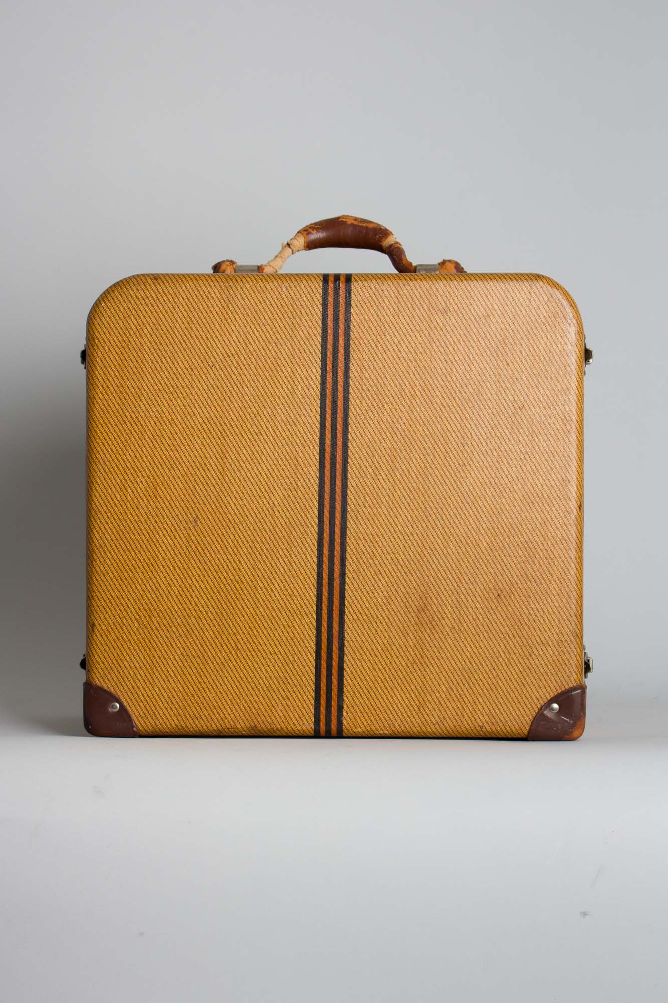 The removable latched back reveals the deco-styled control panel which lays out left-right with an on/off switch, fuse, microphone volume, instruments volume, 1 mic and 2 instrument inputs, and a tone control switch (bass and normal). The original field coil 12" speaker is still in fine condition. This was the premier professional amplifier of its day, as used by Charlie Christian and a host of other 1940s greats, and is still a wonderful and unique-sounding amp today.