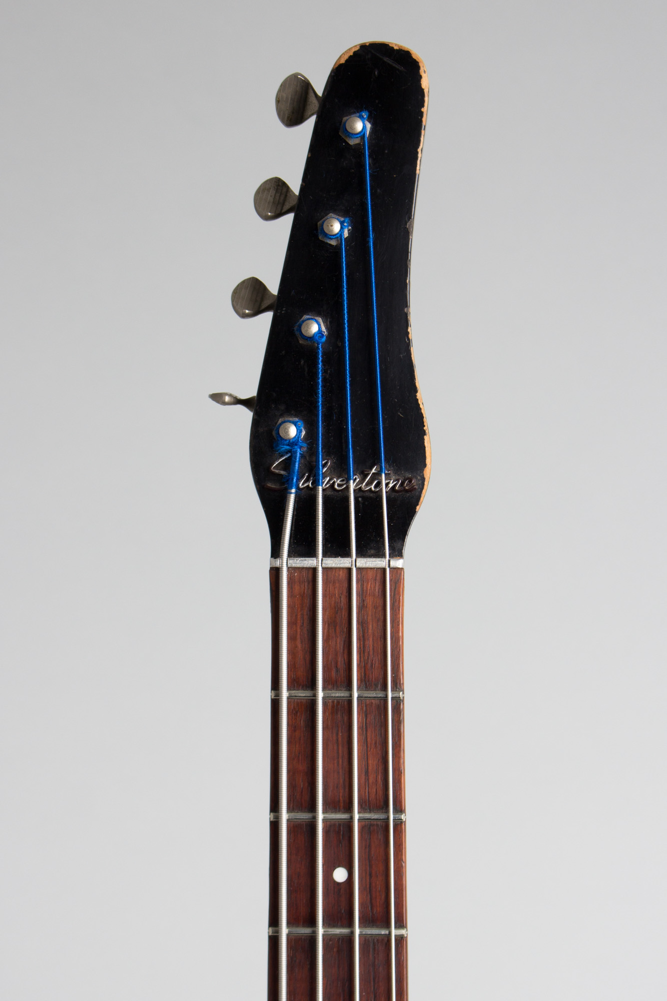 The 1960s Silvertone Model 1444 Bass, nicknamed "Dolphin Nose" for its trademark drooping minimalist headstock, was one of the most popular budget 4-strings of its era. Made by Danelectro for Sears beginning in 1959, the bass listed at $79.95 complete with a Masonite hard-shell case. This one carries pots dating to early 1965, so it was assembled right at the height of the 1960s guitar boom.
