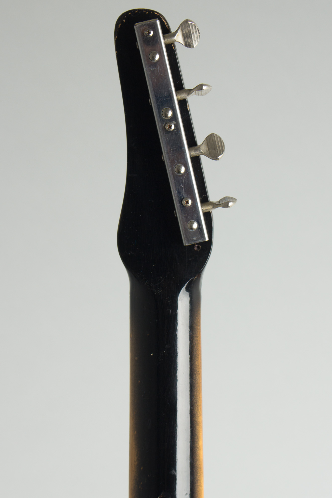 This 1444 is a little scruffy but a good player, and all original except for a few screws. Someone (not us) went to the trouble of restoring the original "Skate Key" tuners after they had once been changed to something else. There is some fairly sloppy finish patching on the headstock face around the E and A shafts, although it's not hugely distracting on a black finish. The headstock has some touch up on the tip as well, and there is a filled wear spot on the back of the neck behind the third fret. The rest of the finish shows dings, dents and scrapes, wear to the body edges and a decent sized spot of buckle wear to the back. The plastic "Silvertone" logo badge his intact but has lost a lot of its chrome plating. This is not the cleanest of these we have had, but a good "gigger" with the expected Danno sound and feel. Very Good + Condition.