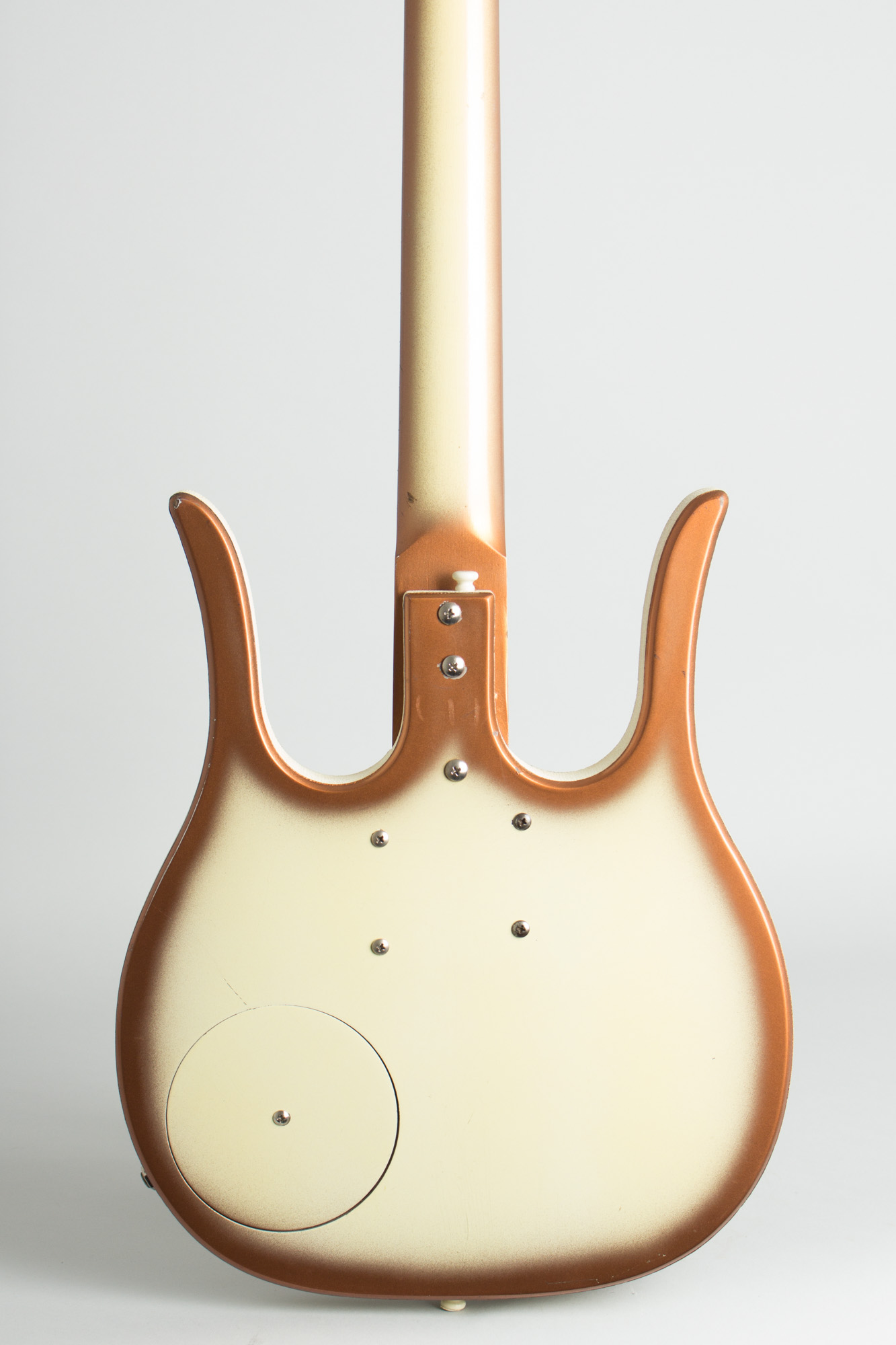 This particular bass dates to late 1958, the model's introductory year. It has distinctive features from that period, the most notable being it shares the body of the "Guitarlin" guitar with both pickups mounted down near the neck. It does not have later Danno features such as the "Totally Shielded" sticker on the headstock or "tilt-neck" adjustment screw on the back. The headstock mounts individual Kluson Deluxe tuners. The bridge is the standard Dann-O item, a metal plate adjustable for height with a sliding rosewood saddle. The unique bronze/white sunburst finish was the only color offered.