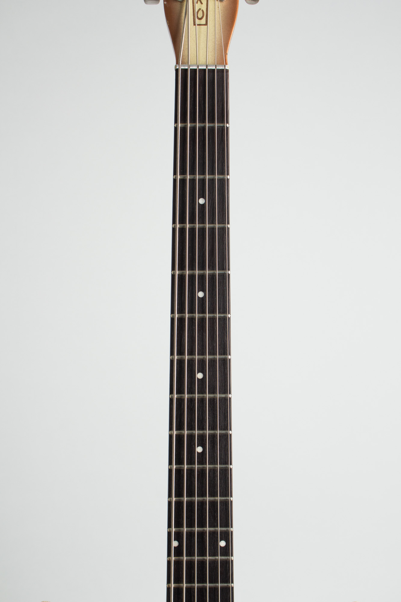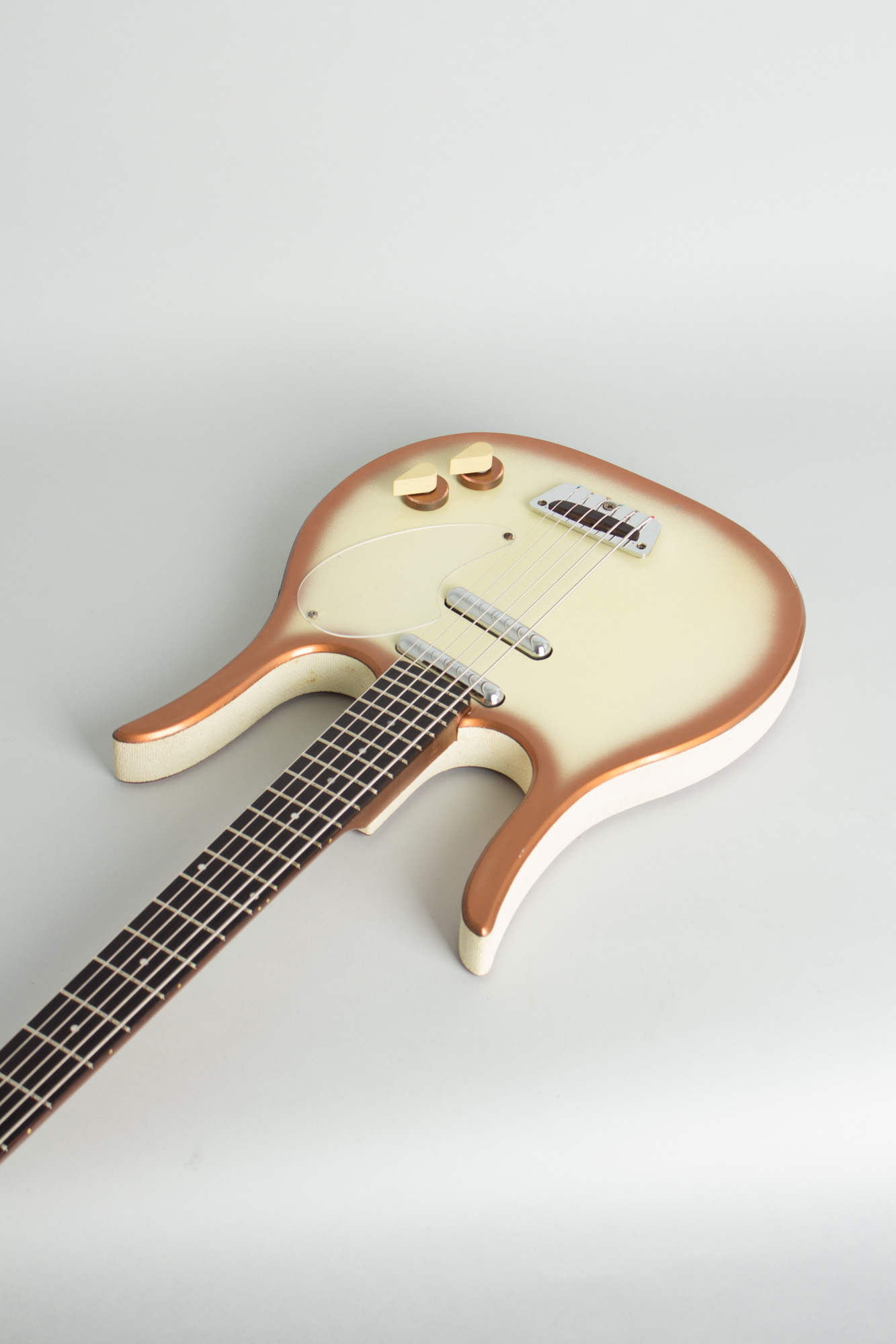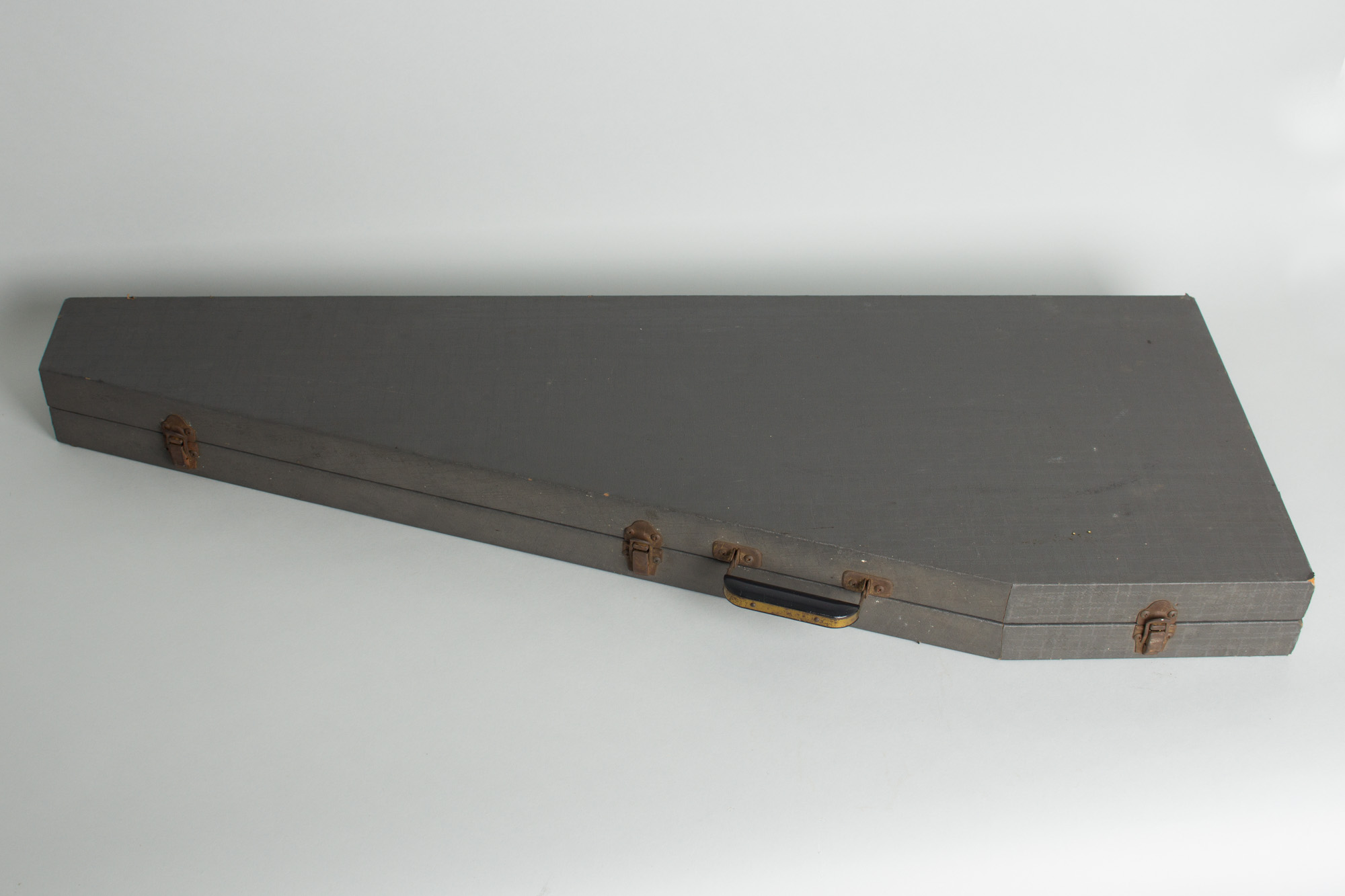 This is also a fine player with a nice straight neck. Except for the pickguard it is completely original, everything as God and Nathan Daniel intended when it left the loading dock at Neptune (New Jersey, that is). This instrument was designed as a 6-string bass (tuned E-E) and is currently strung and tuned in that style. It would also be easily adapted to the more currently fashionable B-B Baritone setup. This amazing rarity sounds fantastic in either tuning and looks wicked as all get-out doing it. As cool as they come; so sparkling in its white-bronze appliance burst it looks like a re-issue, but this is THE genuine 1960s American Masonite and poplar here. Excellent + Condition.