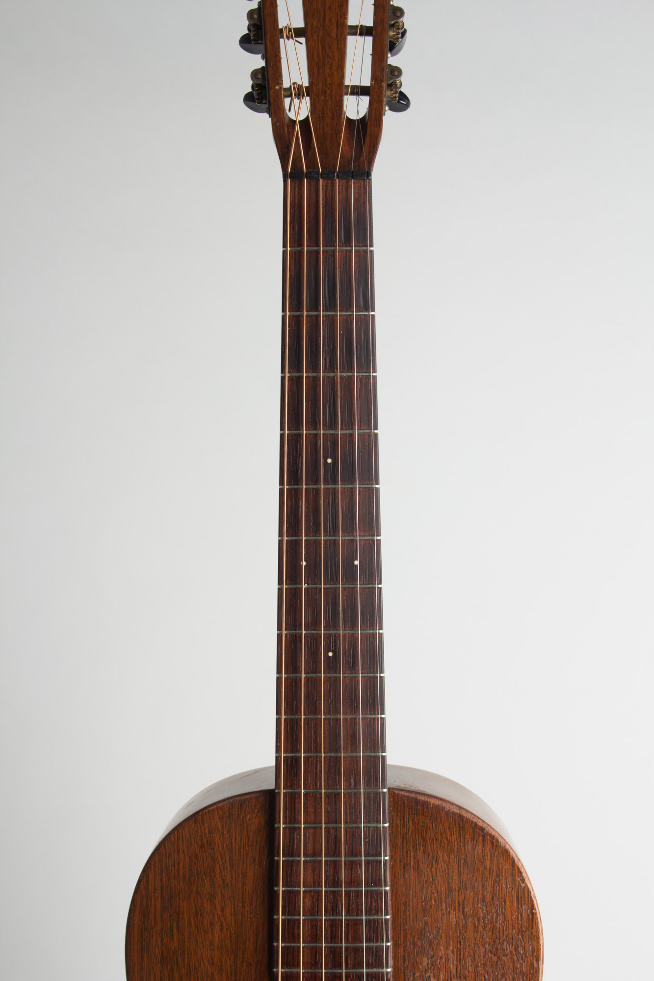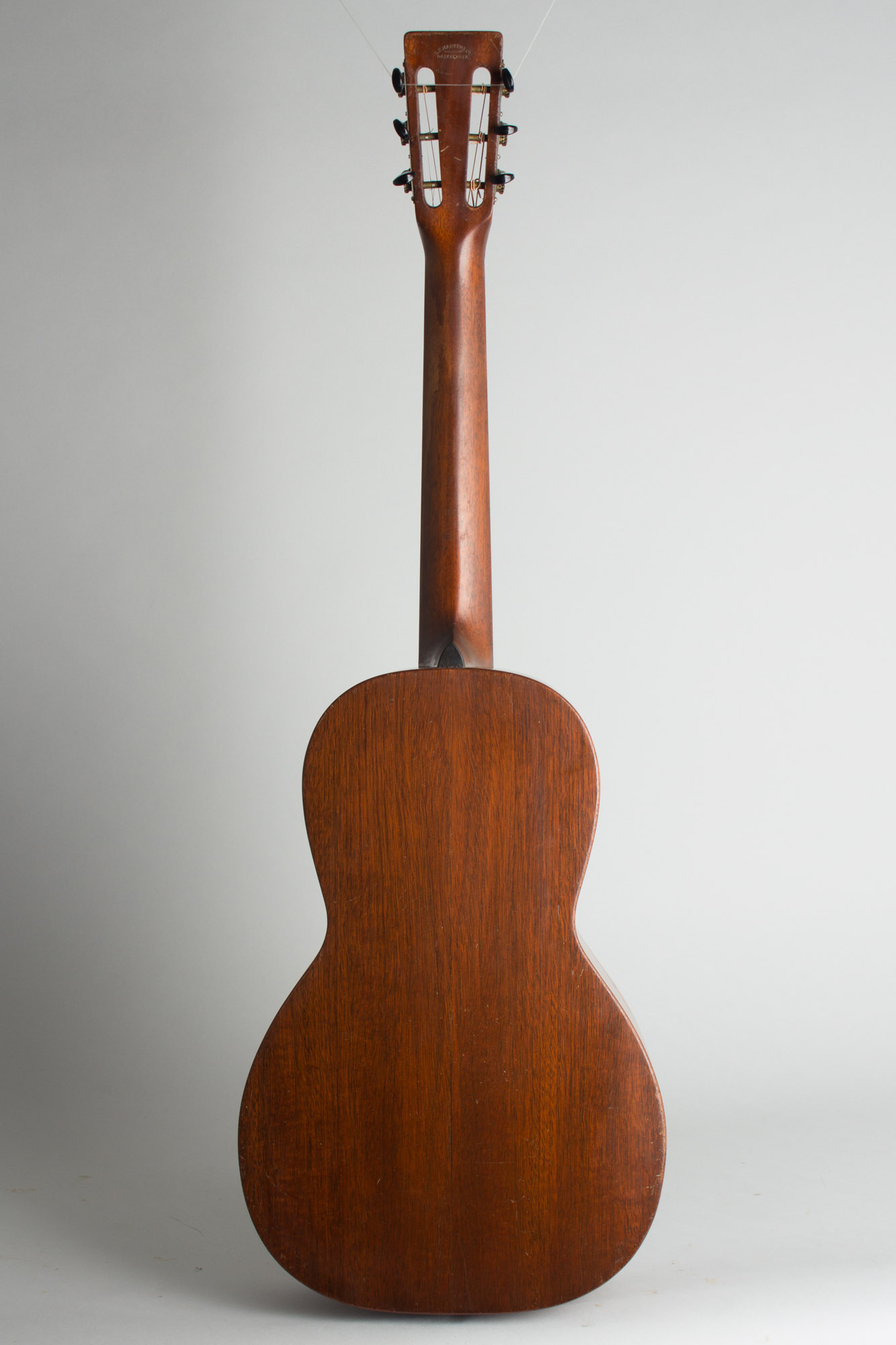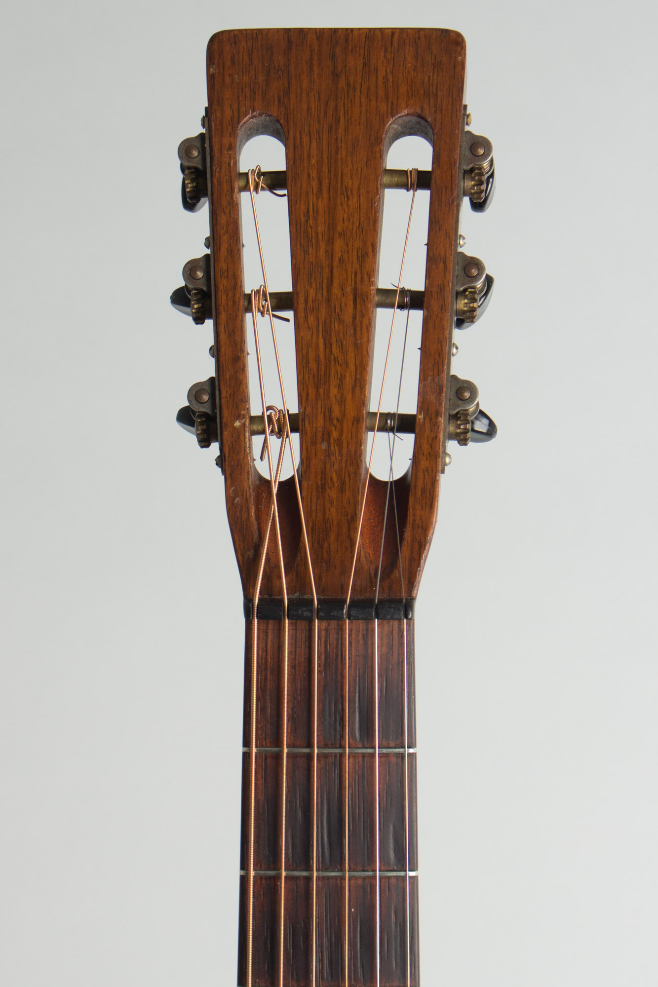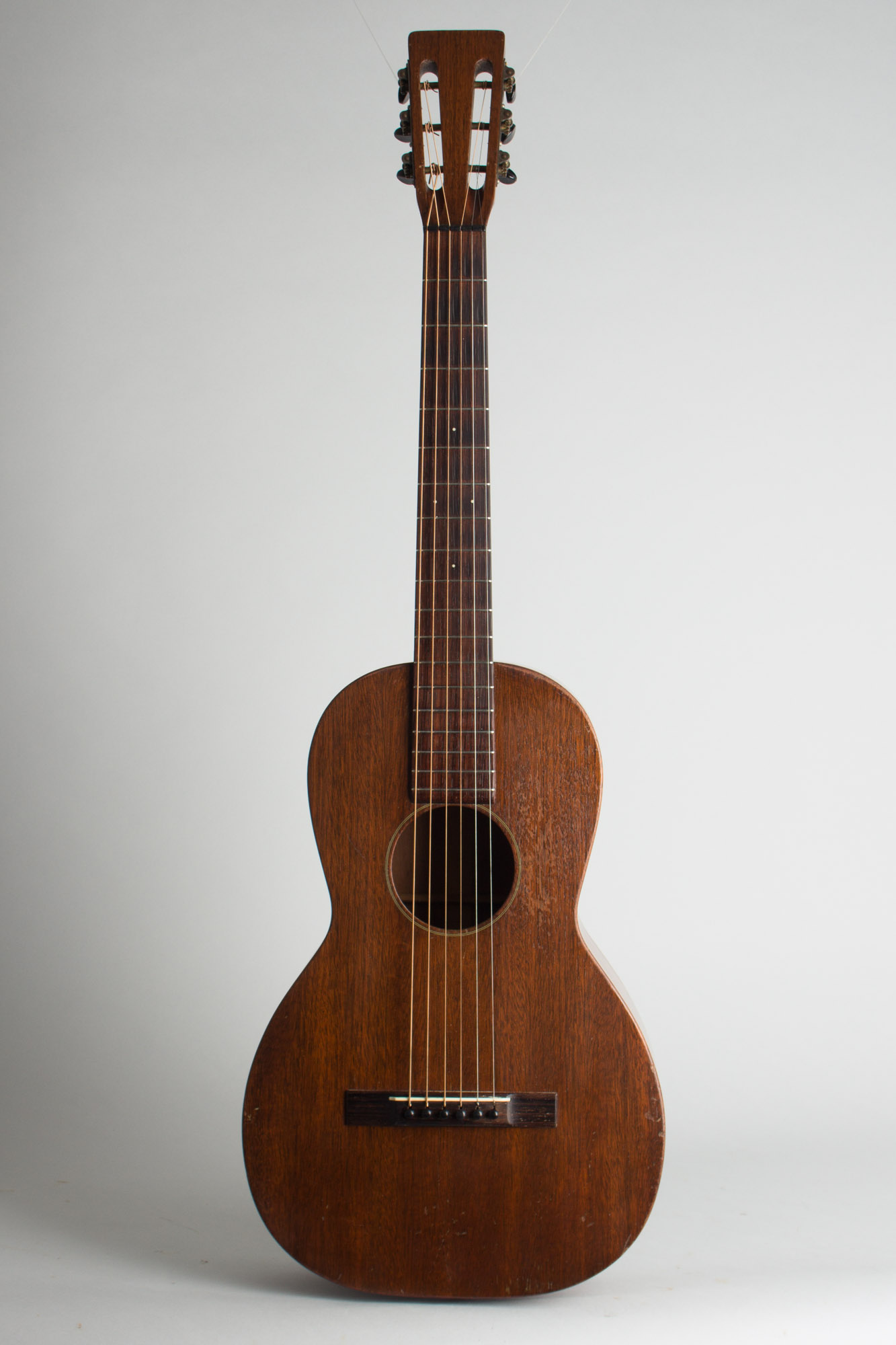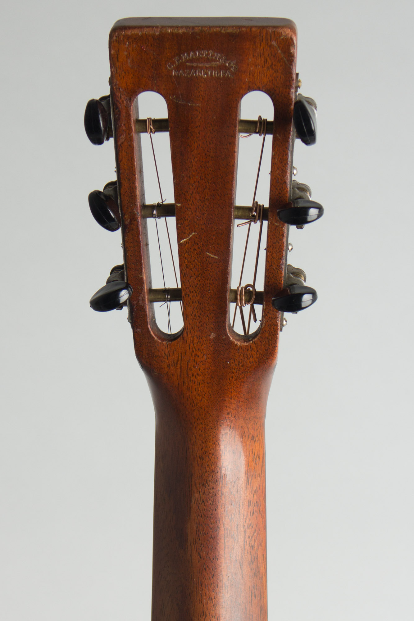 The 2-17 was very basic, with all mahogany construction and minimal appointments. At the end of 1929 -- by which time nearly all Martins came stock strung with steel -- it was made more basic still by eliminating even the discreet rosewood bindings on the edges. This allowed the guitar to be sold for $25, which was a paltry sum for a Martin, but actually still a fairly expensive guitar at the time. You could get a pearl-trimmed rosewood instrument from Sears for not too much more! The minimal appointments included a plain straight bridge and small-dot inlaid fingerboard of rosewood, all else being mahogany.