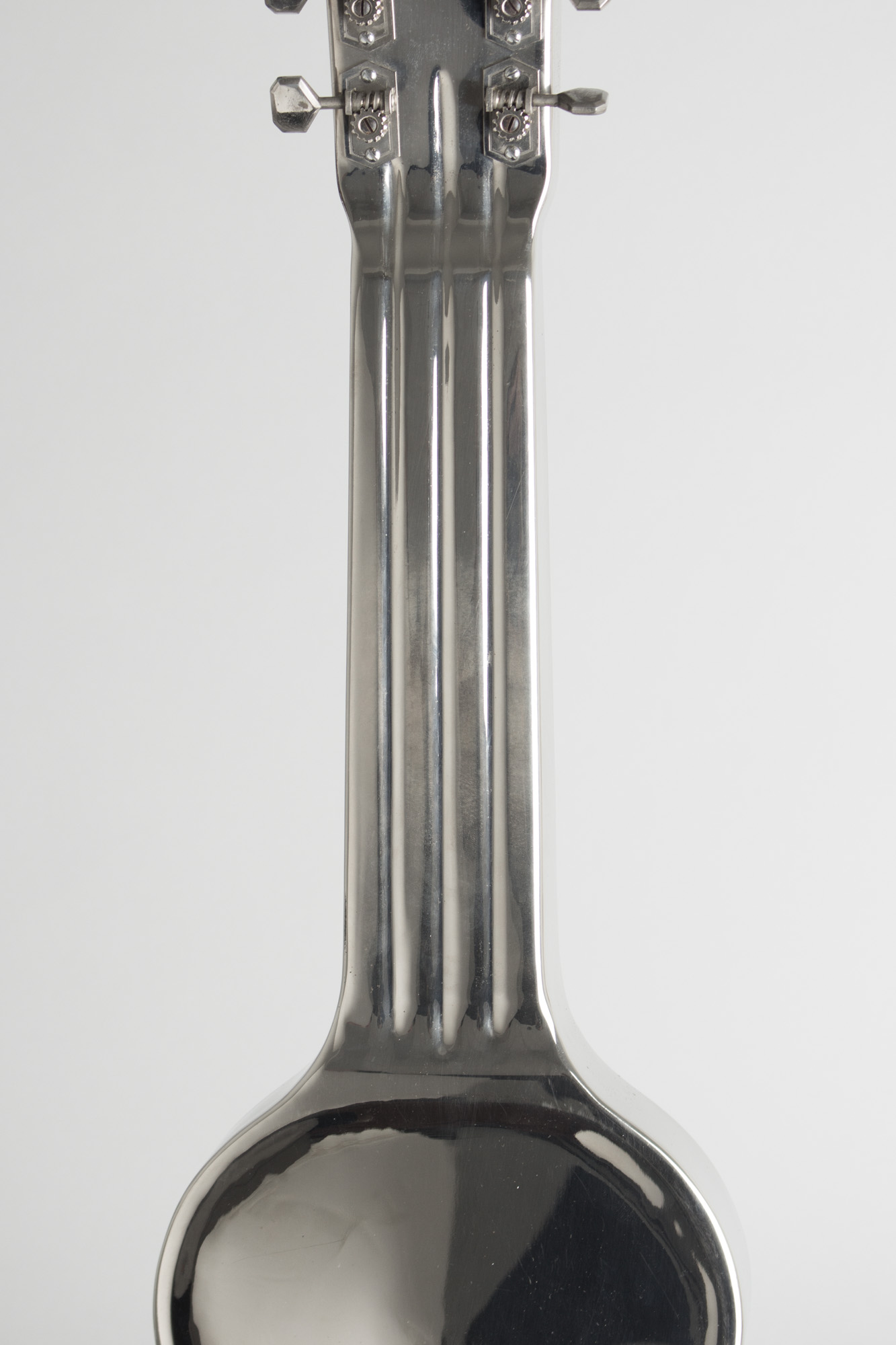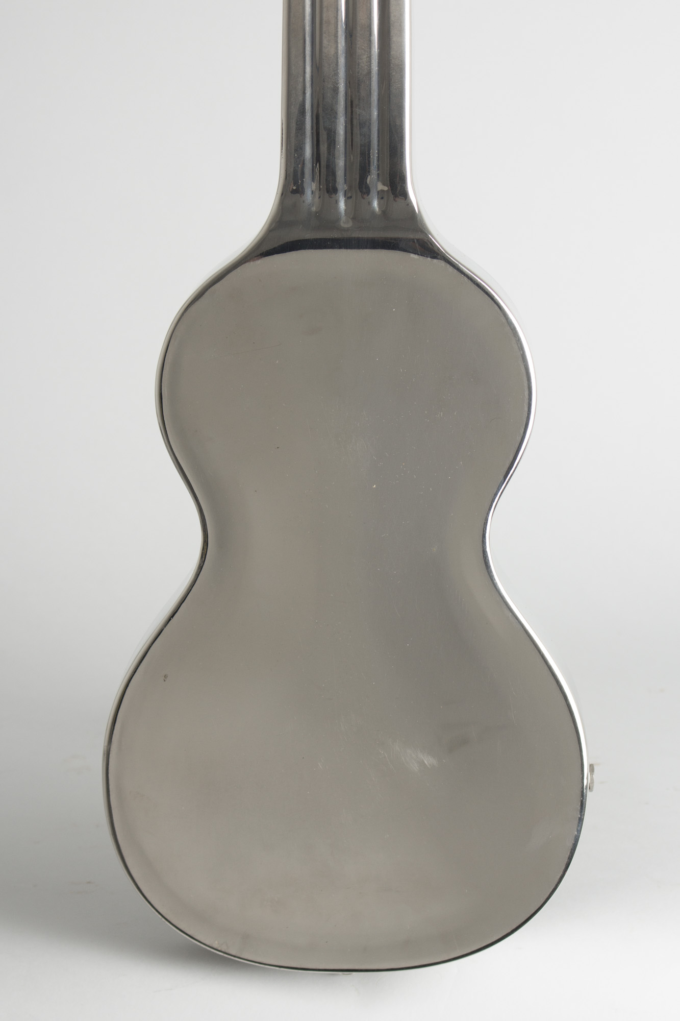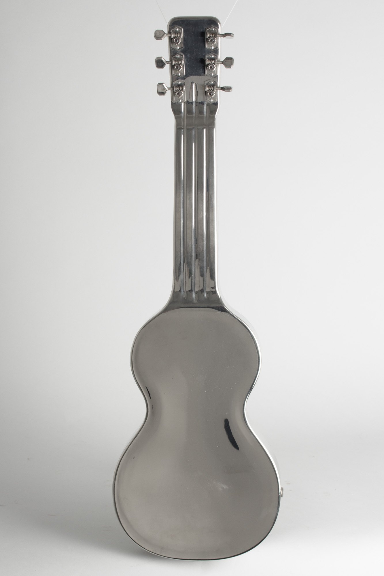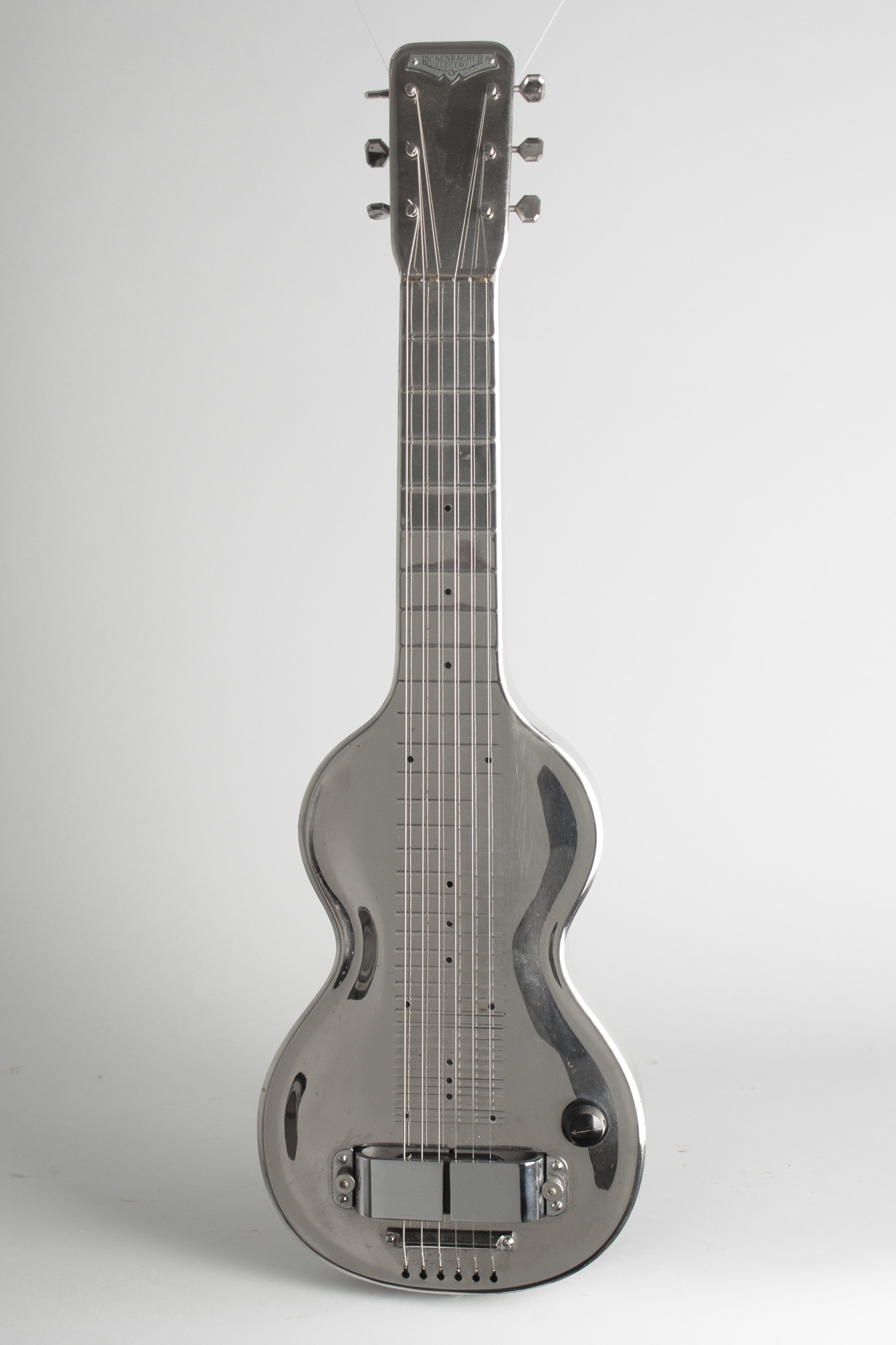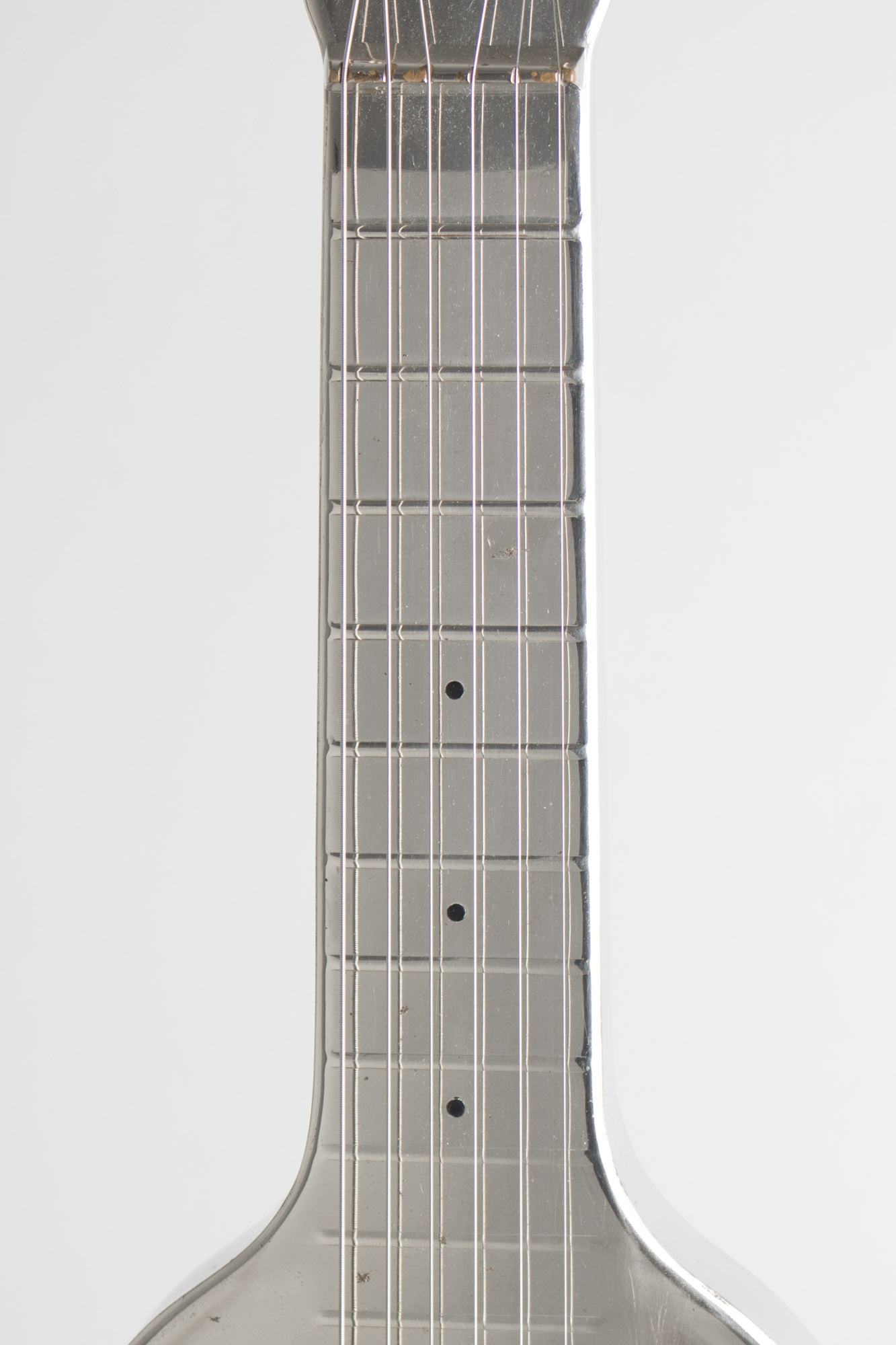 The Silver Hawaiian was the next model designed after the Bakelite Model B, coming into production about two years later in 1937. Besides being lighter the stamped metal body was less expensive to build, resulting in a retail price 30-40% cheaper. The hollow body gives a more "reverb-y" sound than the earlier solid instruments, with a slightly more acoustic character. The plated metal affords a very flashy appearance; Rickenbacker's original description states "...delights the eye with its flashing beauty", and indeed this is a most striking-looking and fine-sounding prewar steel.