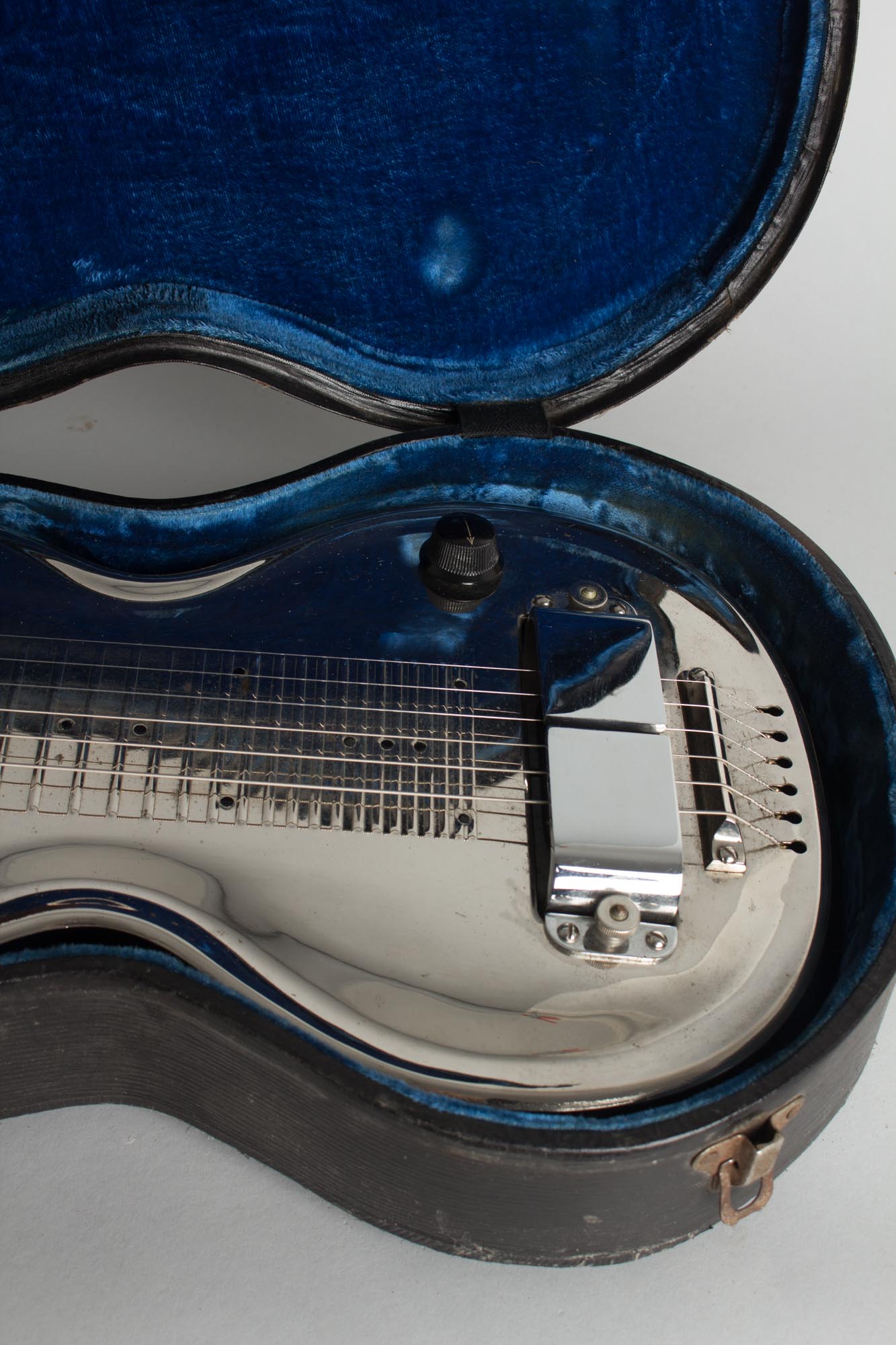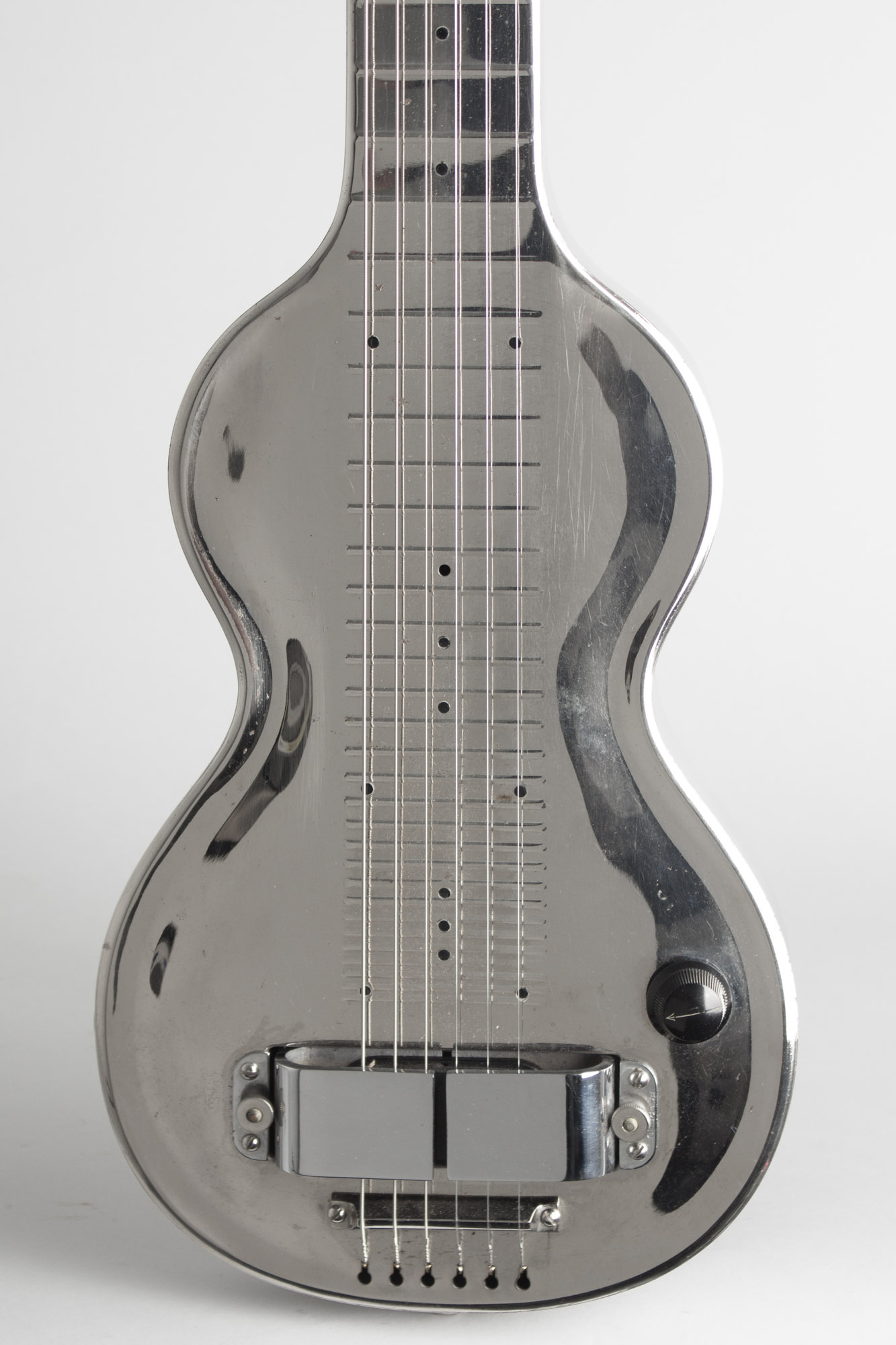 This is a very nice and fairly early example of the Rickenbacker Silver Hawaiian Steel Guitar, one of the company's most striking 1930s classics. The entire instrument is nickel-plated metal, with a stamped metal hollow body making it much lighter than the earlier Bakelite guitars. The 1 1/2" pre-war horseshoe pickup's mounting flange is marked "Pat. Pend" as in mid-1937 the long-awaited patent was not yet approved; it finally came through in August that year!