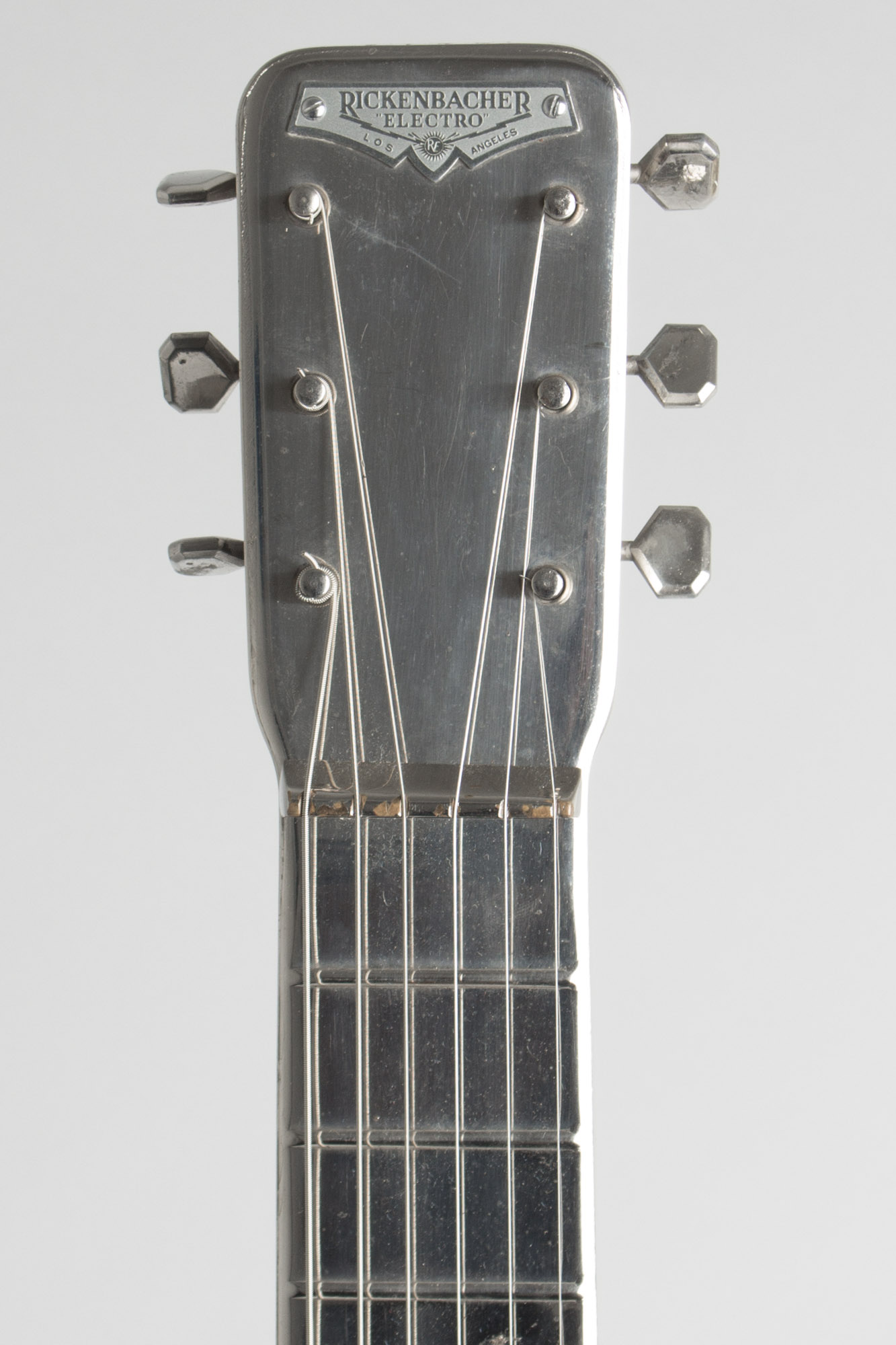 This guitar's serial number D-213 marks it as one of the first couple of hundred Silver Hawaiians built in early/mid 1937. It has a single volume control on the bass side with the original arrow-top black Bakelite knob; the next year a tone control was added as well. It also has the early style solid plated brass bridge and nut; later examples substituted molded plastic for these which knocked a bit of top-end brilliance off the tone. The metal headstock logo plate reads "Rickenbacher Electro" Los Angeles with lightning bolts surrounding an "RE" emblem.