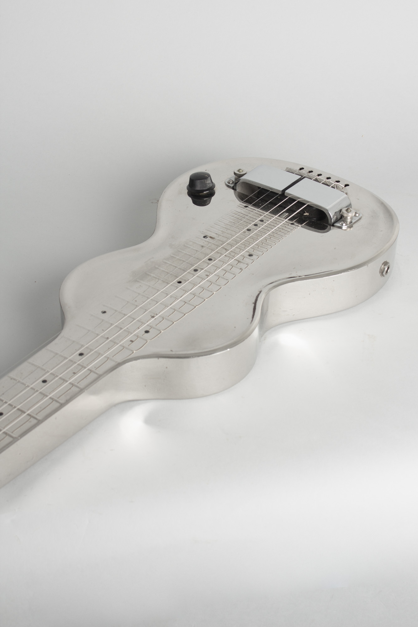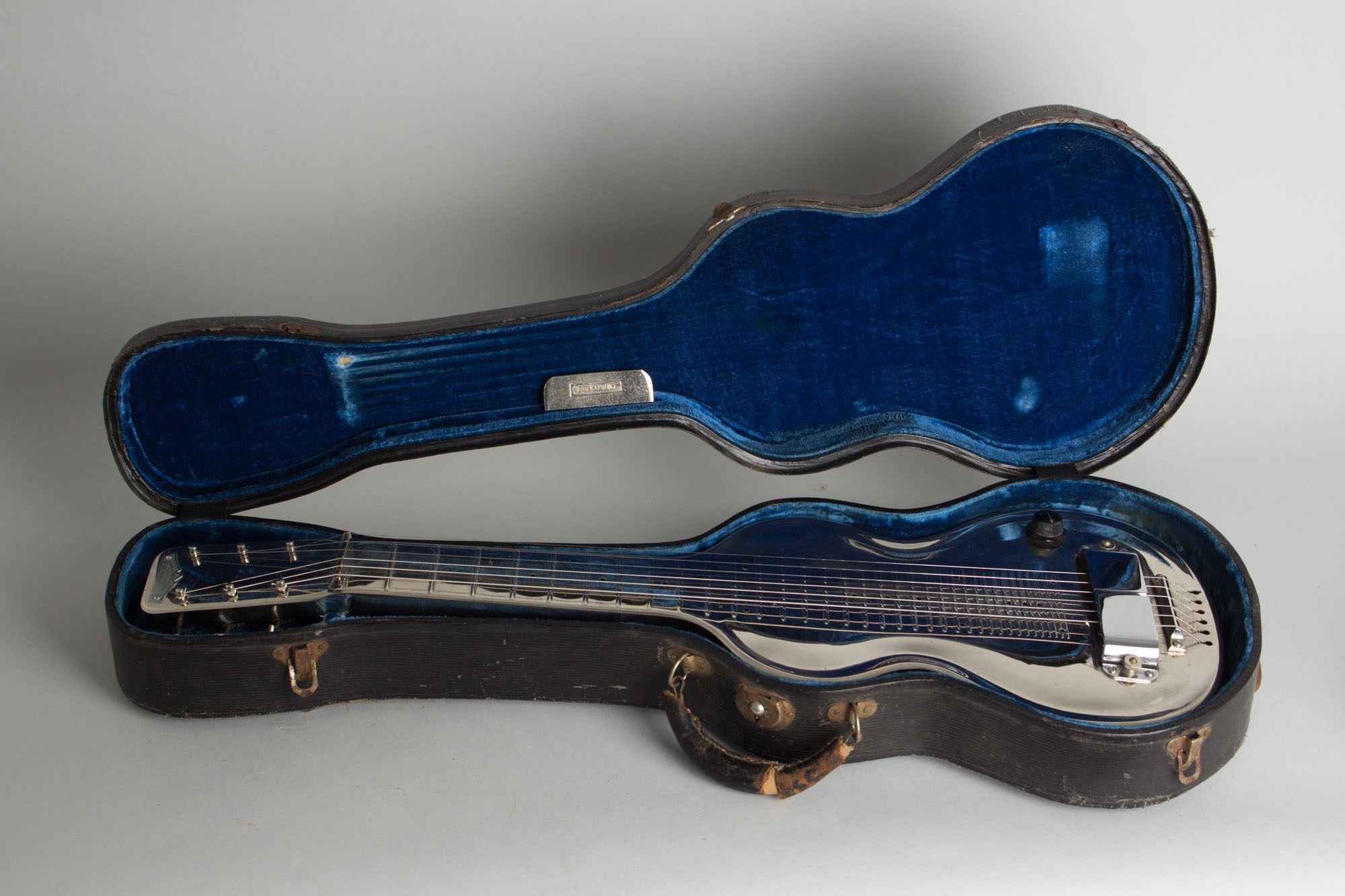 Rickenbacker Silver Hawaiian Model Lap Steel Electric Guitar (1937), made in Los Angeles, serial # D-213, nickel plated finish, stamped metal body, original black hard shell case.