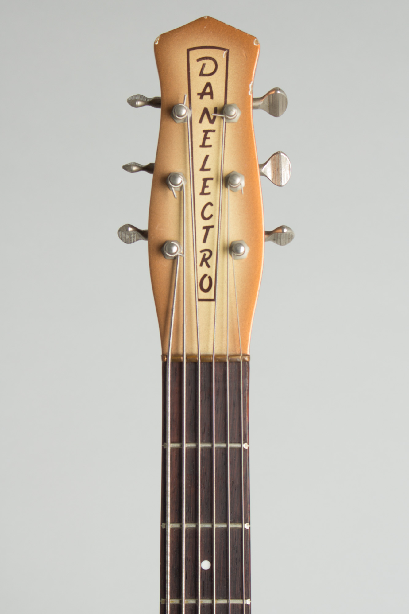 Danelectro Longhorn Model 4623 Model Electric 6-String Bass Guitar, c. 1967, made in Neptune, NJ, bronze lacquer finish, masonite and pine body, poplar neck with rosewood fingerboard, tweed hard shell case.