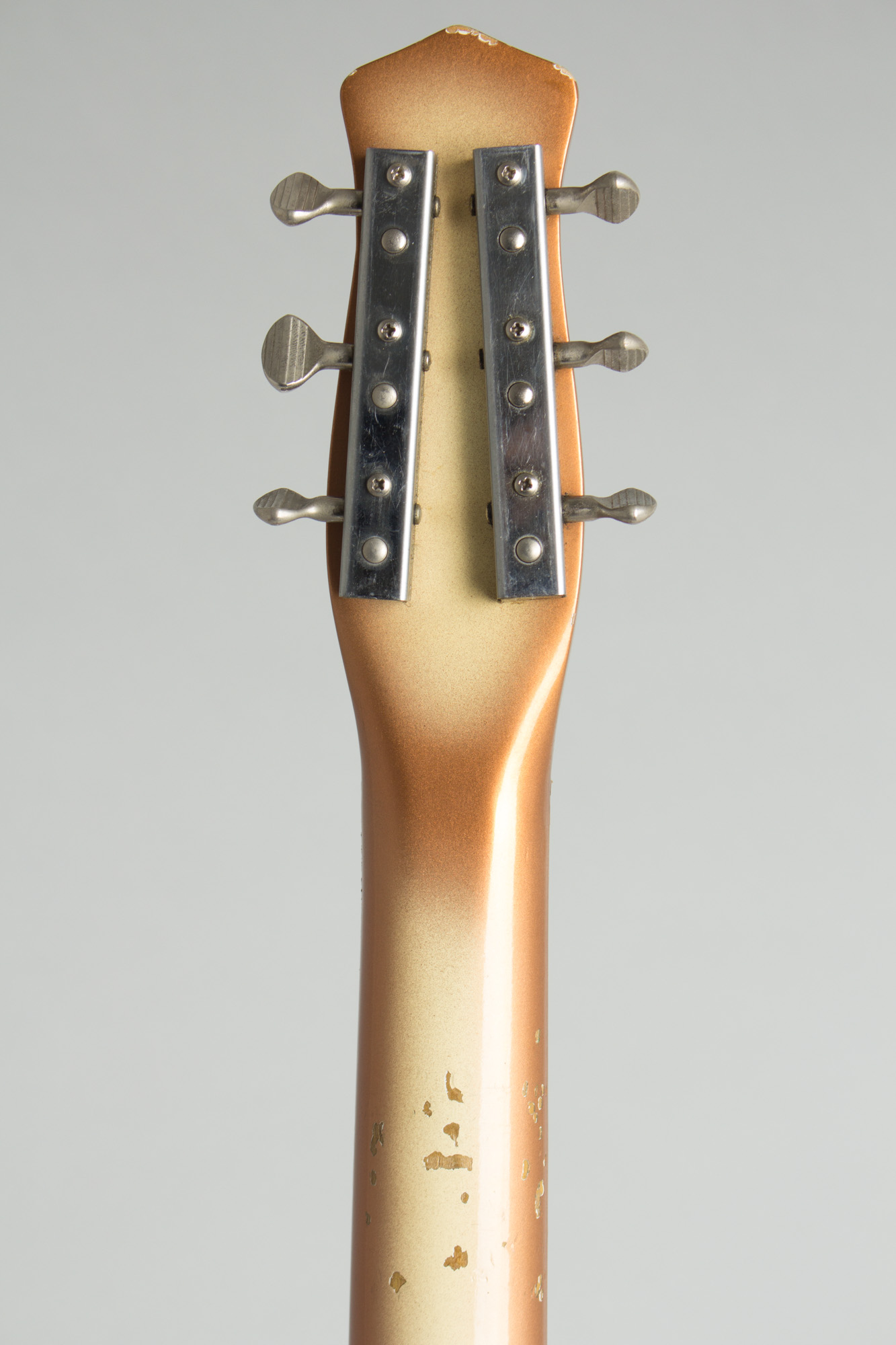 This is also a very fine player with a near-perfect neck. It remains completely original, as God and Nathan Daniel intended when it left the loading dock at Neptune (New Jersey, that is). This instrument was designed and is currently strung as a 6-string bass (tuned E-E) but can also be easily strung and tuned for the more currently fashionable B-B or A-A Baritone setup. This striking rarity sounds fantastic in either tuning and looks wicked as all get-out doing it. Simply as cool as they come; so sparkling in its white-bronze appliance burst it looks on first glance like a re-issue. This is THE genuine 1960s American Masonite and poplar here, a proud product of Nathan Daniels' offbeat genius. Excellent Condition.